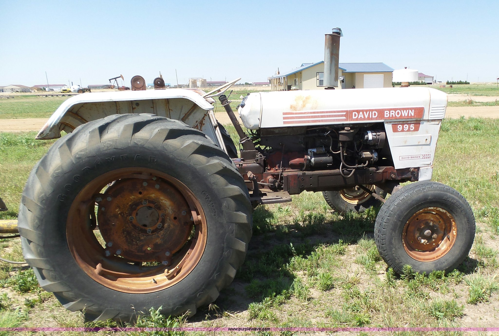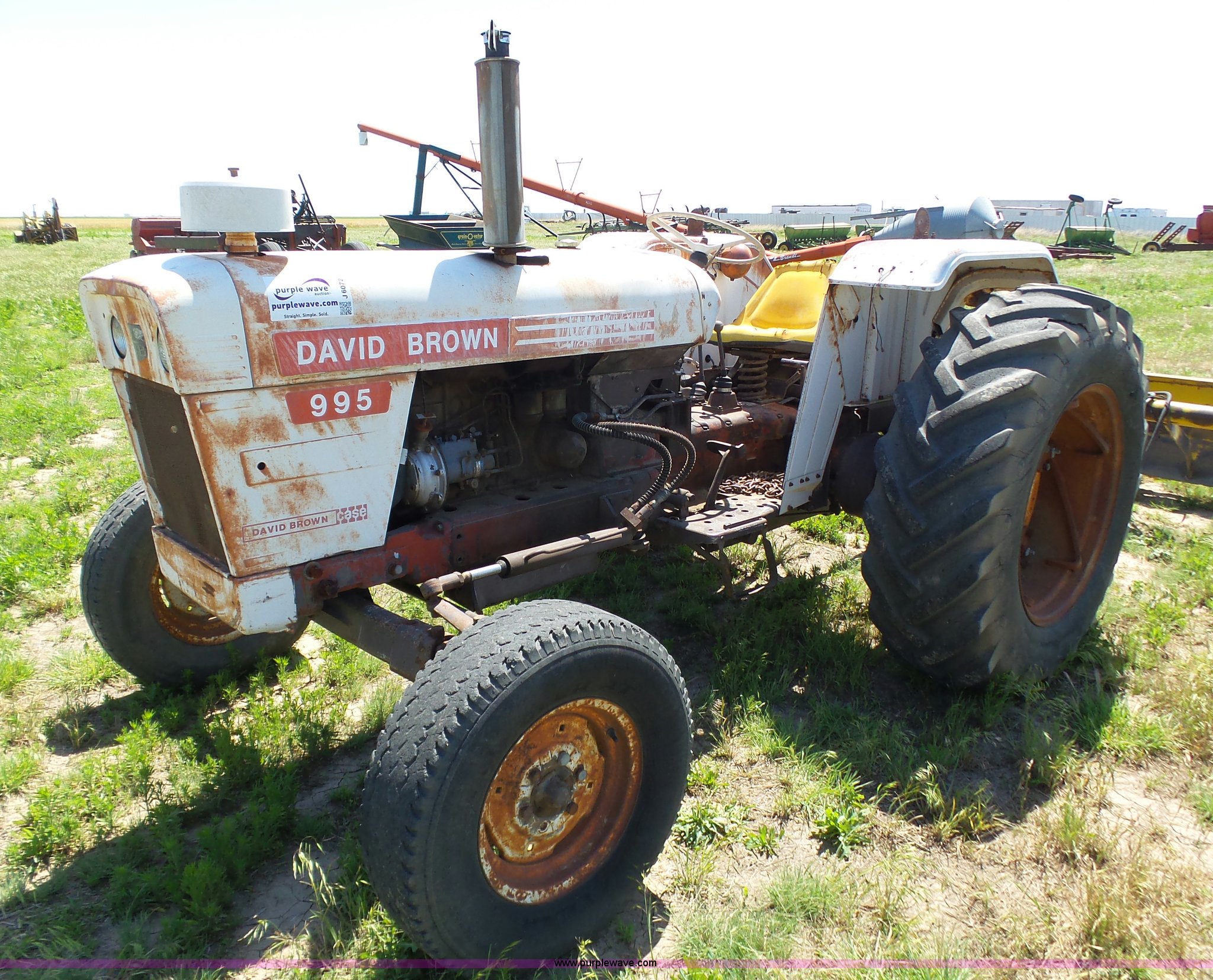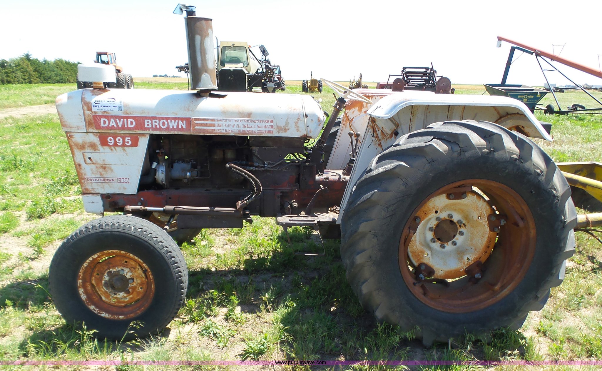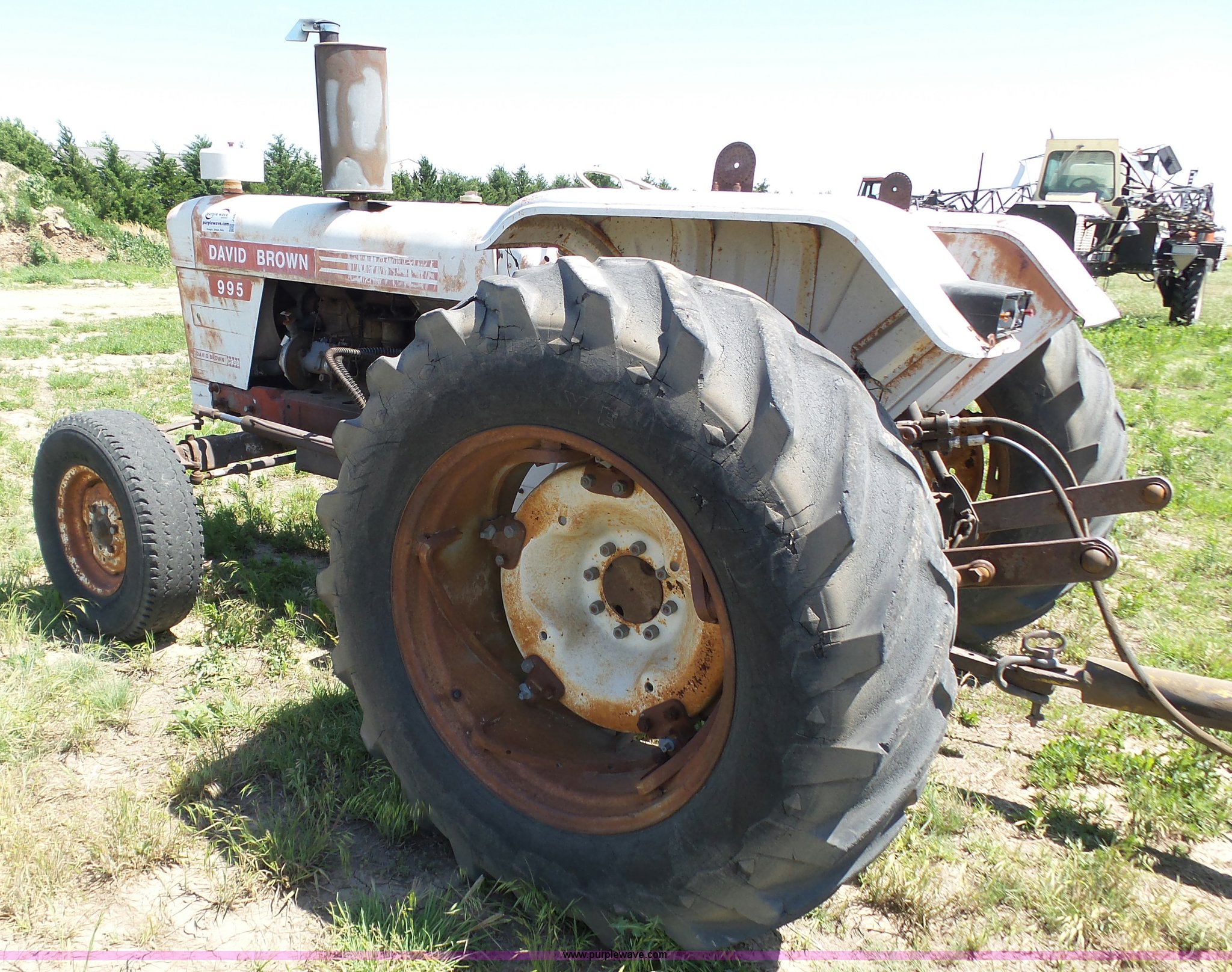 Purple Wave is selling a used Tractor in Kansas. This item is a David Brown 995 tractor with the following: 4,460 hours on meter, Hours may vary, still in use, Four cylinder diesel engine, Serial 45507152761, Manual transmission, Suspension seat, Three point, 1000 PTO, Rear hydraulic remote sets, 82" wheelbase, ST235/85R16 front tires, 16.9-1430 rear tires, Truck blade not included, Serial 99516982739