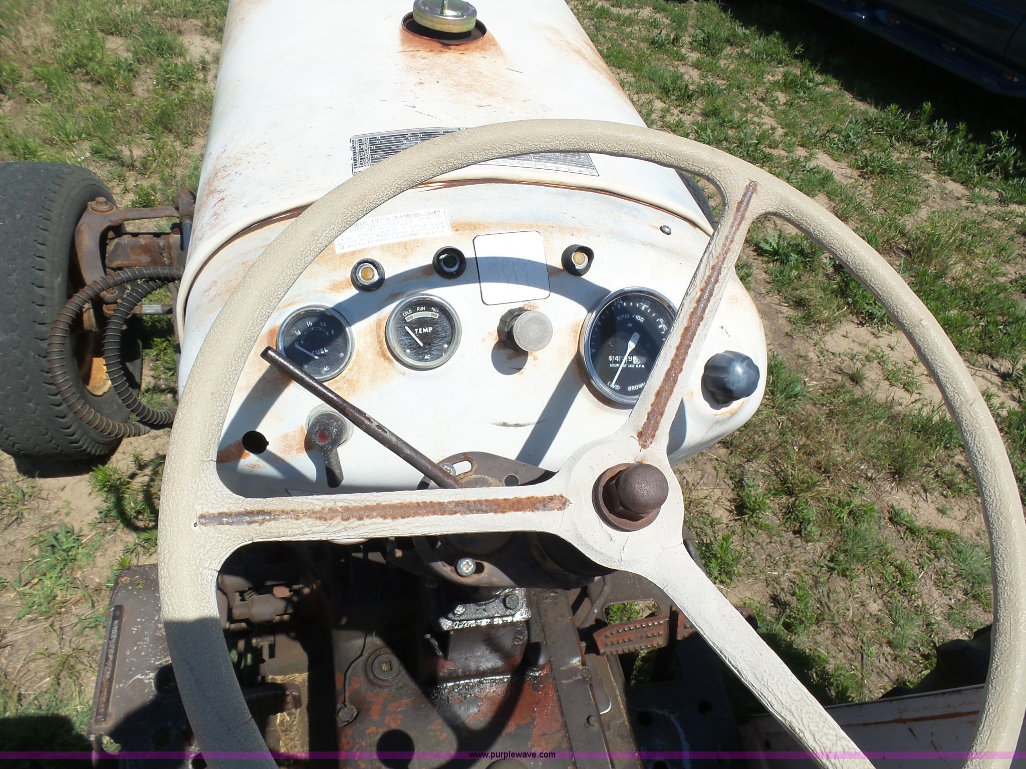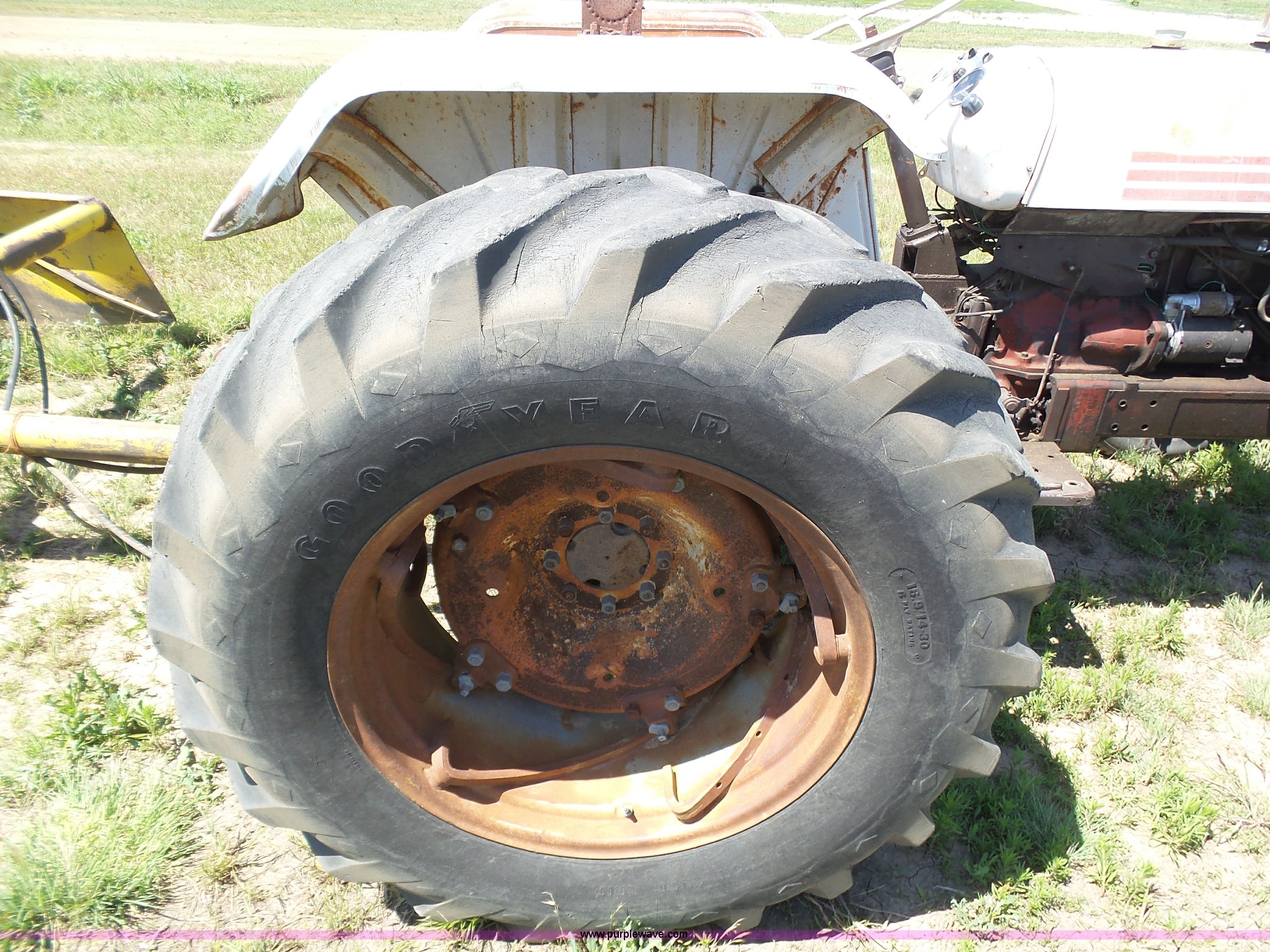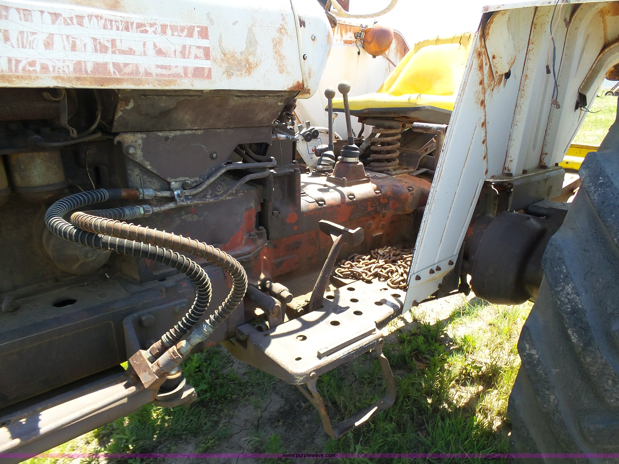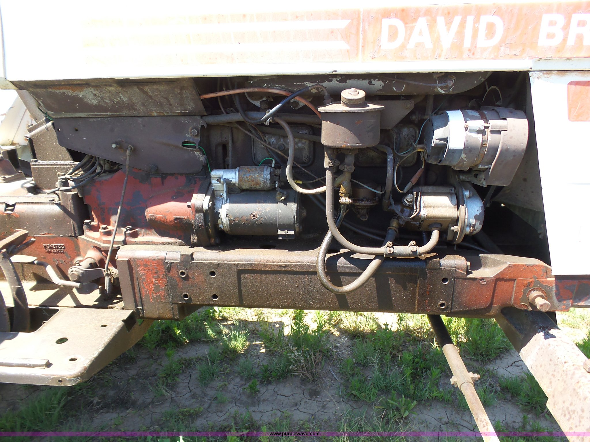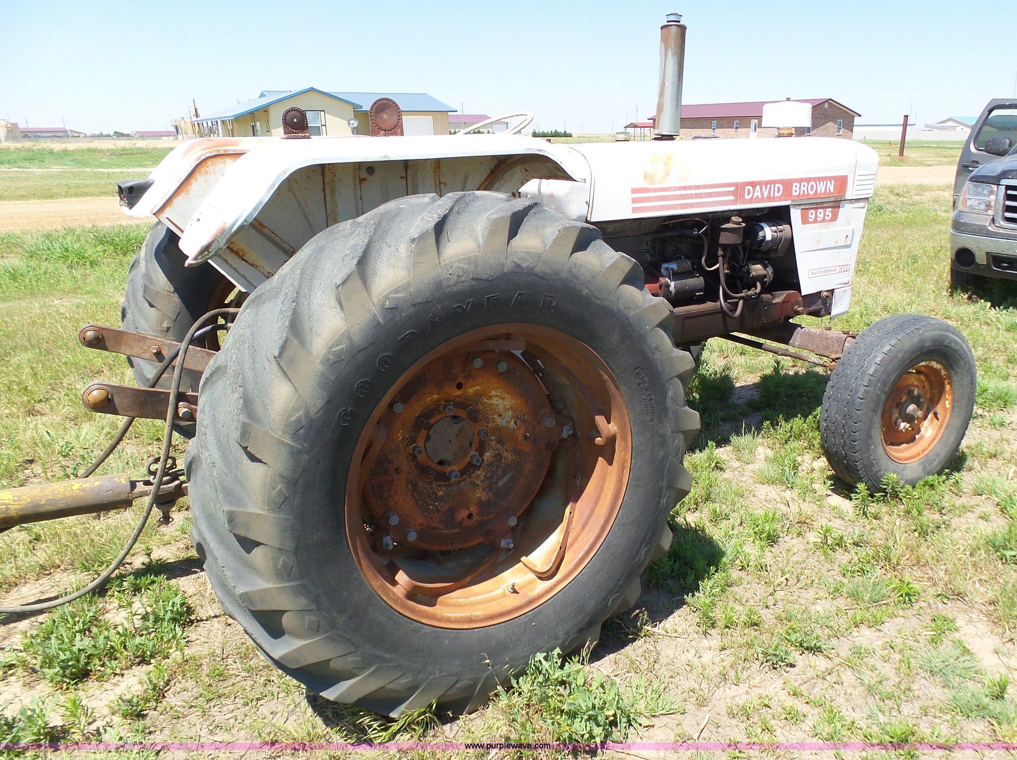 Purple Wave is selling a used Tractor in Kansas. This item is a David Brown 995 tractor with the following: 4,460 hours on meter, Hours may vary, still in use, Four cylinder diesel engine, Serial 45507152761, Manual transmission, Suspension seat, Three point, 1000 PTO, Rear hydraulic remote sets, 82" wheelbase, ST235/85R16 front tires, 16.9-1430 rear tires, Truck blade not included, Serial 99516982739