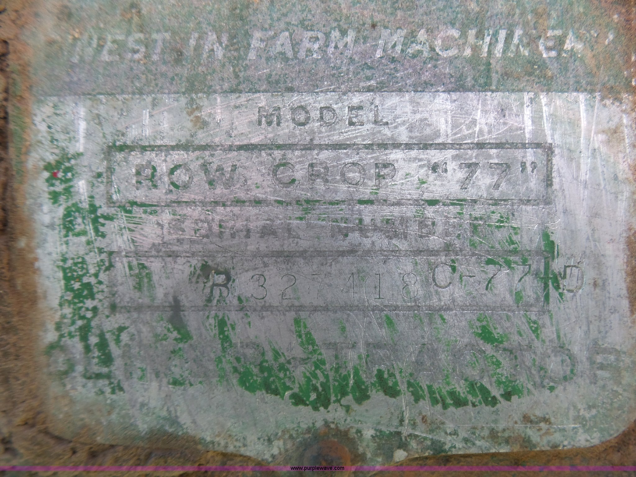 Purple Wave is selling a used Tractor in Kansas. This item is a Oliver 77 row crop tractor with the following: Six cylinder gas engine, Manual transmission, 6F-2R gears, Suspension seat, 540 PTO, Tool carriage under belly, 97" wheelbase, 6.50-16 front tires, 14.9-38 rear tires, Cosmetic damage, Weld repairs, Unknown operating condition, Serial B327418