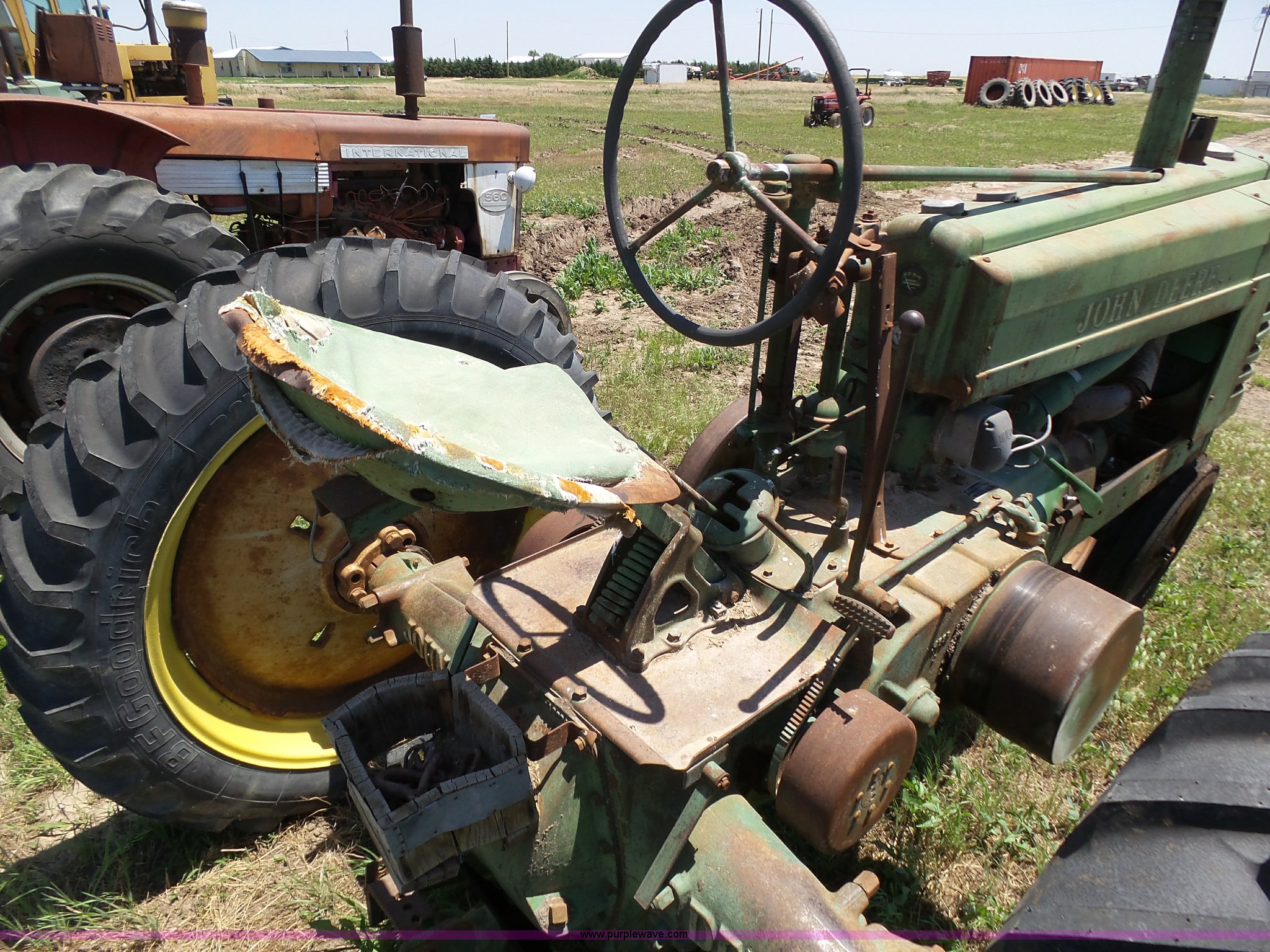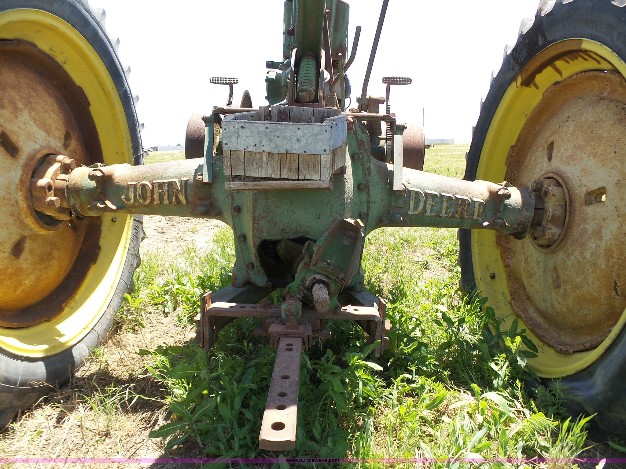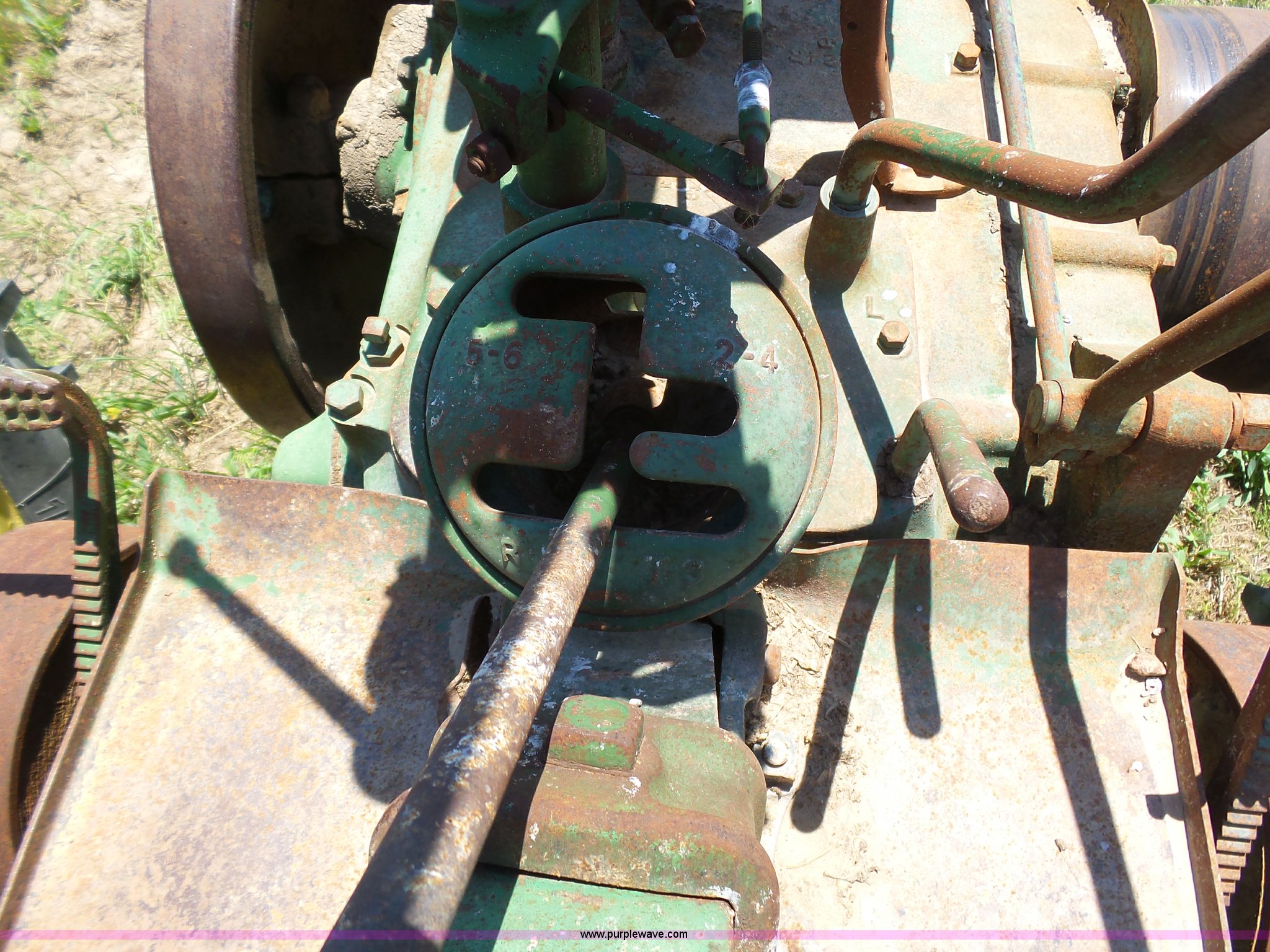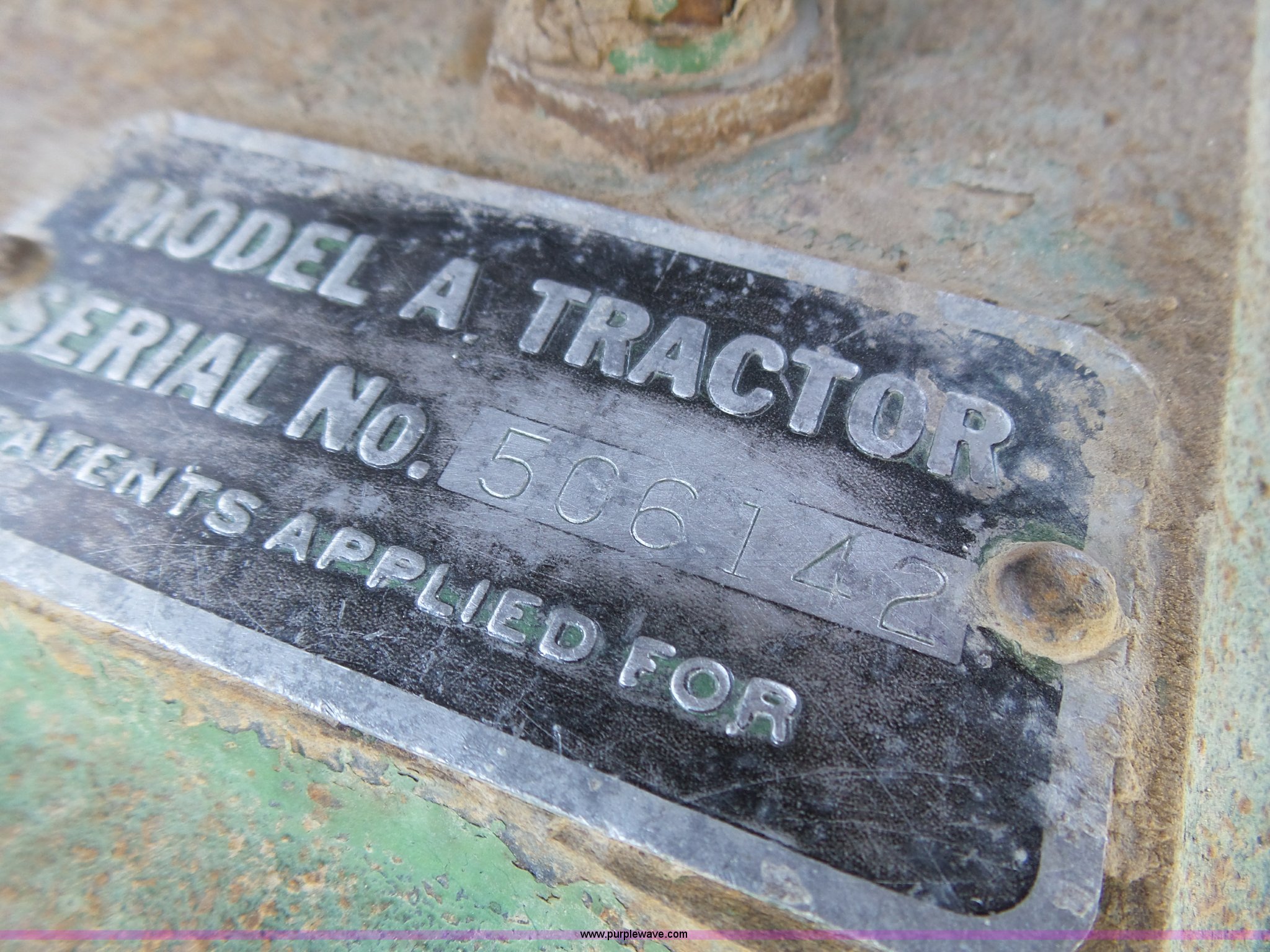 Purple Wave is selling a used Tractor in Kansas. This item is a John Deere A tractor with the following: Two cylinder gas engine, Manual transmission, 6F-1R gears, Suspension seat, 540 PTO, 92" wheelbase, 5.50-16 front tires, 11.2-38 rear tires, Interior/exterior cosmetic damage, Rear PTO housing broken, Flat tire, Unknown operating condition, Serial 506142