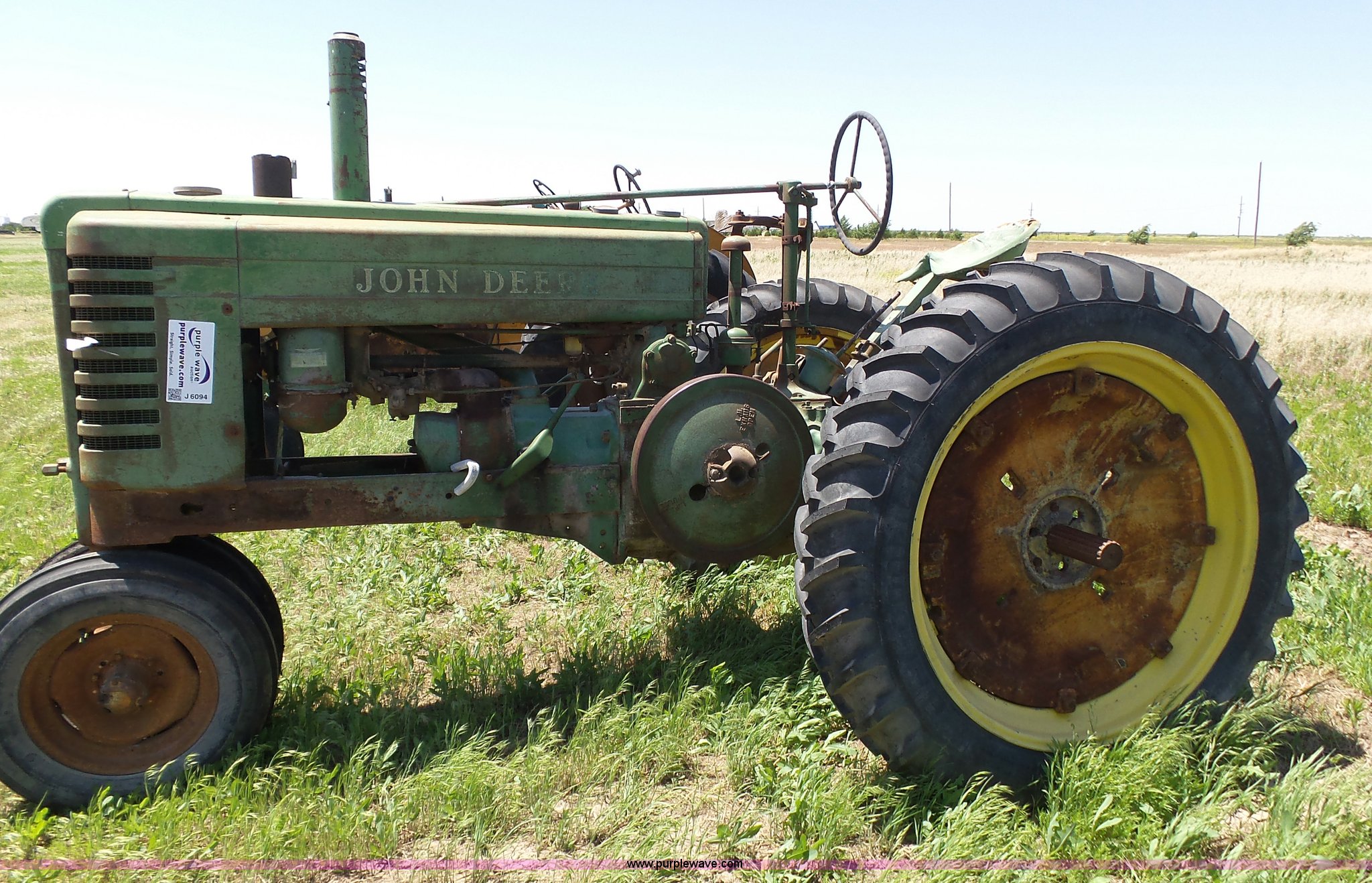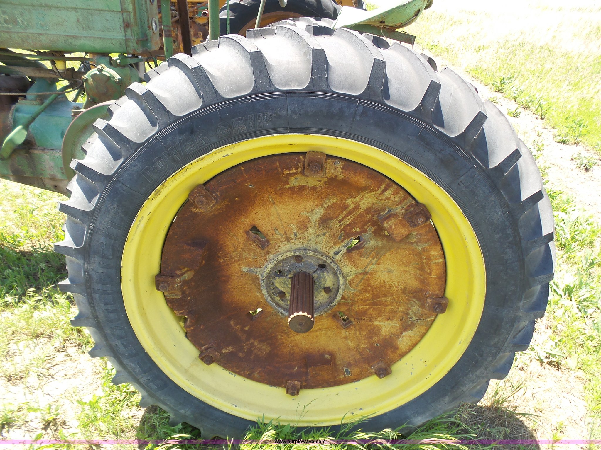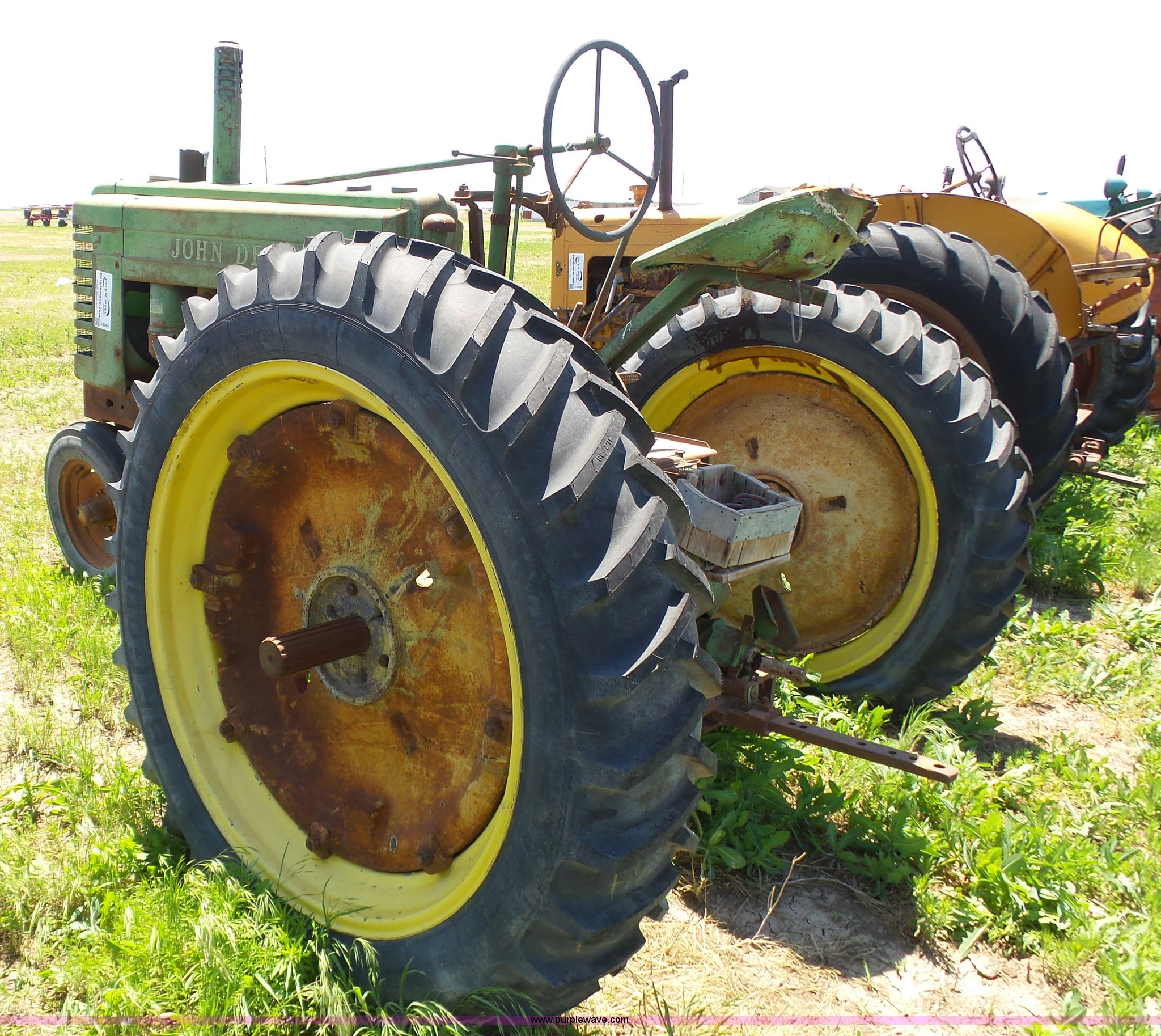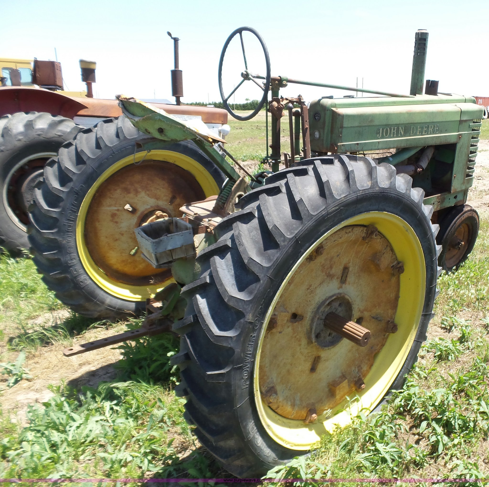 Purple Wave is selling a used Tractor in Kansas. This item is a John Deere A tractor with the following: Two cylinder gas engine, Manual transmission, 6F-1R gears, Suspension seat, 540 PTO, 92" wheelbase, 5.50-16 front tires, 11.2-38 rear tires, Interior/exterior cosmetic damage, Rear PTO housing broken, Flat tire, Unknown operating condition, Serial 506142