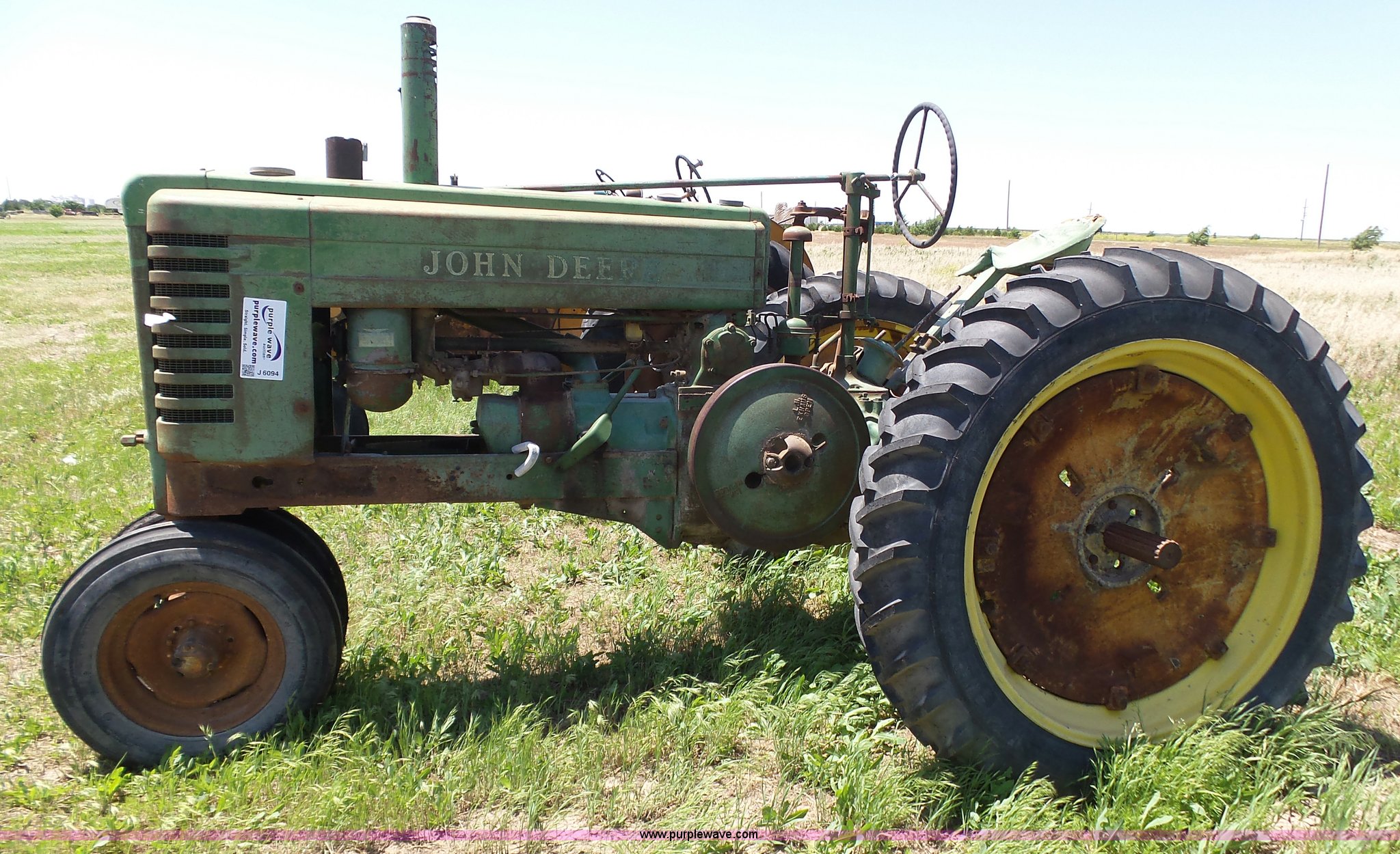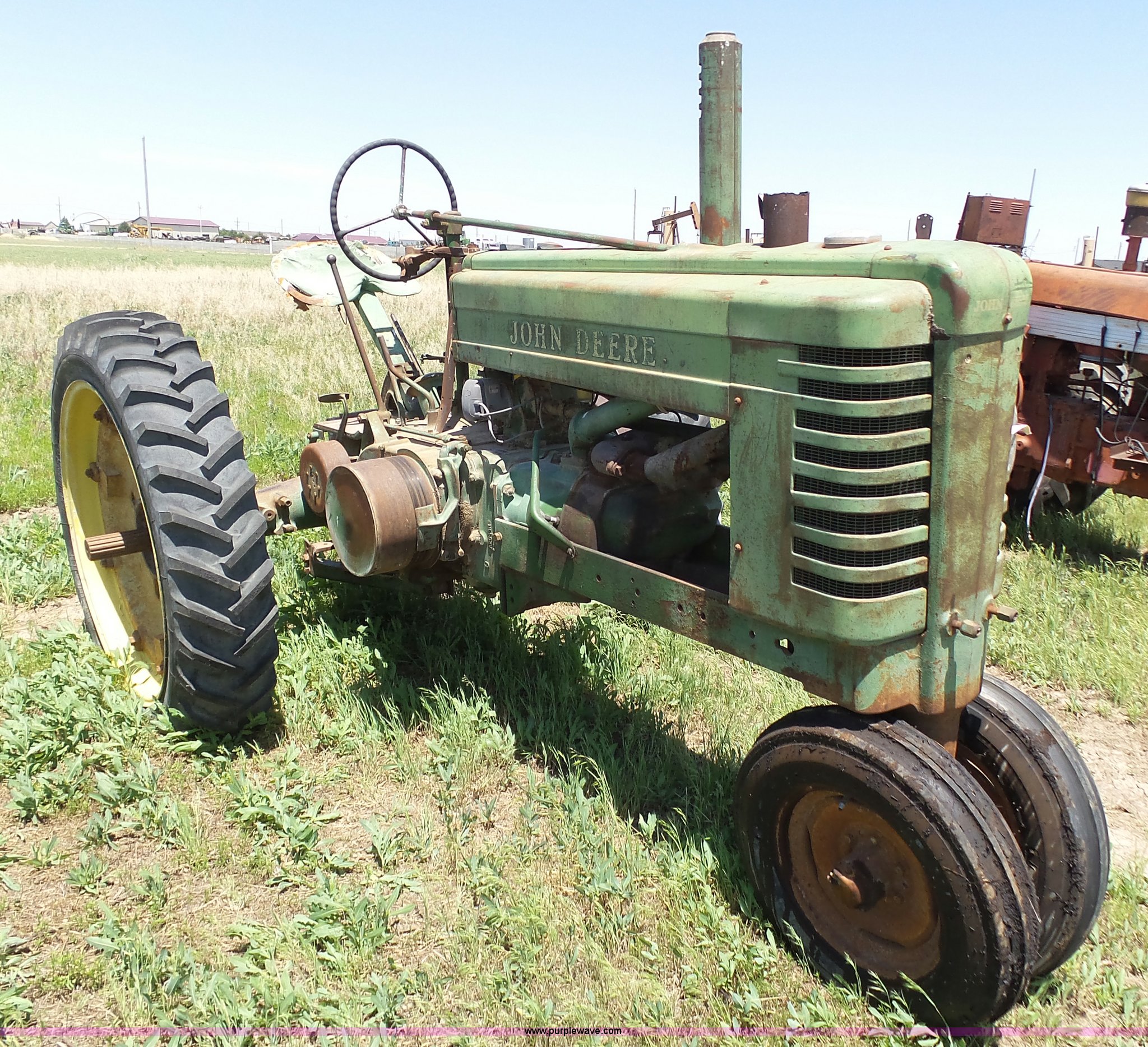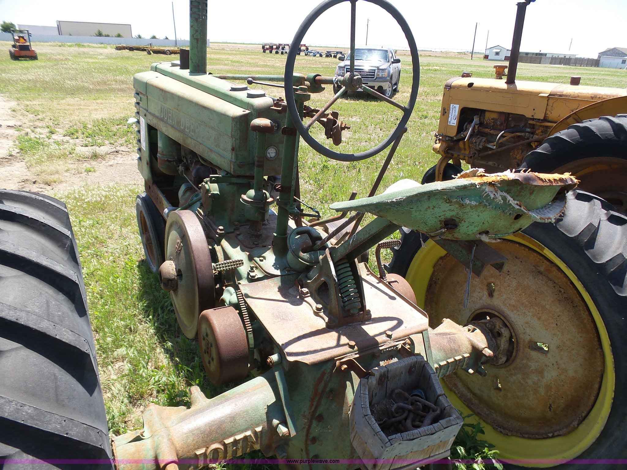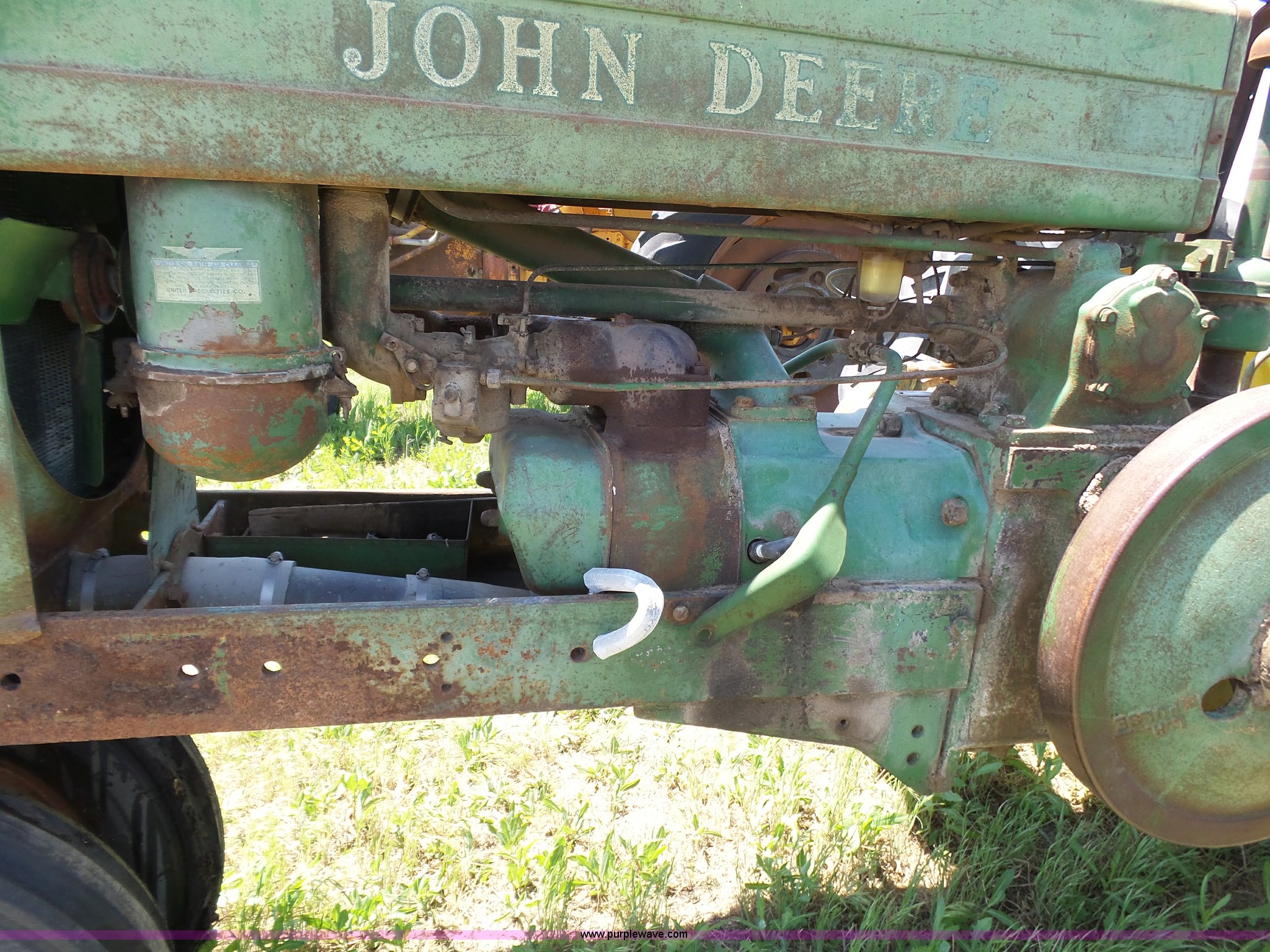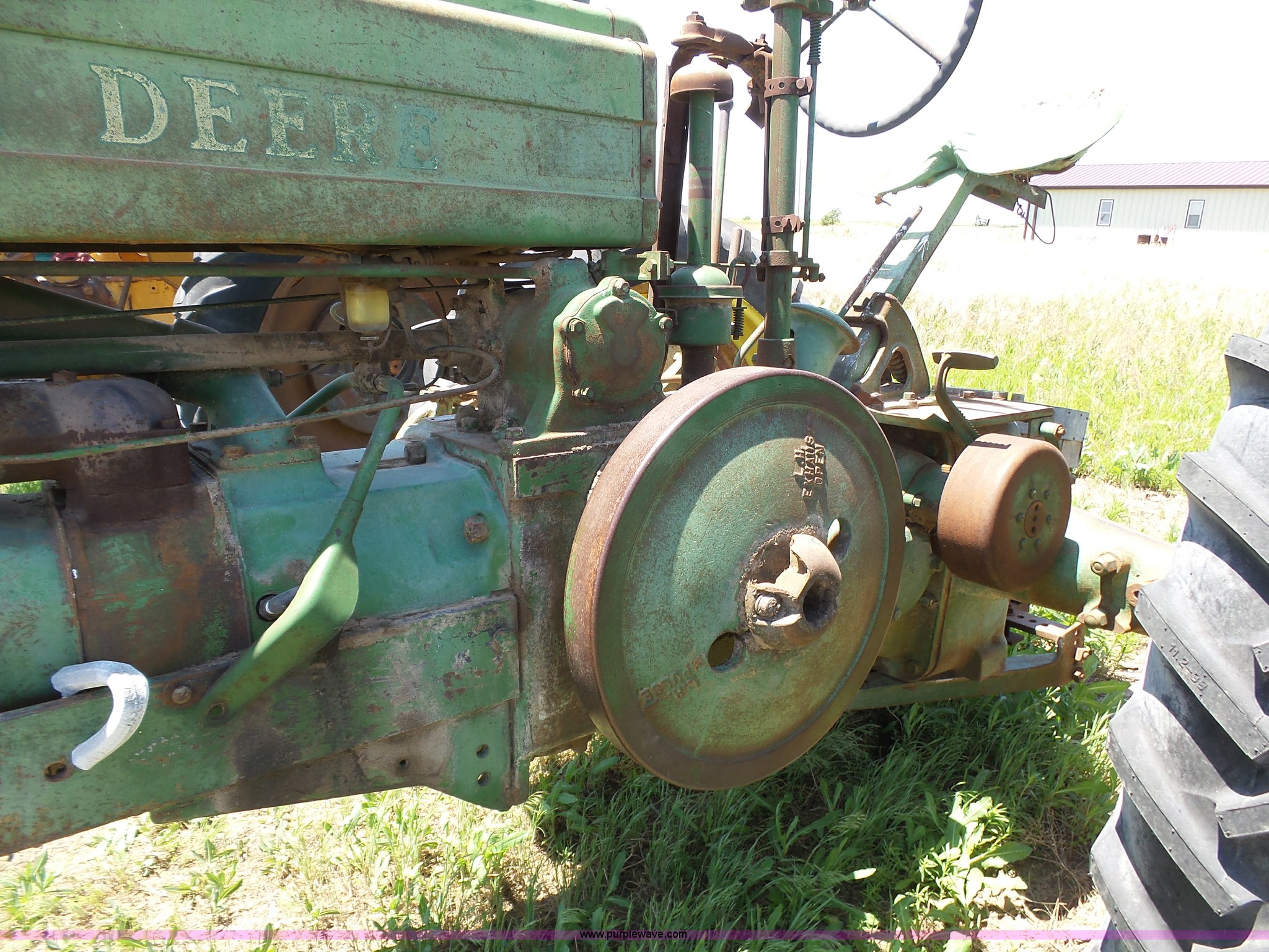 Purple Wave is selling a used Tractor in Kansas. This item is a John Deere A tractor with the following: Two cylinder gas engine, Manual transmission, 6F-1R gears, Suspension seat, 540 PTO, 92" wheelbase, 5.50-16 front tires, 11.2-38 rear tires, Interior/exterior cosmetic damage, Rear PTO housing broken, Flat tire, Unknown operating condition, Serial 506142