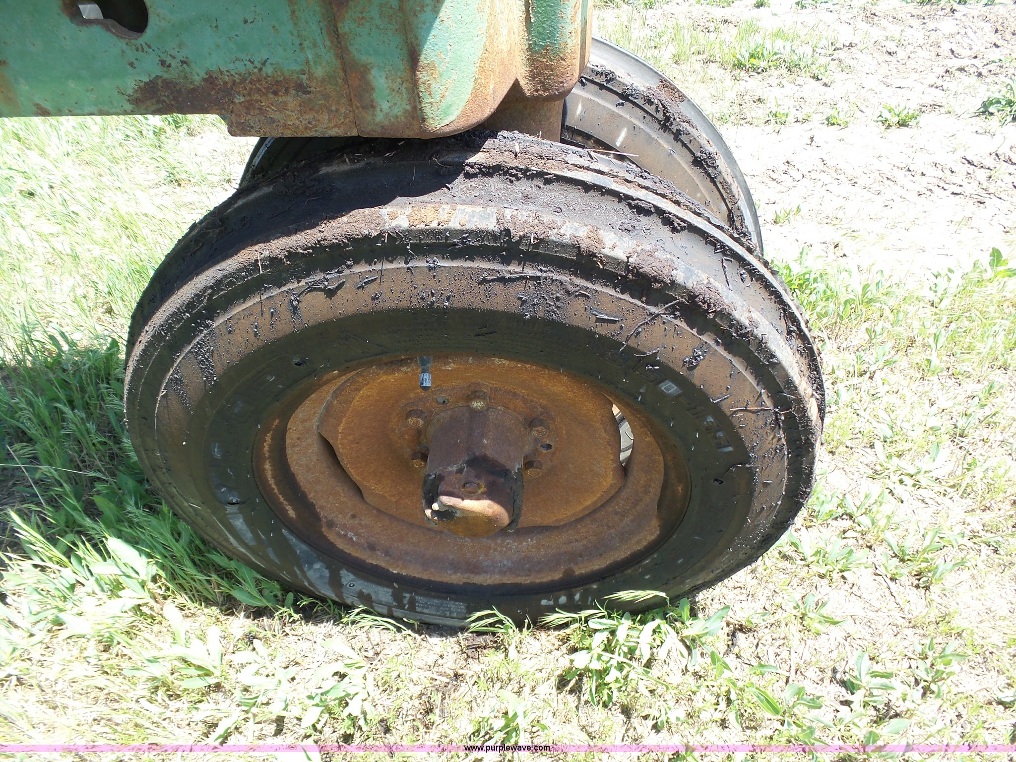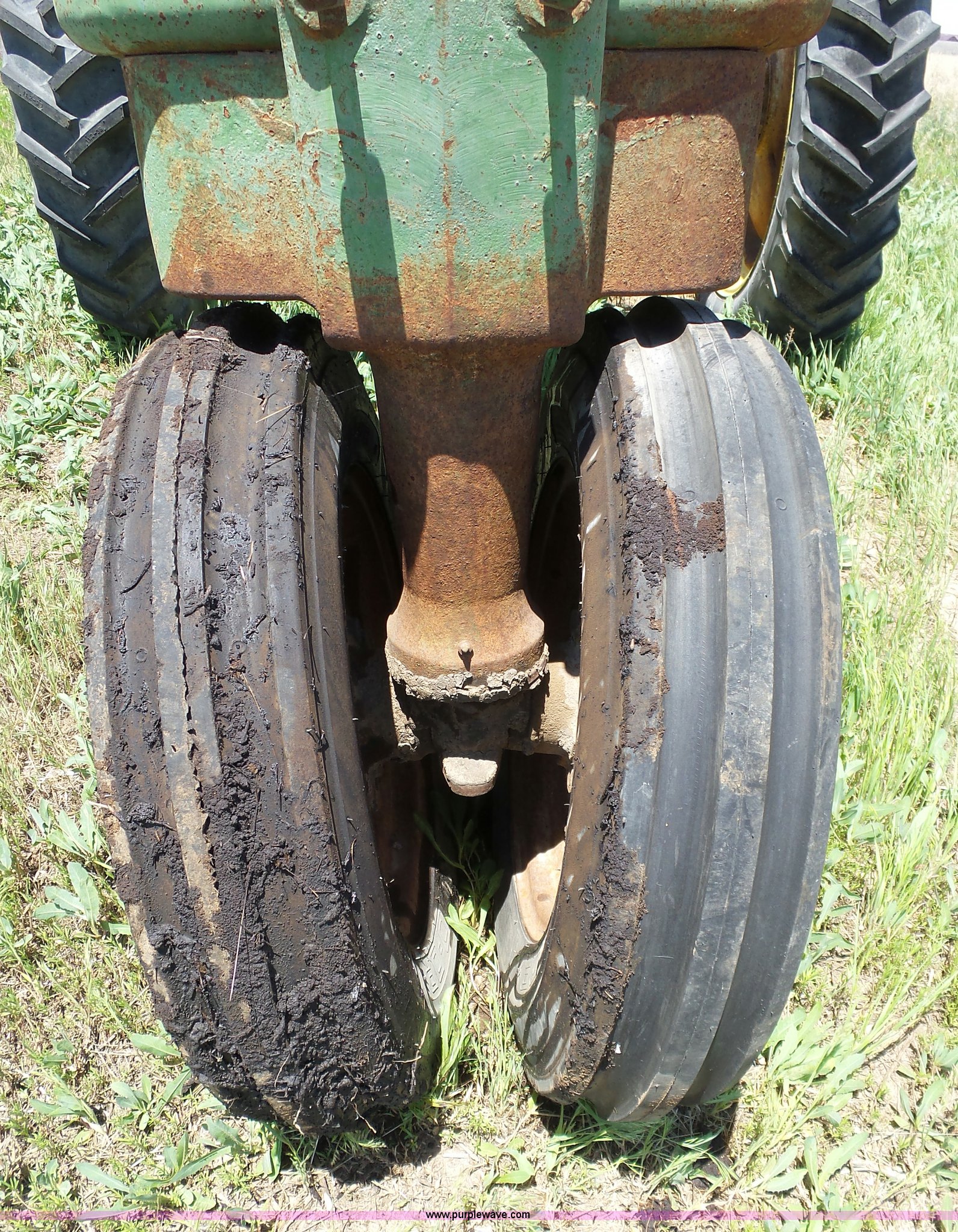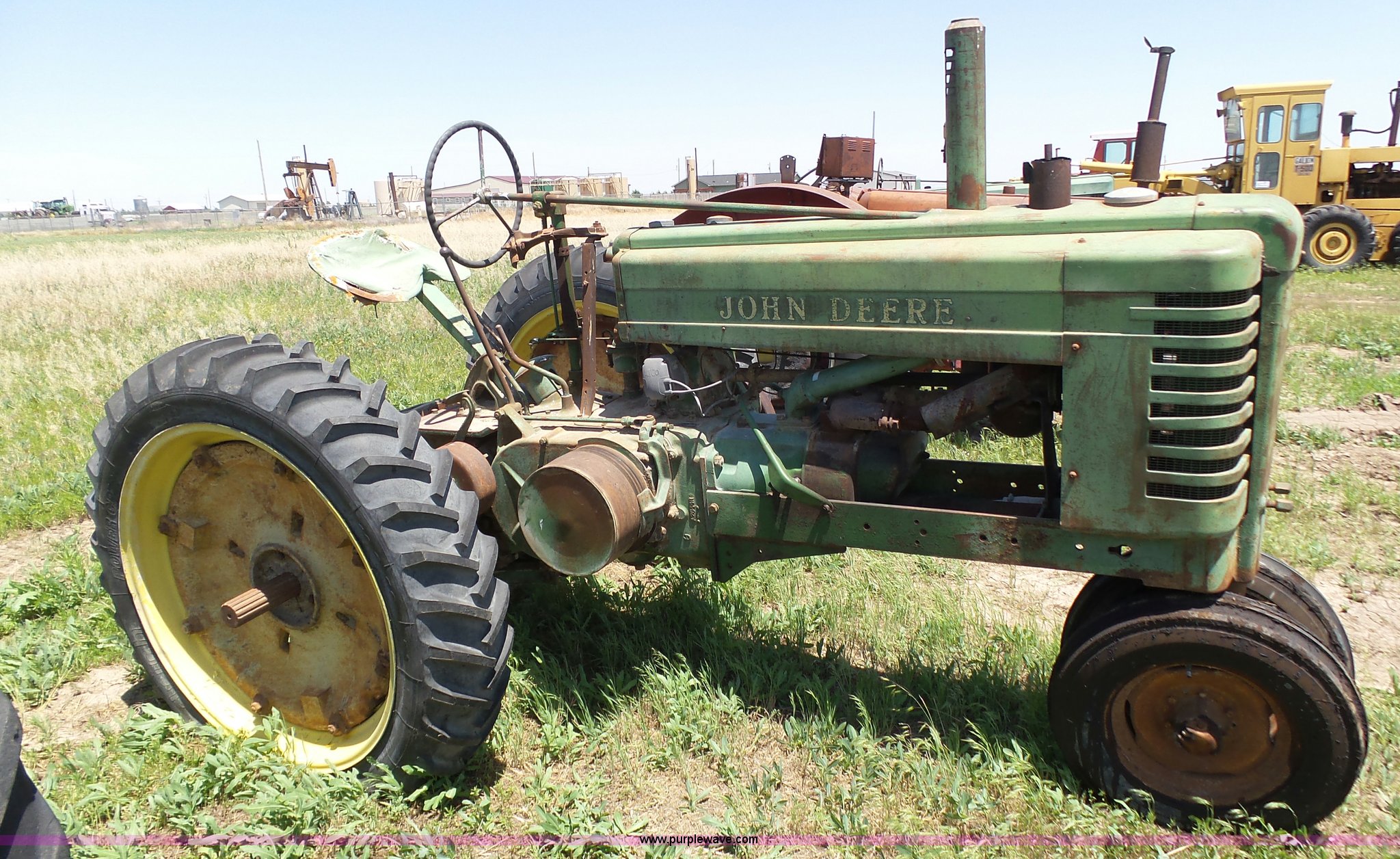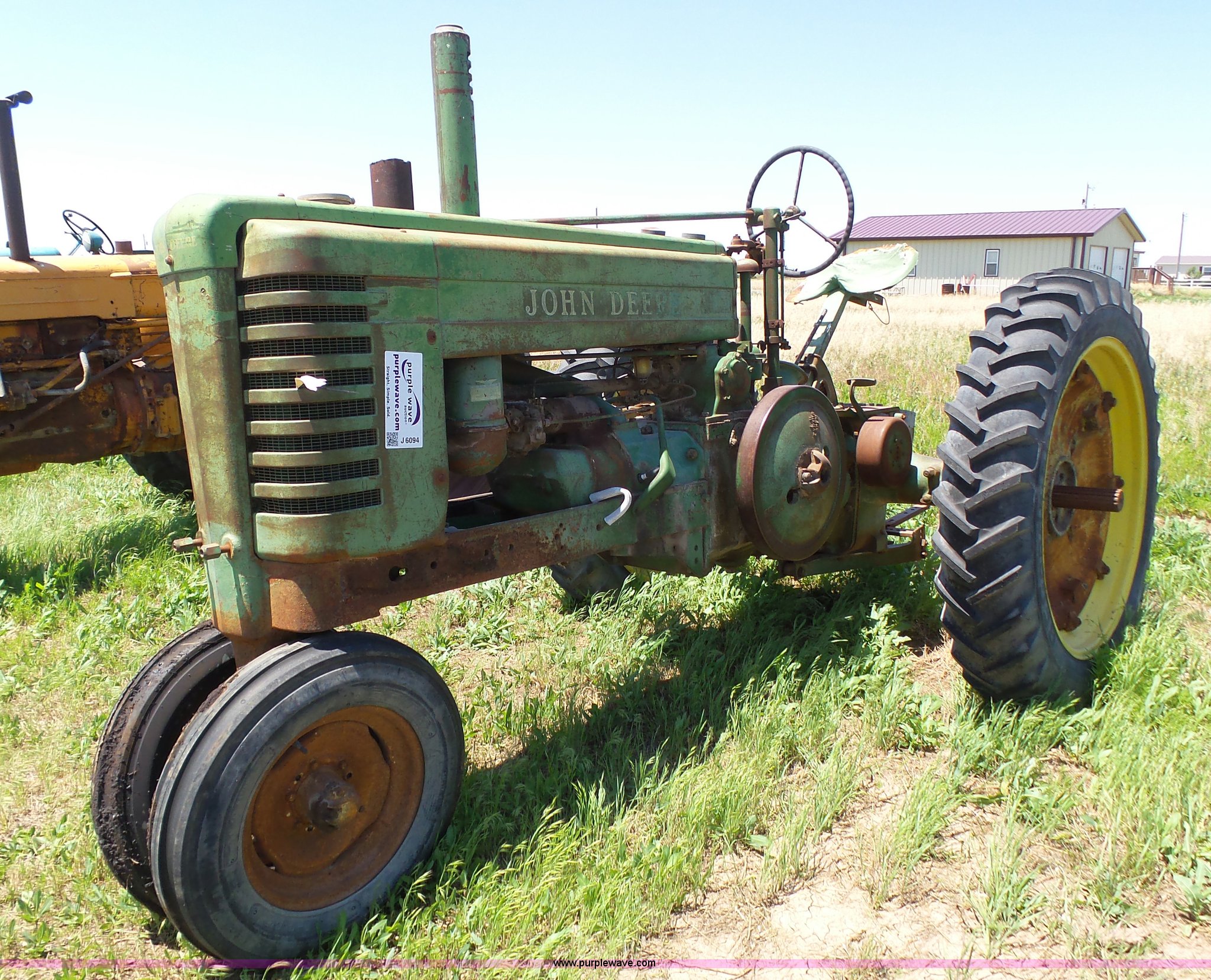 Purple Wave is selling a used Tractor in Kansas. This item is a John Deere A tractor with the following: Two cylinder gas engine, Manual transmission, 6F-1R gears, Suspension seat, 540 PTO, 92" wheelbase, 5.50-16 front tires, 11.2-38 rear tires, Interior/exterior cosmetic damage, Rear PTO housing broken, Flat tire, Unknown operating condition, Serial 506142