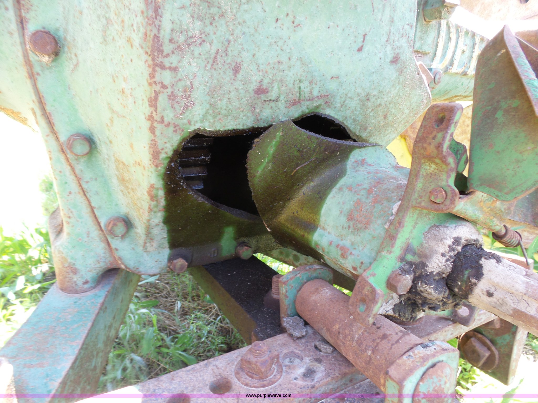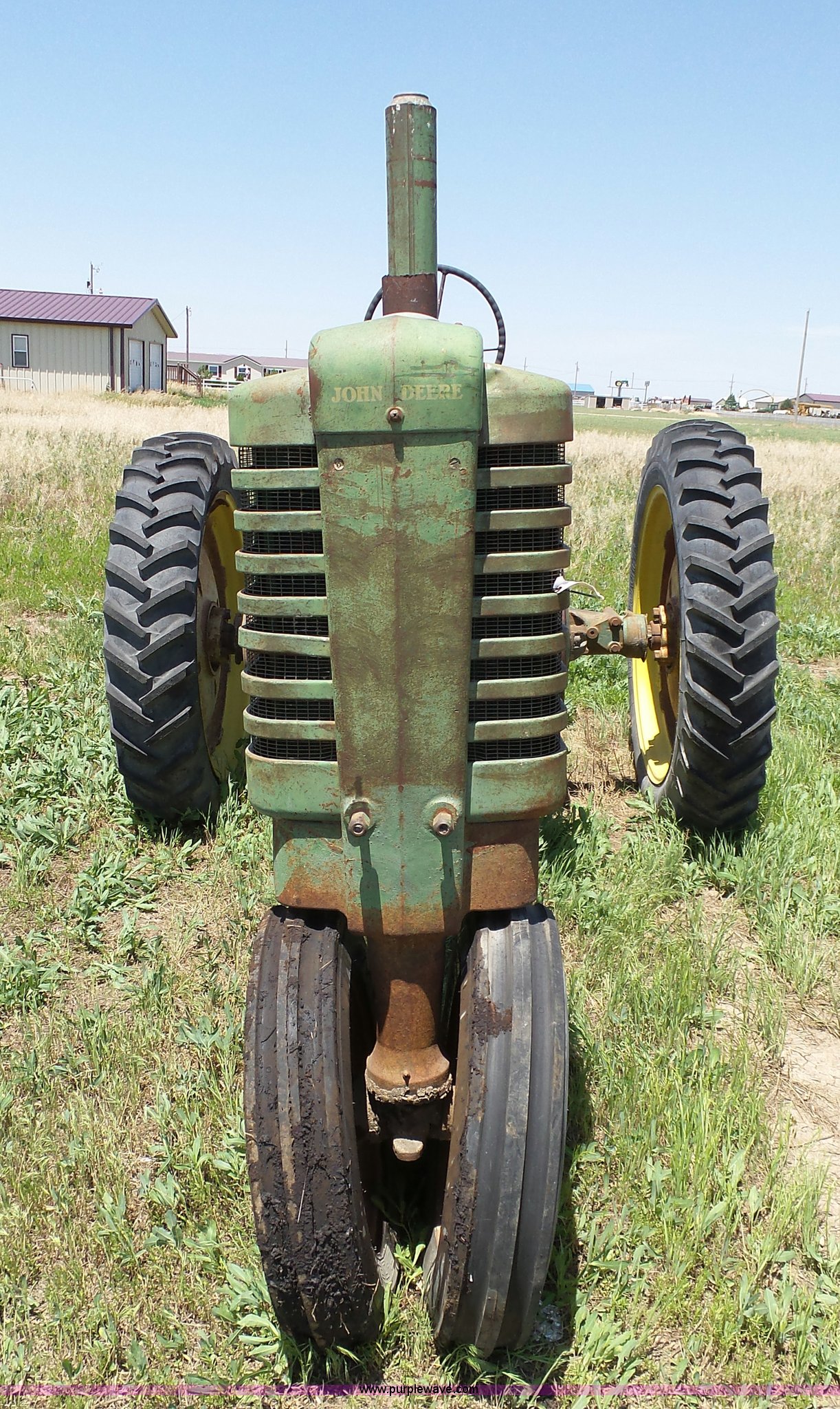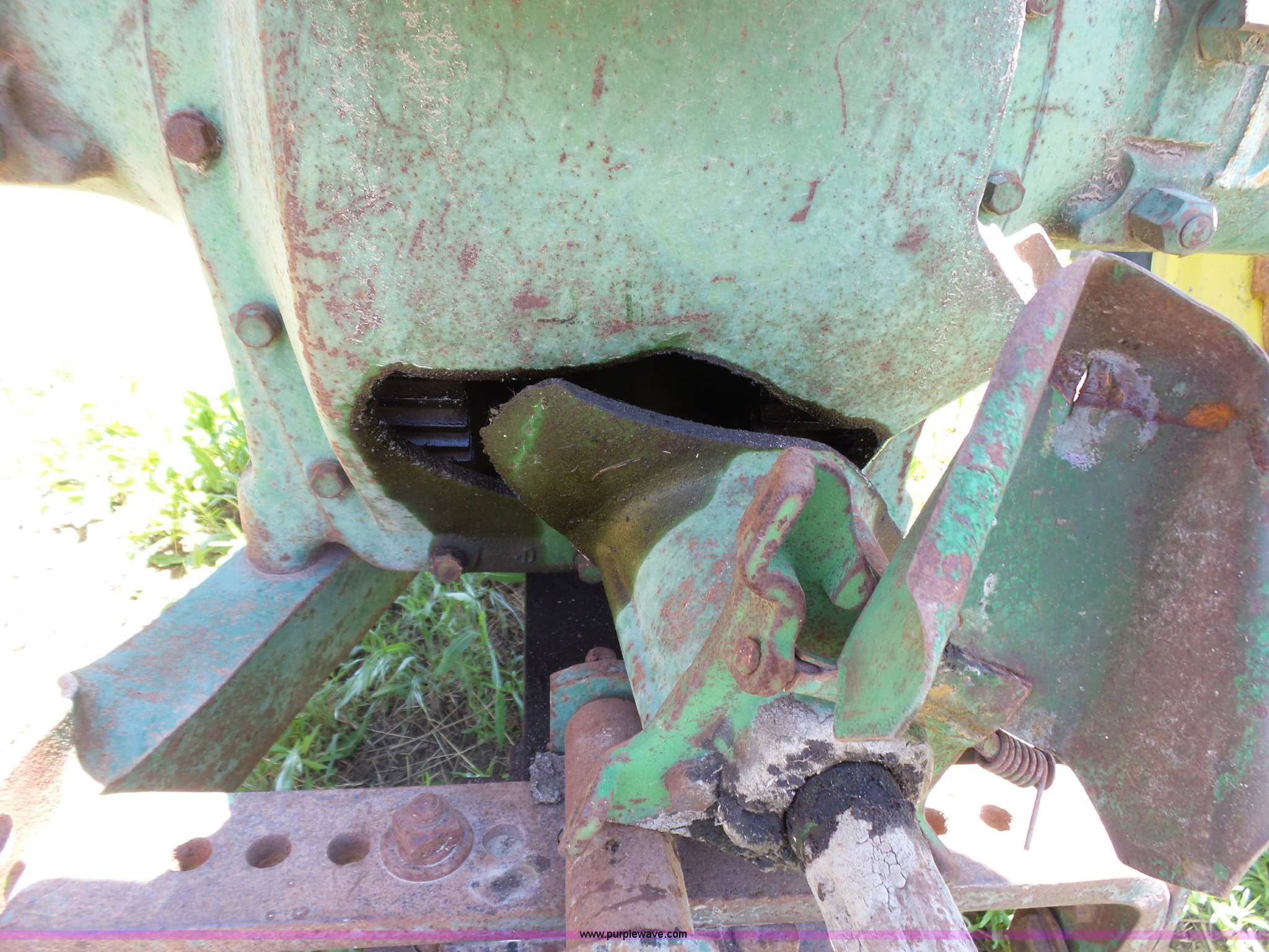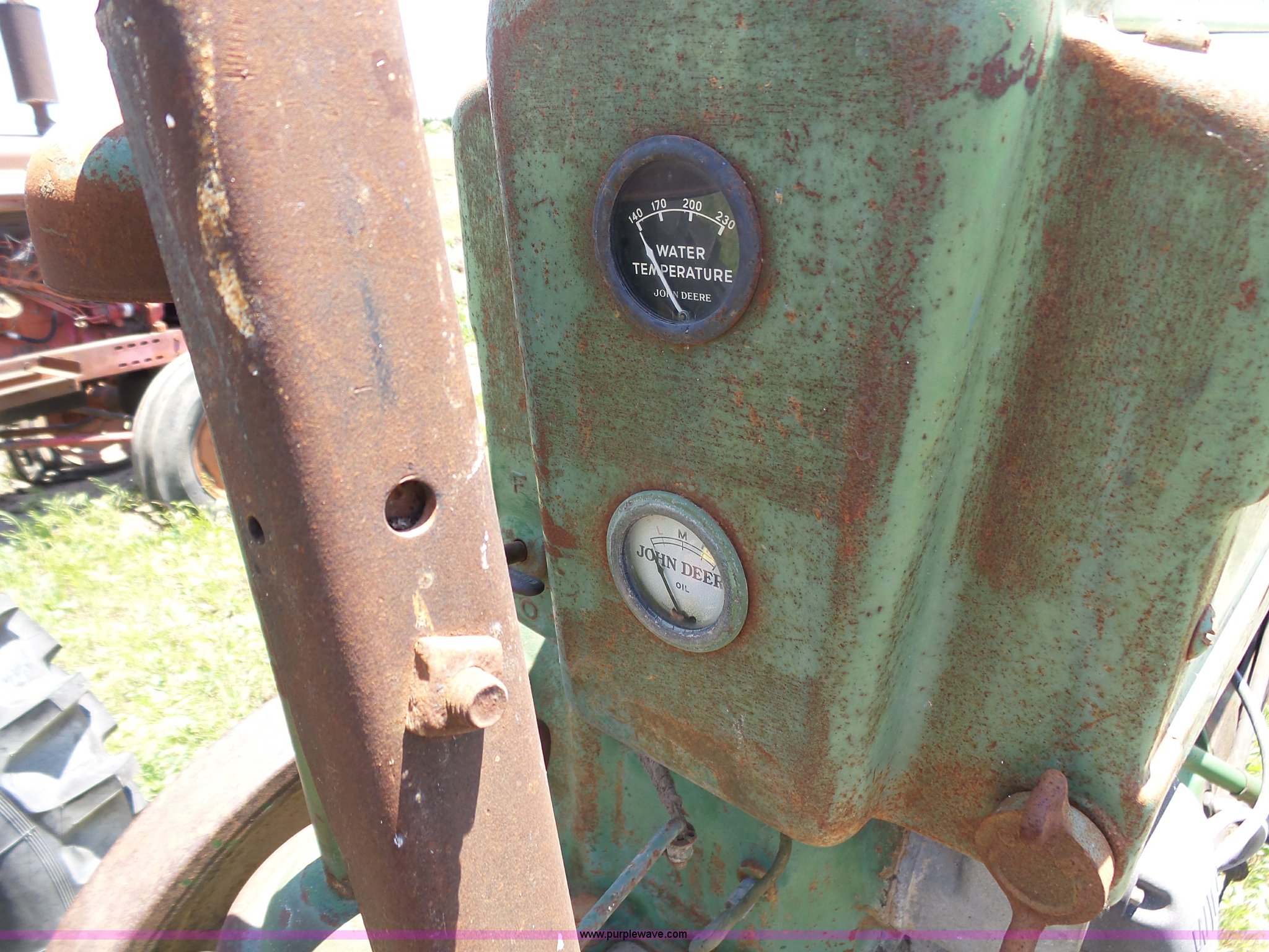 Purple Wave is selling a used Tractor in Kansas. This item is a John Deere A tractor with the following: Two cylinder gas engine, Manual transmission, 6F-1R gears, Suspension seat, 540 PTO, 92" wheelbase, 5.50-16 front tires, 11.2-38 rear tires, Interior/exterior cosmetic damage, Rear PTO housing broken, Flat tire, Unknown operating condition, Serial 506142