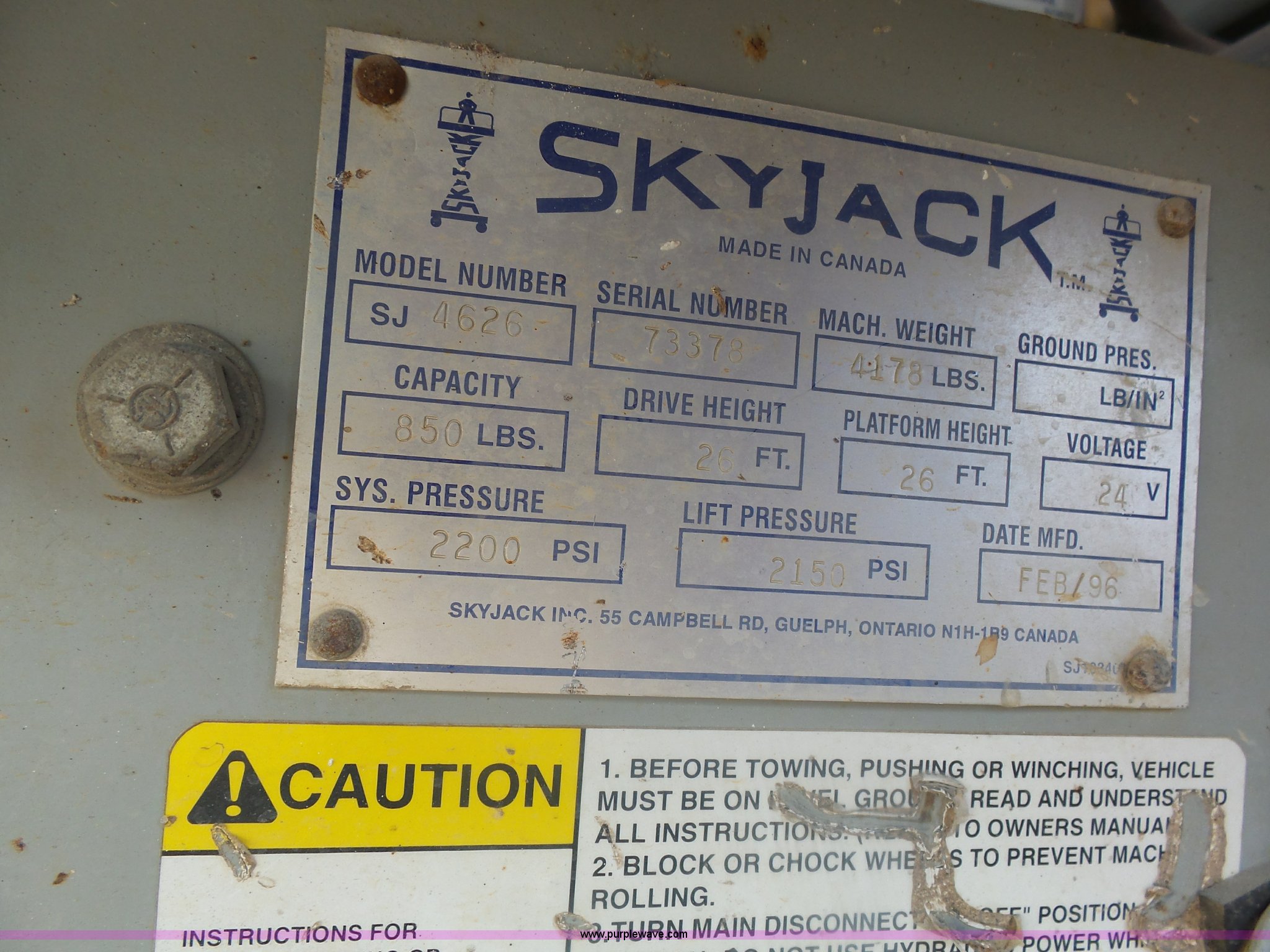 1997 Sky Jack III 4626 scissor lift. 458 hours on meter, 24V electric operation, 850 lbs maximum lift capacity, 26' maximum lift height, 46"W platform Platform and ground controls, Platform extensions, 4.00 x 8 solid non-marking tires, 4,178 lbs. base operating weight, Non-operational unit, possible wiring harness issues, Serial 73378. Muth Electric Inc.. 415 3rd Ave NW. Watertown, SD 57201