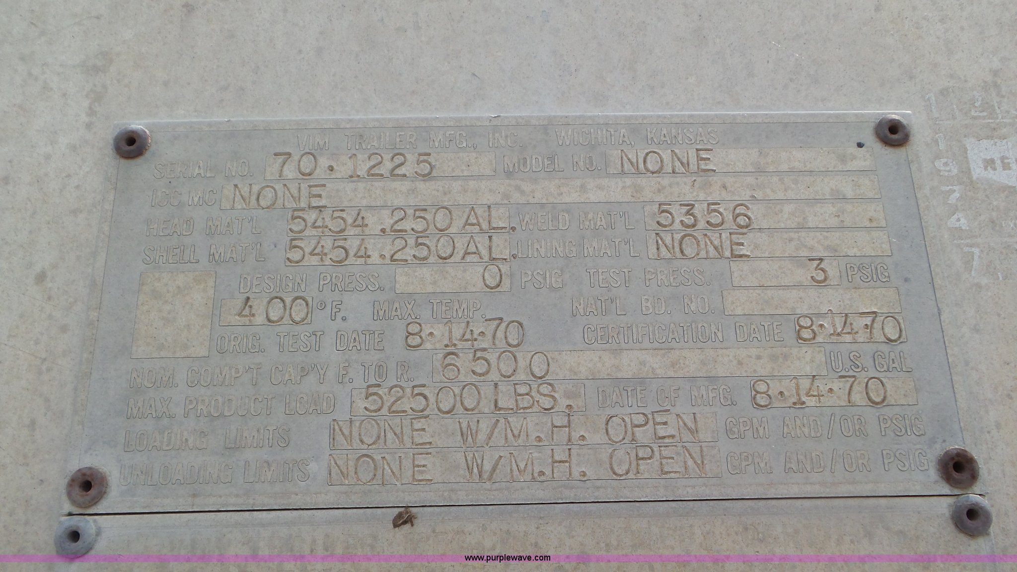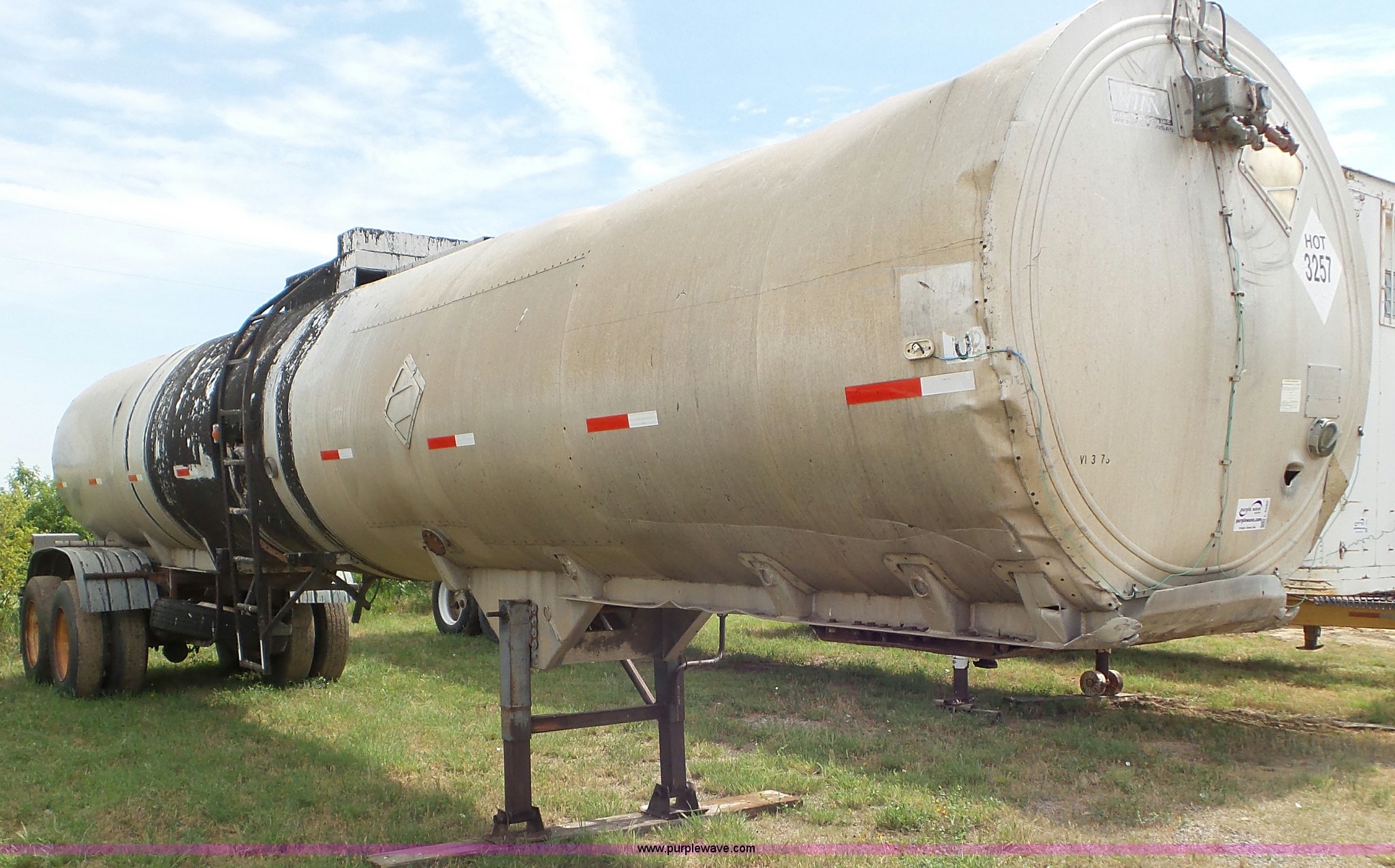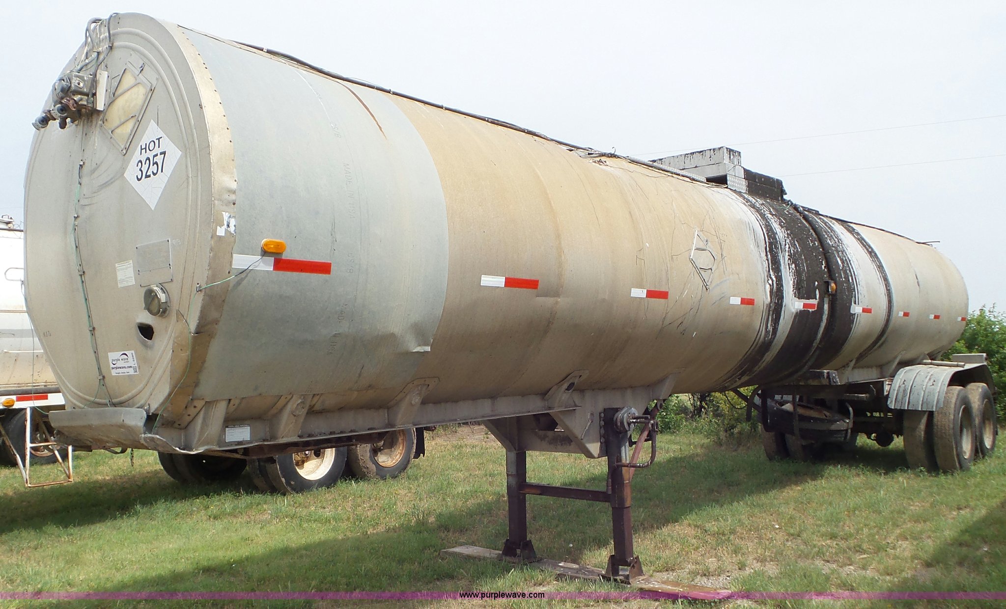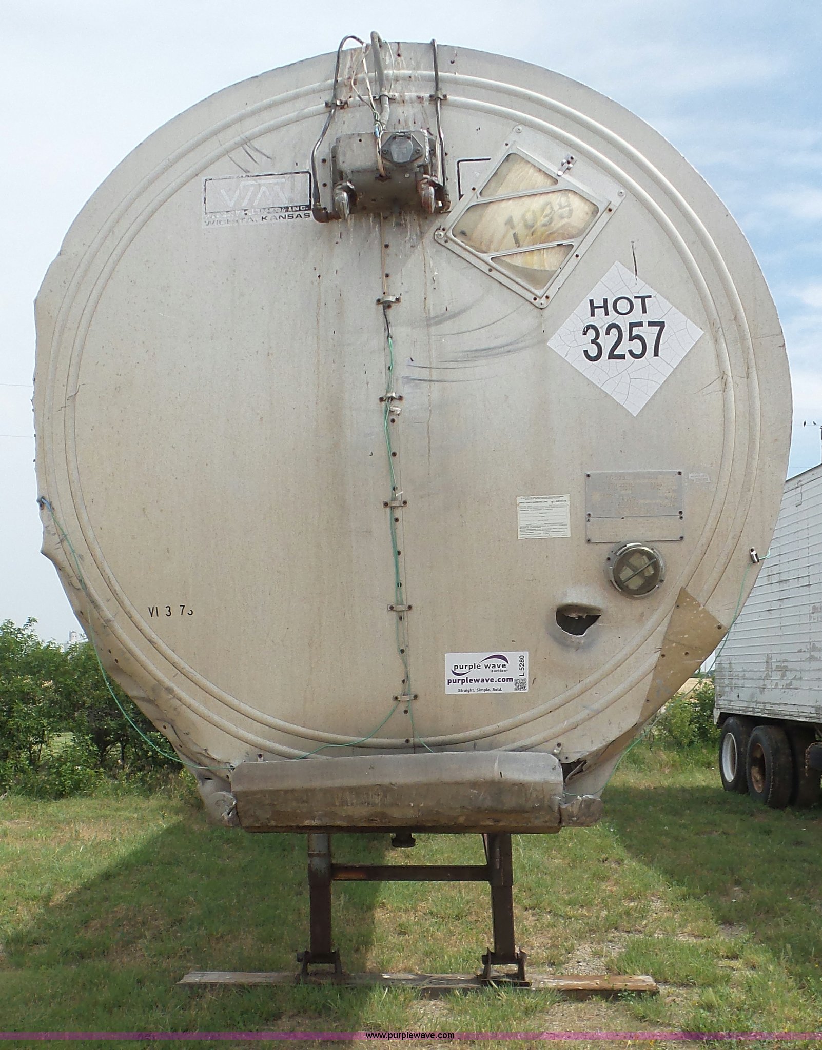 Purple Wave is selling a used Tank Trailer in Kansas. This item is a 1971 VIM asphalt trailer with the following: 38'L x 8'W, Stainless steel tank, 6,500 gallon capacity, Single manway, Metal lining, Dual leg two speed landing gear, Fifth wheel plate, Tandem axle, Spring suspension, Air brakes, Steel wheels, 11R24.5 tires