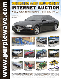 Payments must be made by 4 p.m. CDT on the second business day following the auction. Purple Wave reserves the right to charge the credit card on file the total purchase price, $30.00 late payment fee for invoices not paid within our terms. Business hours are Monday through Friday 8 a.m. to 5 p.m CDT. Cash and wire transfers (wire instructions) in any amount will be accepted. Checks up to $10,000.00 will be accepted without a bank guaranty letter. Checks of $10,000.00 or greater will be accepted only with a bank guaranty letter (letter requirements) or with prior approval from Purple Wave's credit department. MasterCard or Visa will be accepted only for charges up to $2,000.00, and only after authorization (via website or email) or in-person signatures are obtained from the cardholder. Purple Wave reserves the right to hold assets and/or certificates of title until funds availability is confirmed.