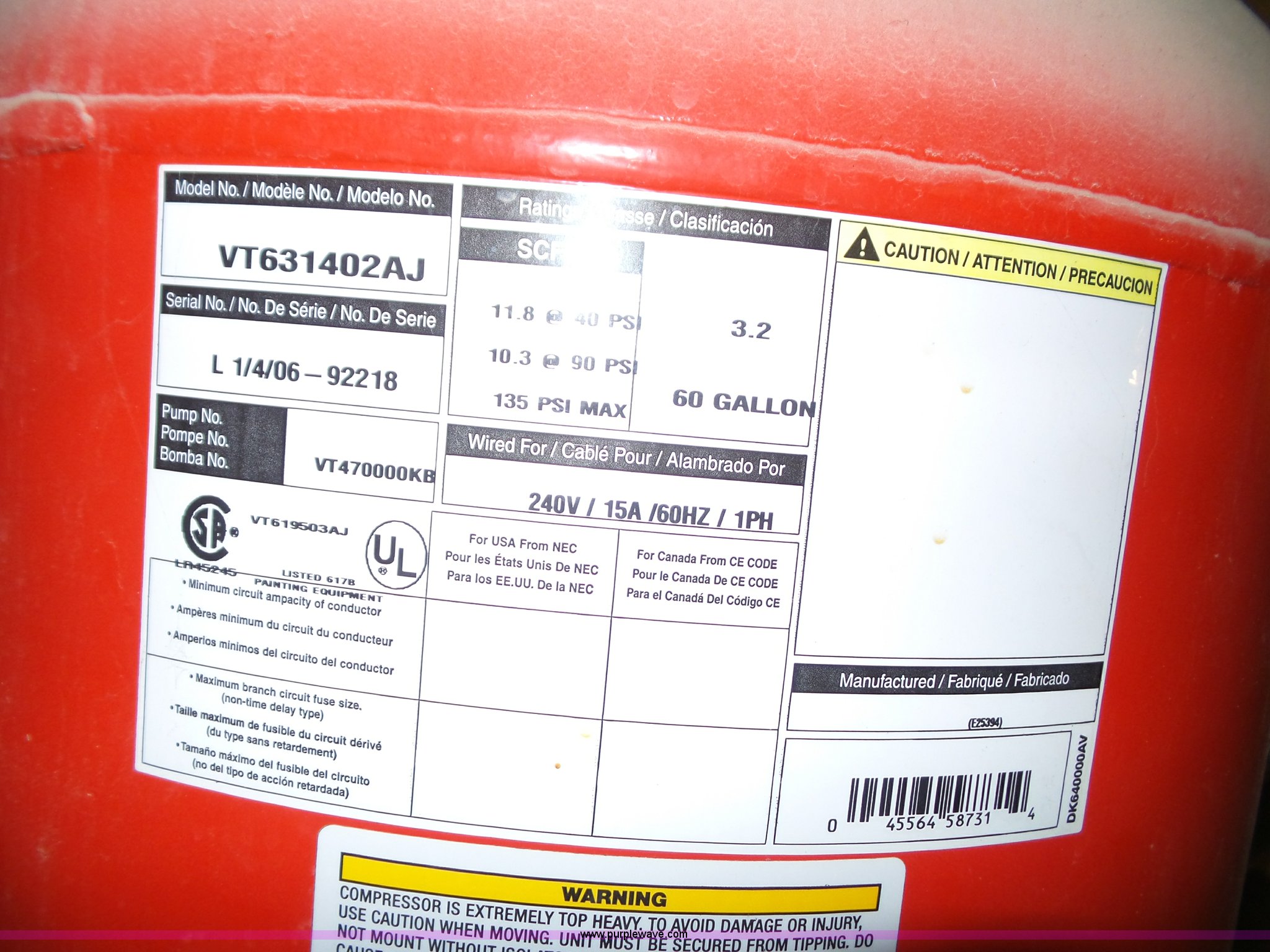 Purple Wave is selling a used Air Compressor in Kansas. This item is a Husky Pro VT631402AJ air compressor with the following: Single phase, 60 gallon capacity, Non-operational, Switch needs replaced, Serial L1/4/06-92218
