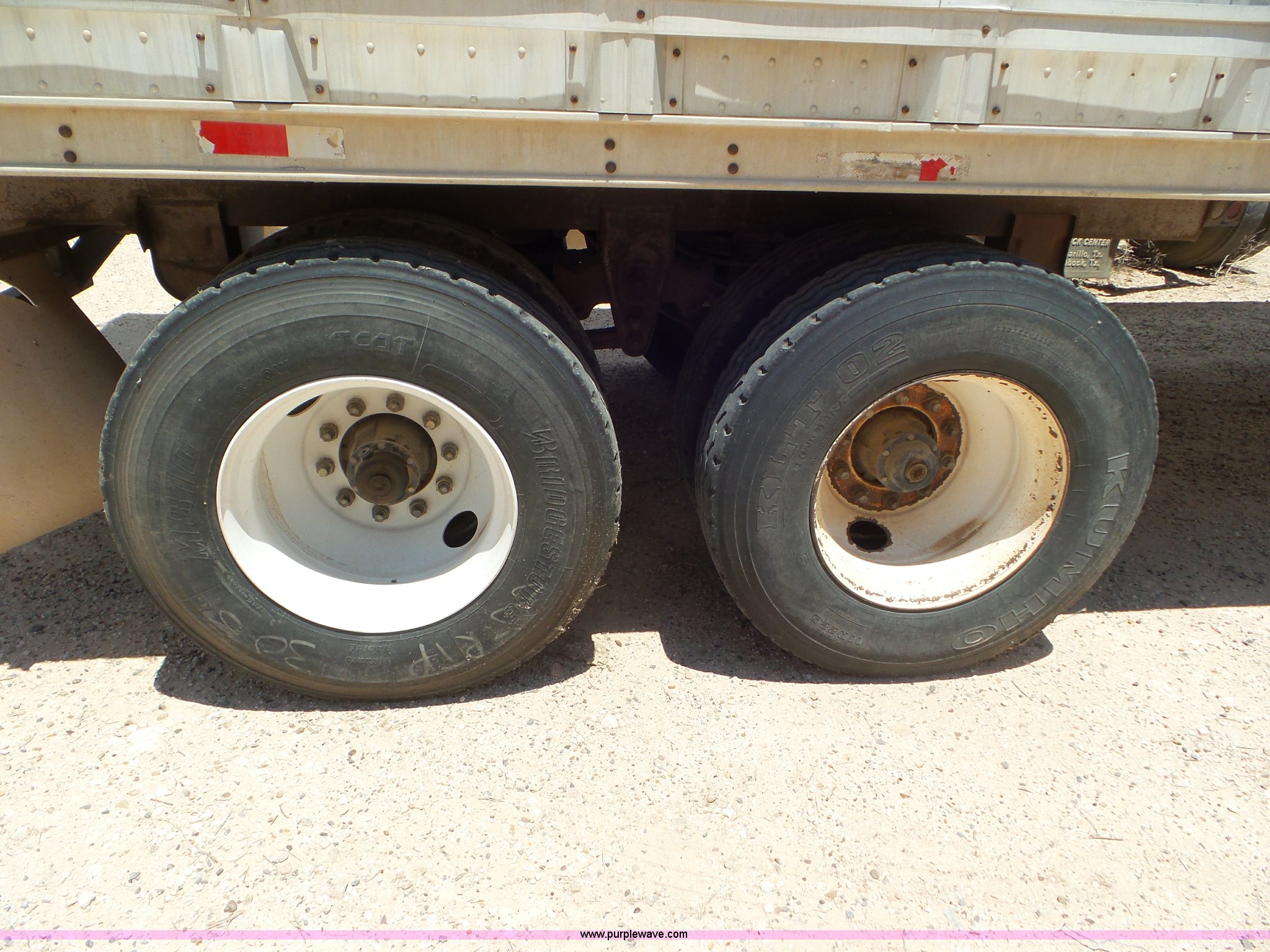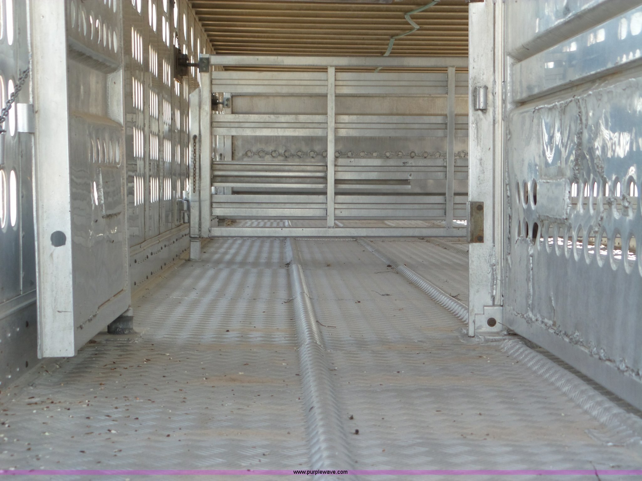 Purple Wave is selling a used Livestock Trailer in Oklahoma. This item is a 1996 Barrett Hog Deck livestock trailer with the following: 53' overall length, 102"W, Aluminum construction, Two decks, Rear roll-up gate, Dock bumper, Spray system, Under-mounted toolbox, Dual leg two speed landing gear, Fifth wheel plate, Tandem axle, Spring suspension, Air brakes, Steel wheels, 11R22.5 tires, GVWR 65,000 lbs, Unit# 3770