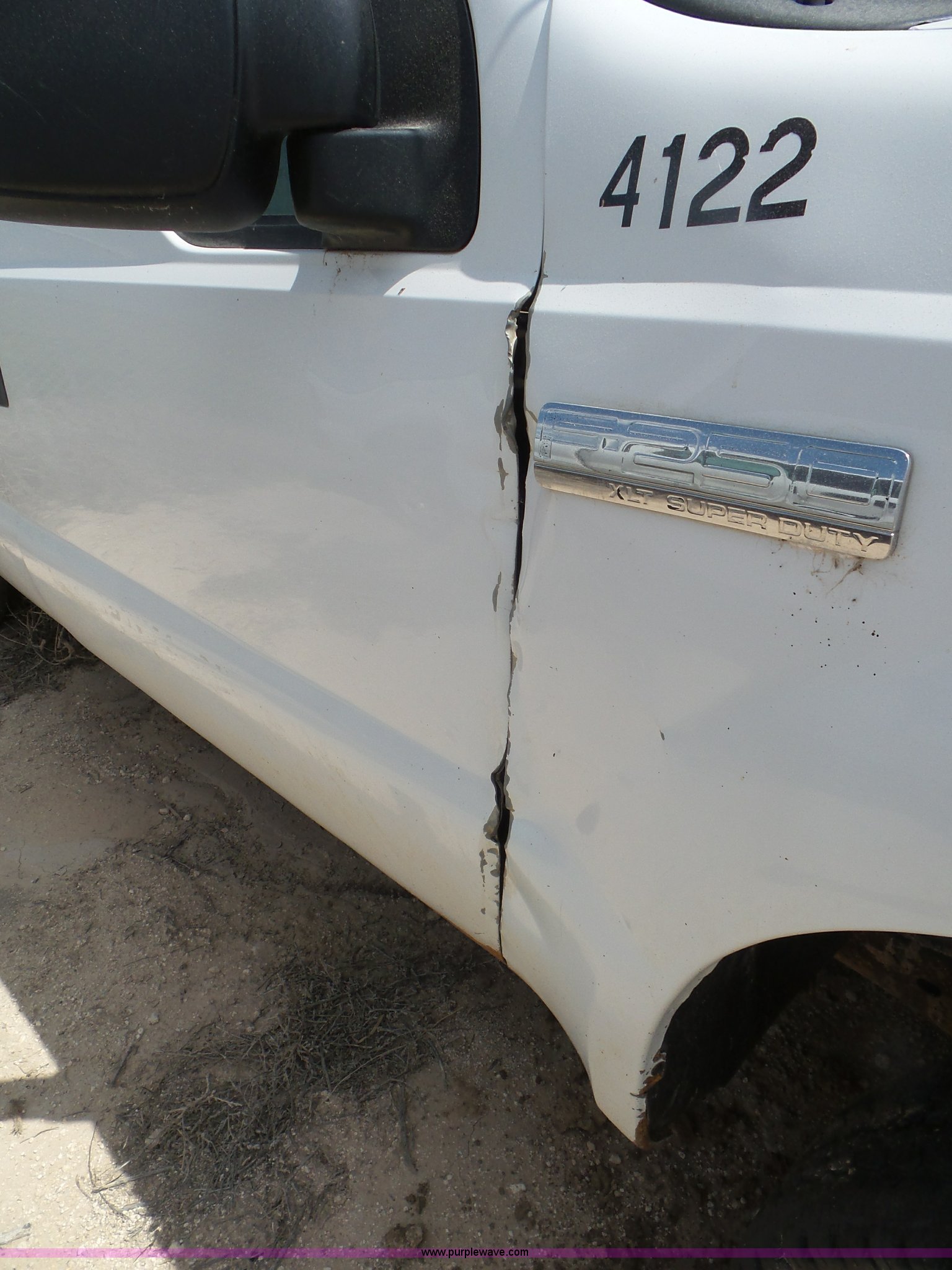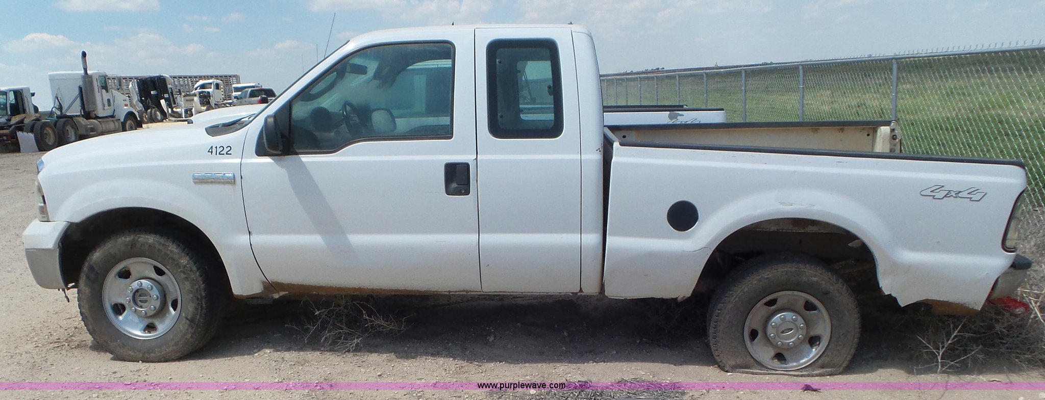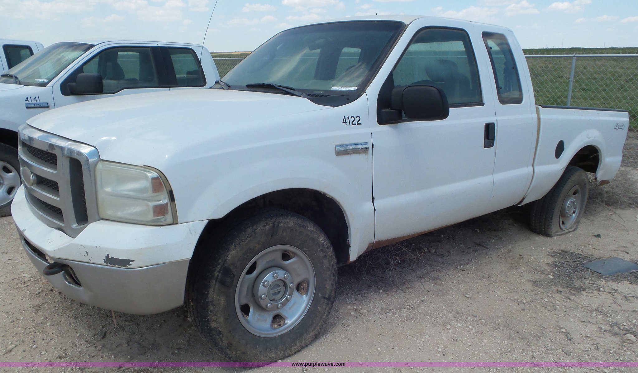 Purple Wave is selling a used 3/4 or 1 Ton Pickup or Van in Oklahoma. This item is a 2005 Ford F250 Super Duty SuperCab pickup truck with the following: Approximately 237,815 miles on odometer, 5.4L V8 SOHC 16V gas engine, Automatic transmission, Four wheel drive, AC and heat, Tilt, Cruise, AM/FM/CD, Power windows, locks, and mirrors, Cloth interior, Front tow hooks, Receiver hitch, Trailer wiring, 265/70R17 tires, Non-operational vehicle, Bed damaged, Flat tires, Seat torn, Dents, Unit# 4122