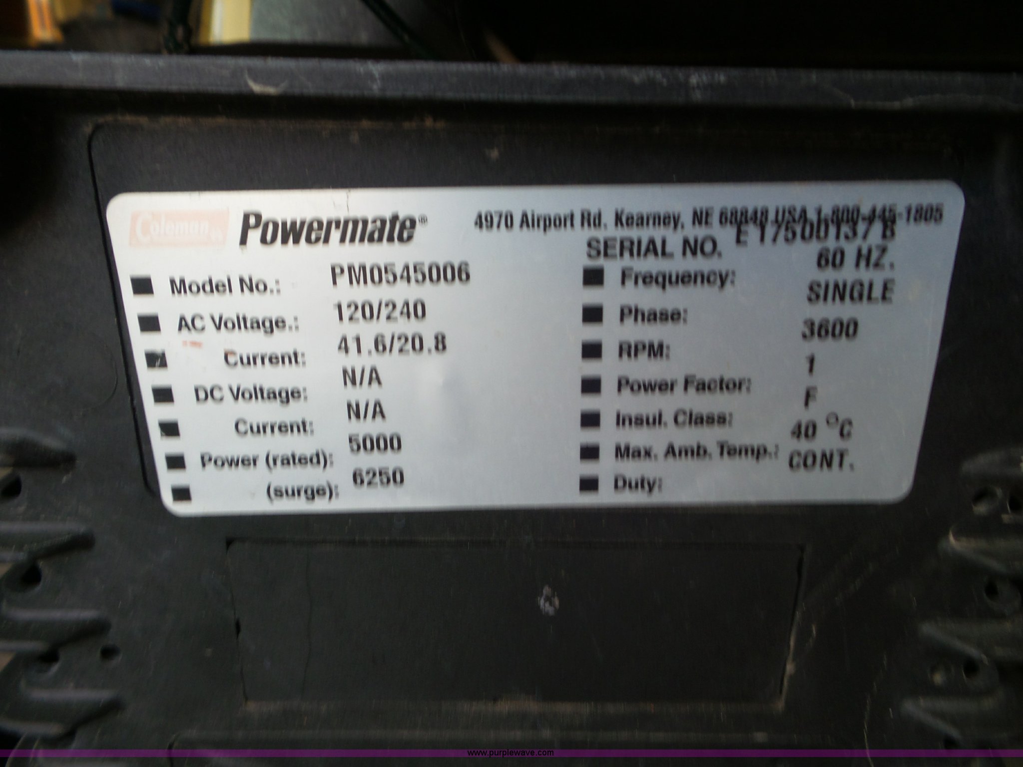Purple Wave is selling a used Generator Set in Missouri. This item is a Coleman Powermate 6250 generator with the following: Briggs & Stratton 10 HP gas engine, 120/240V, 5 gallon fuel tank, Single phase, 5,000 watt, Serial E17500137B