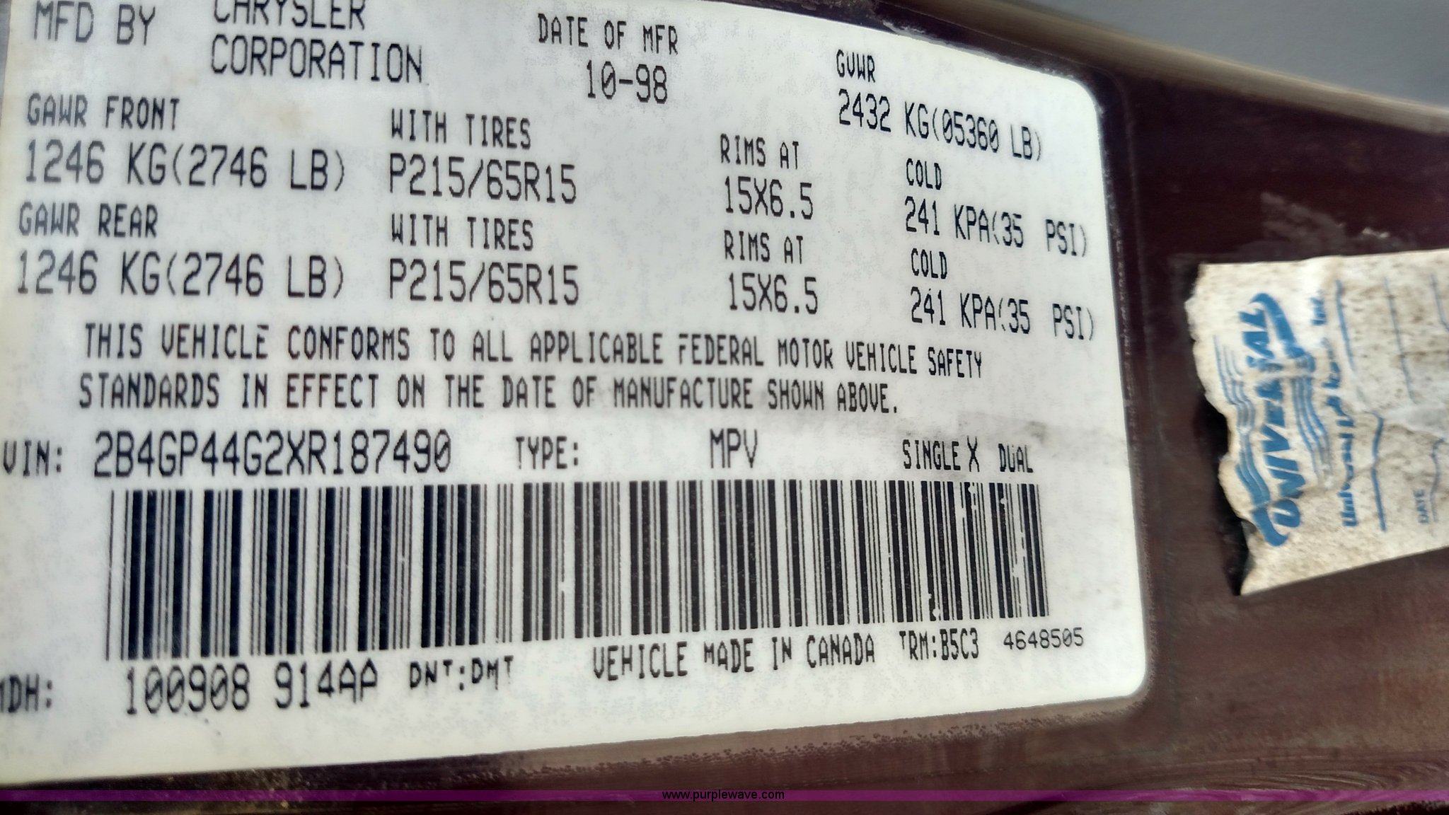 Purple Wave is selling a used Passenger Vehicle in Kansas. This item is a 1999 Dodge Grand Caravan SE van with the following: 197,440 miles on odometer, 3.3L V6 OHV 12V gas engine, Automatic transmission, AC and heat, Tilt, Cruise, AM/FM/CD, Power windows and locks, Cloth interior, 215/65R15 tires