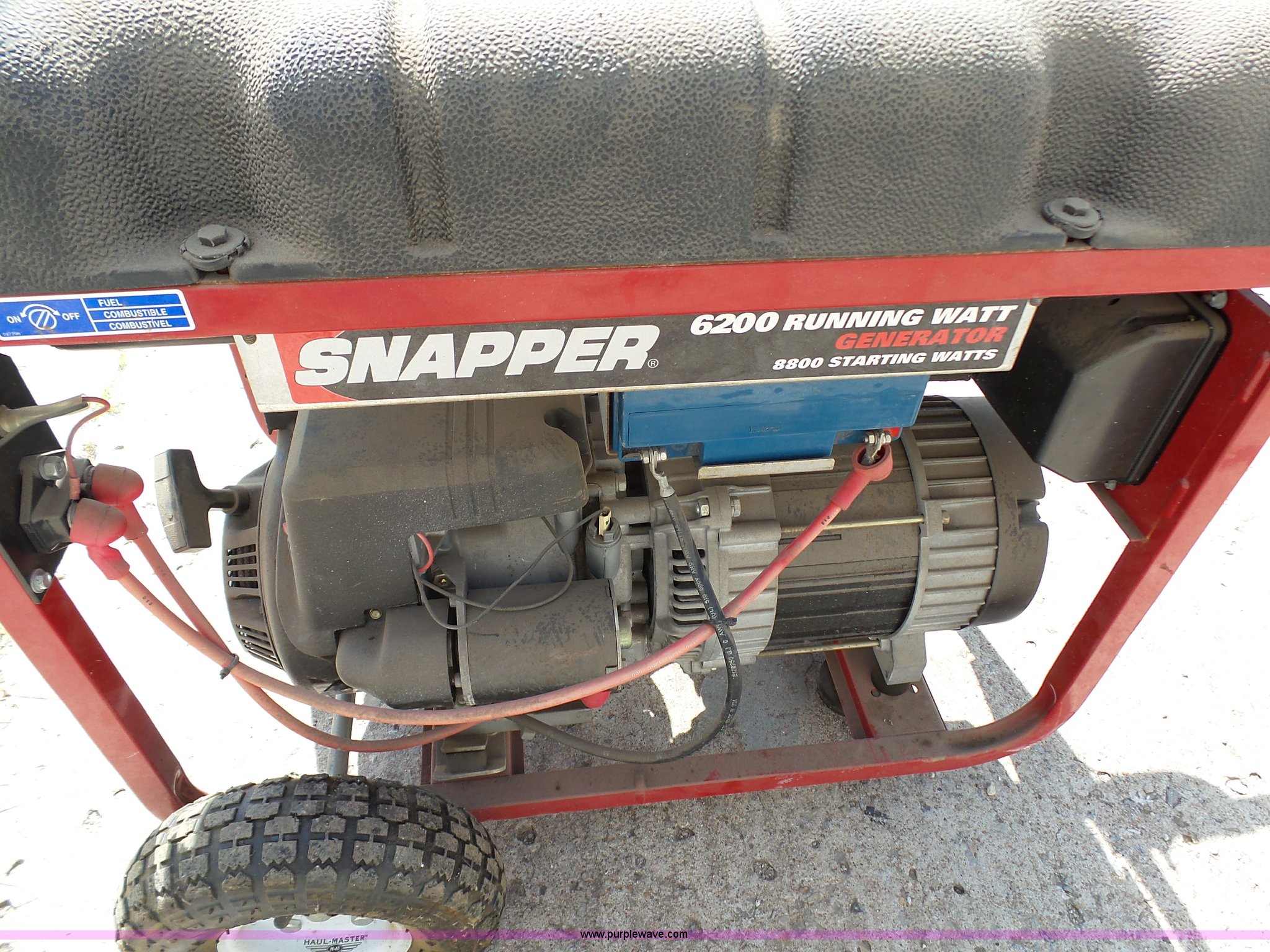 Purple Wave is selling a used Generator Set in Kansas. This item is a Snapper generator with the following: Model 030216, Briggs & Stratton gas engine, 11 HP, Electric start, 6,200 running watts, 120/240V, Serial 101288819