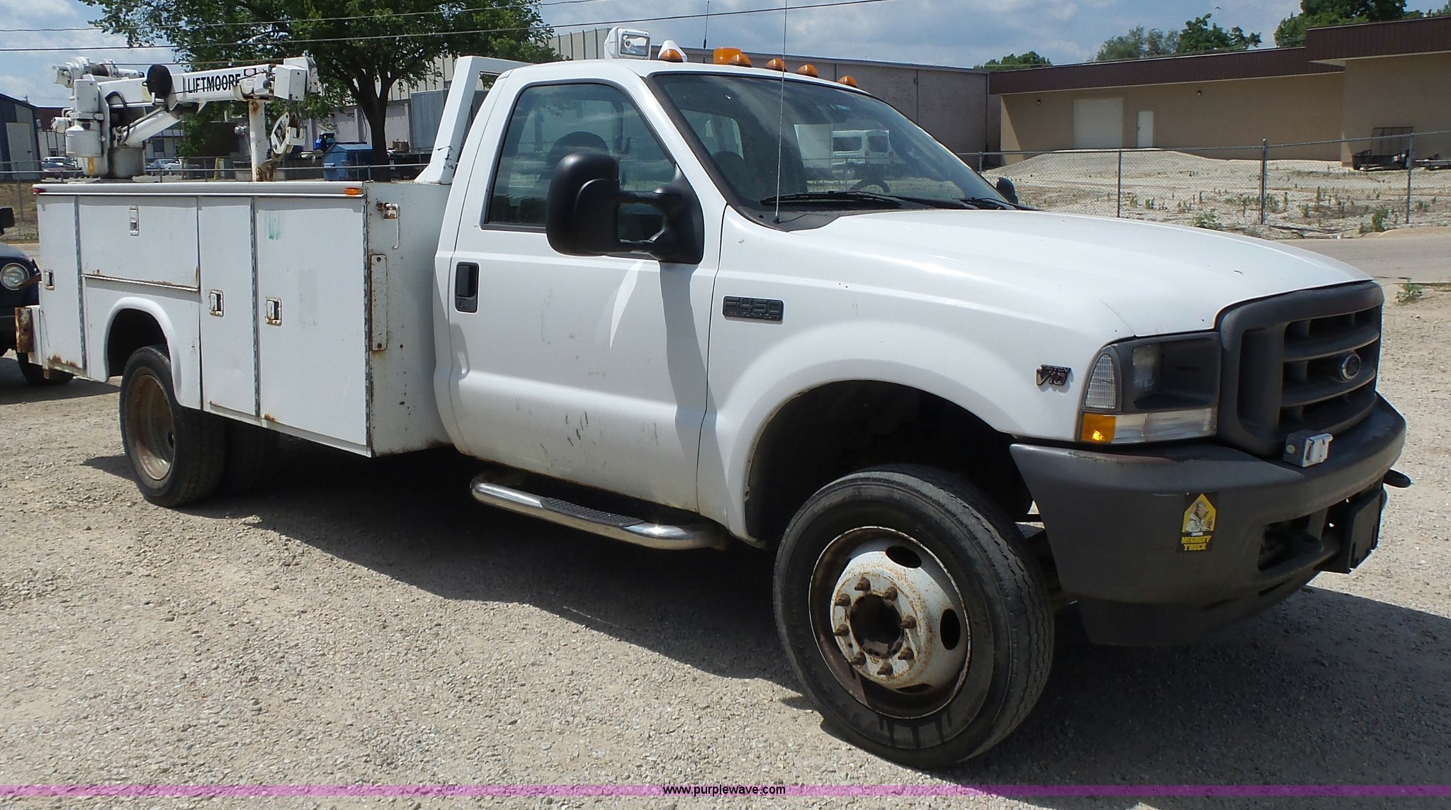 Purple Wave is selling a used Service Truck in Missouri. This item is a 2004 Ford F450 service truck with the following: 219,217 miles on odometer, 6.8L V10 SOHC 20V gas engine, Automatic transmission, Single axle, AC and heat, AM/FM, Spring suspension seat, Beacon light, Front tow hooks, Knapheide 6132D54J service bed, 10'L, Shelving, Slide-out drawers, Pintle hitch, Trailer wiring, Liftmore 3200 crane, 3,200 lbs maximum lift capacity, Single fuel tank, Spring suspension, Hydraulic brakes, 225/70R19.5 tires, No crane remote