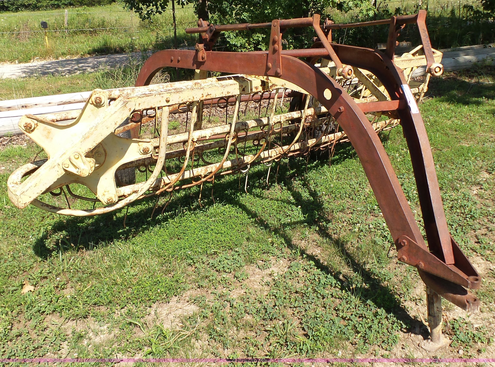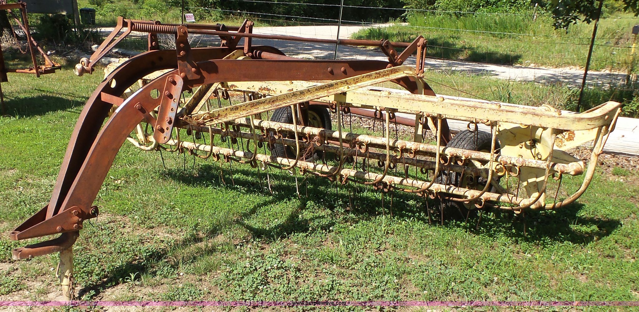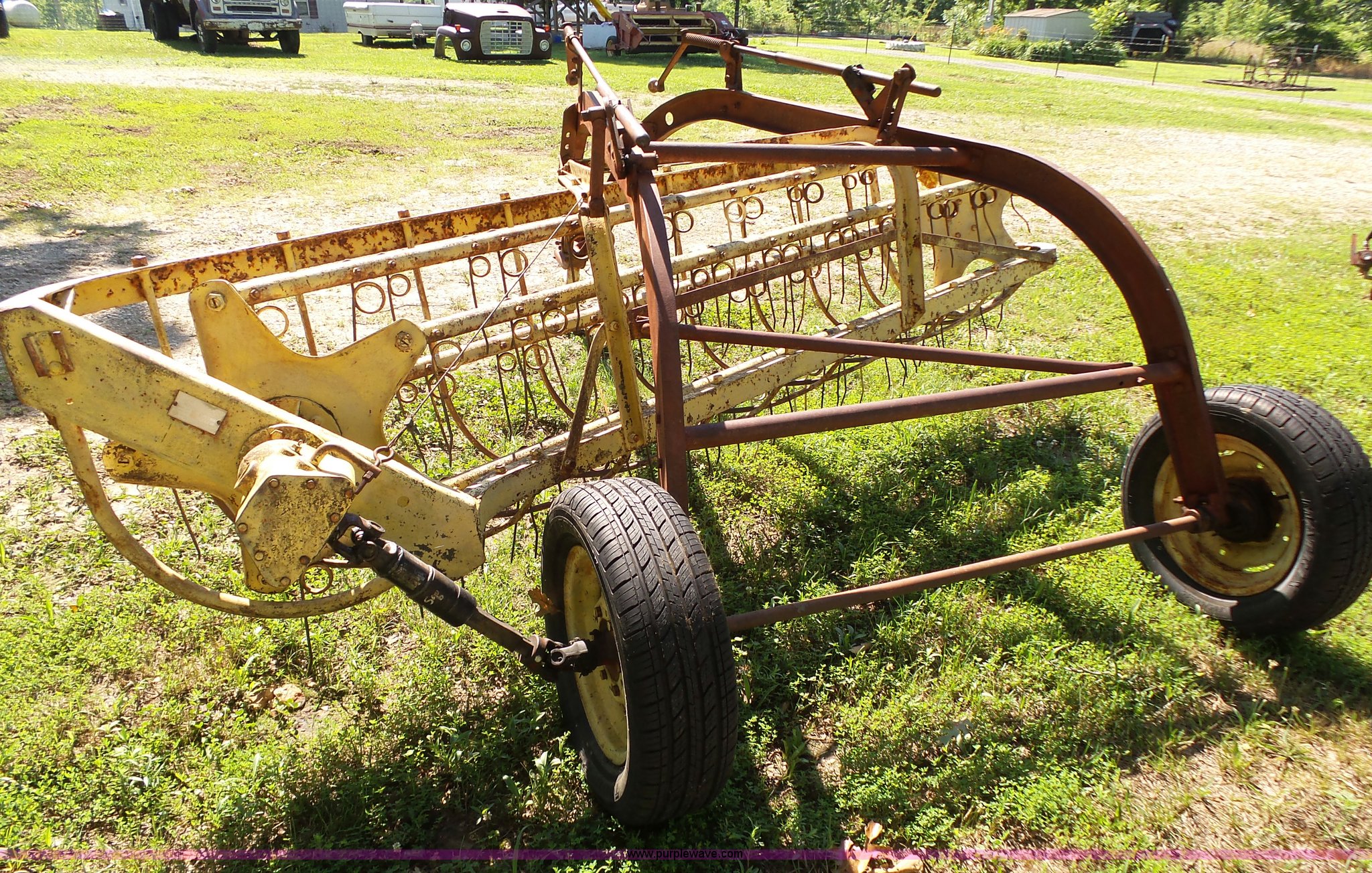 Purple Wave is selling a used Hay Rake in Missouri. This item is a New Holland 55 hay rake with the following: 9'W, Ground driven, Pin hitch, 205/65R15 tires, Serial 24996
