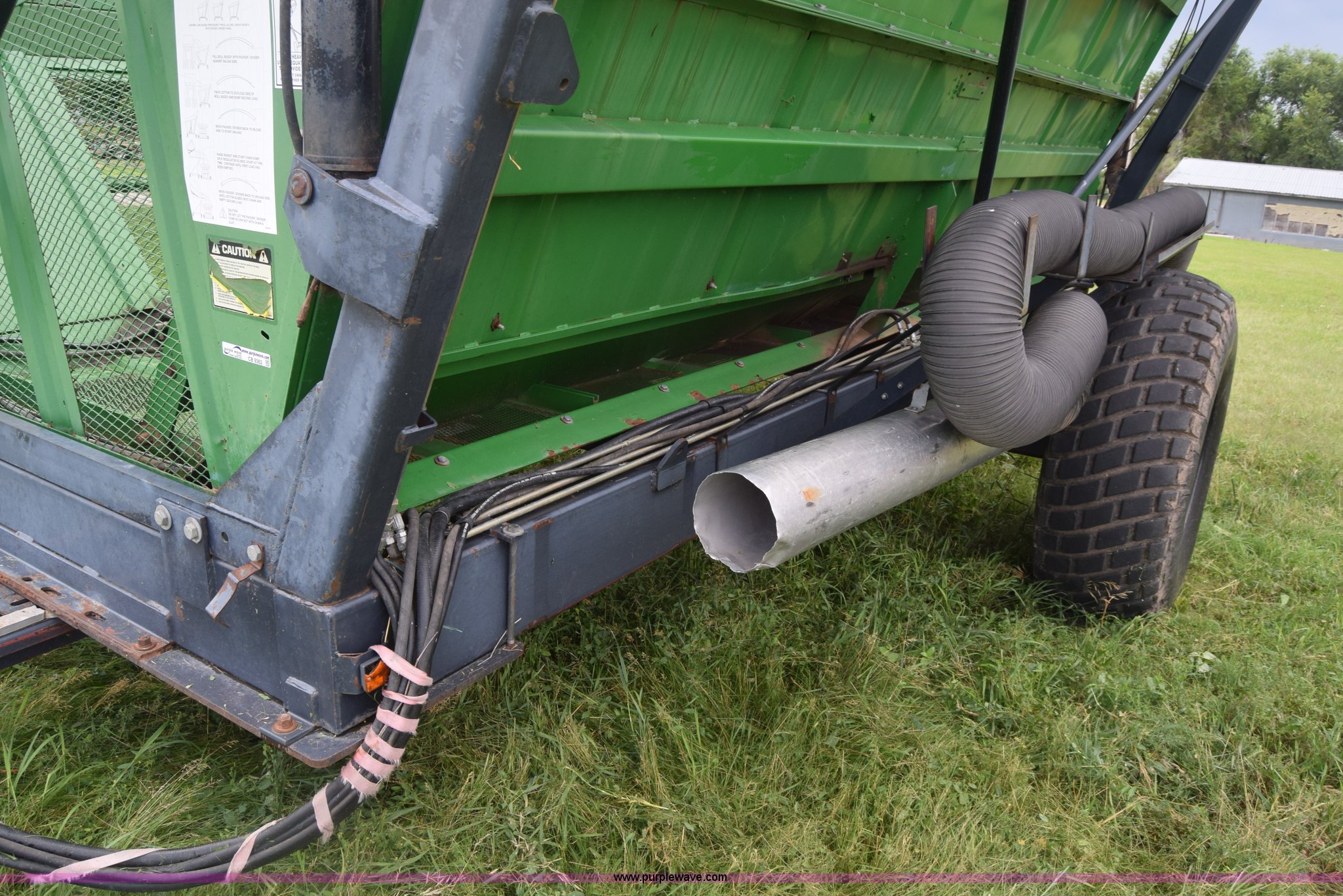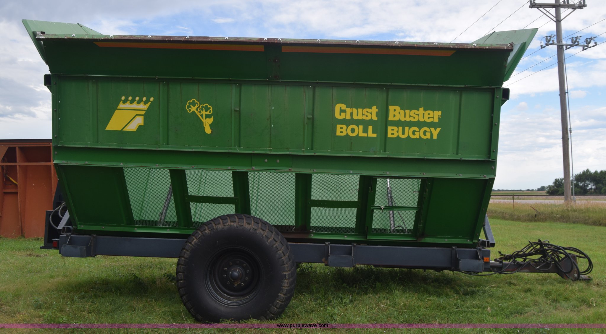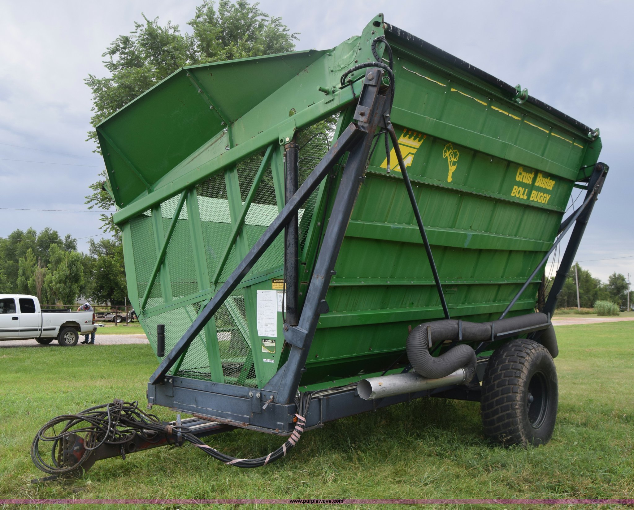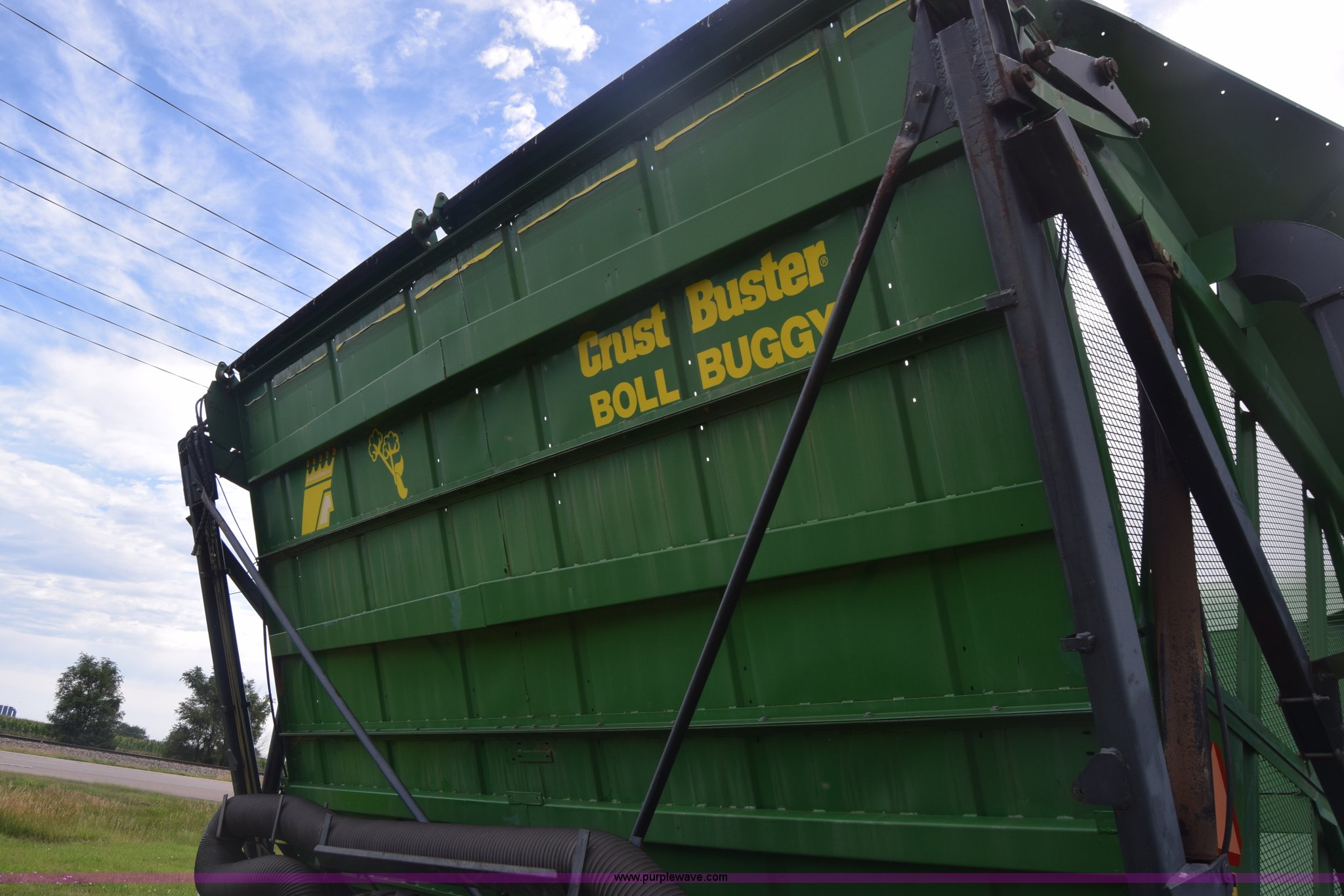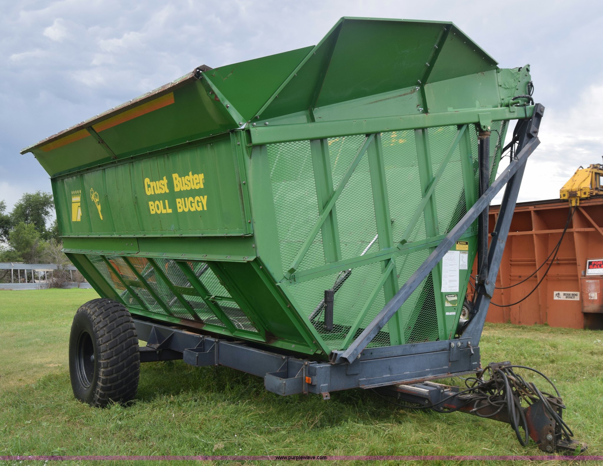 Purple Wave is selling a used Cotton Harvester Equip. in Kansas. This item is a CrustBuster boll buggy with the following: Approx. 18'L, CrustBuster boll vacuum system, 8" hose, Serial 16504, Lights, Hydraulic operation, Pin hitch, Single axle, 18.4-26 tires, Serial 16346