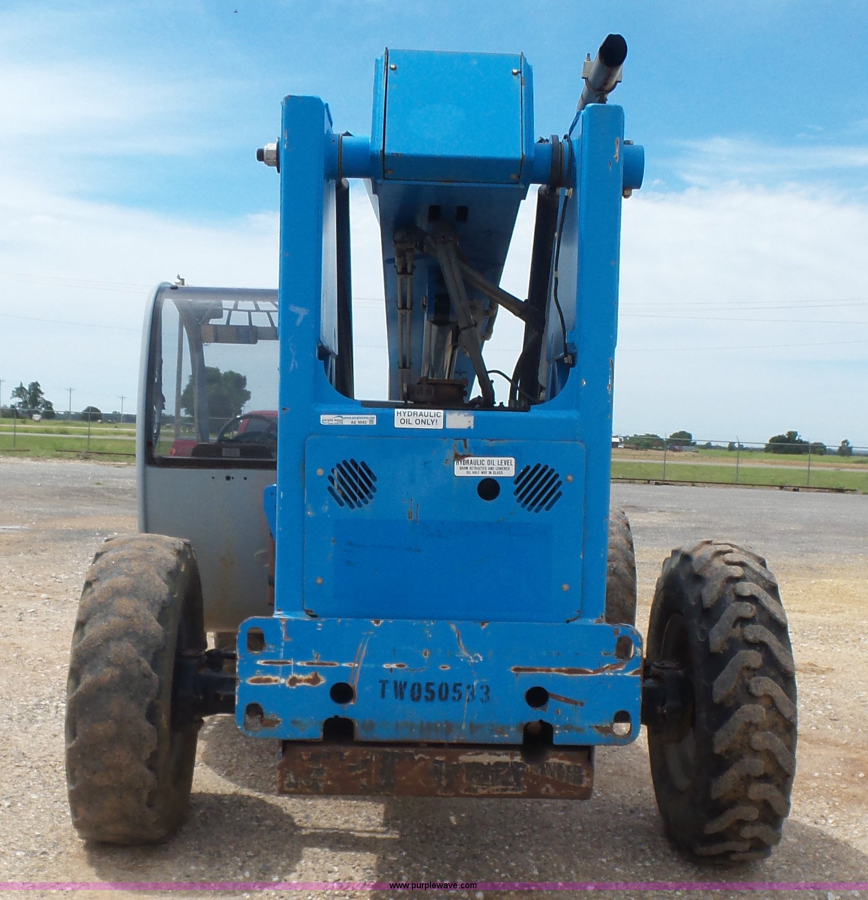 Purple Wave is selling a used Telehandler in Oklahoma. This item is a 2006 Genie GTH-842 telehandler with the following: 2,046 hours on meter, John Deere four cylinder turbo diesel engine, 99 HP, Powershift transmission, 3F-3R gears, Four wheel drive, Crab steer, Circle steer, ROPS, Vinyl seat, Work lights, 8,000 lbs maximum lift capacity, 42' maximum reach, (3) boom sections, Tilt carriage, Hydraulic level, 30 gallon fuel tank, 13.00-24 foam filled tires, 21,930 lbs. base operating weight, Serial GTH0806A-8885