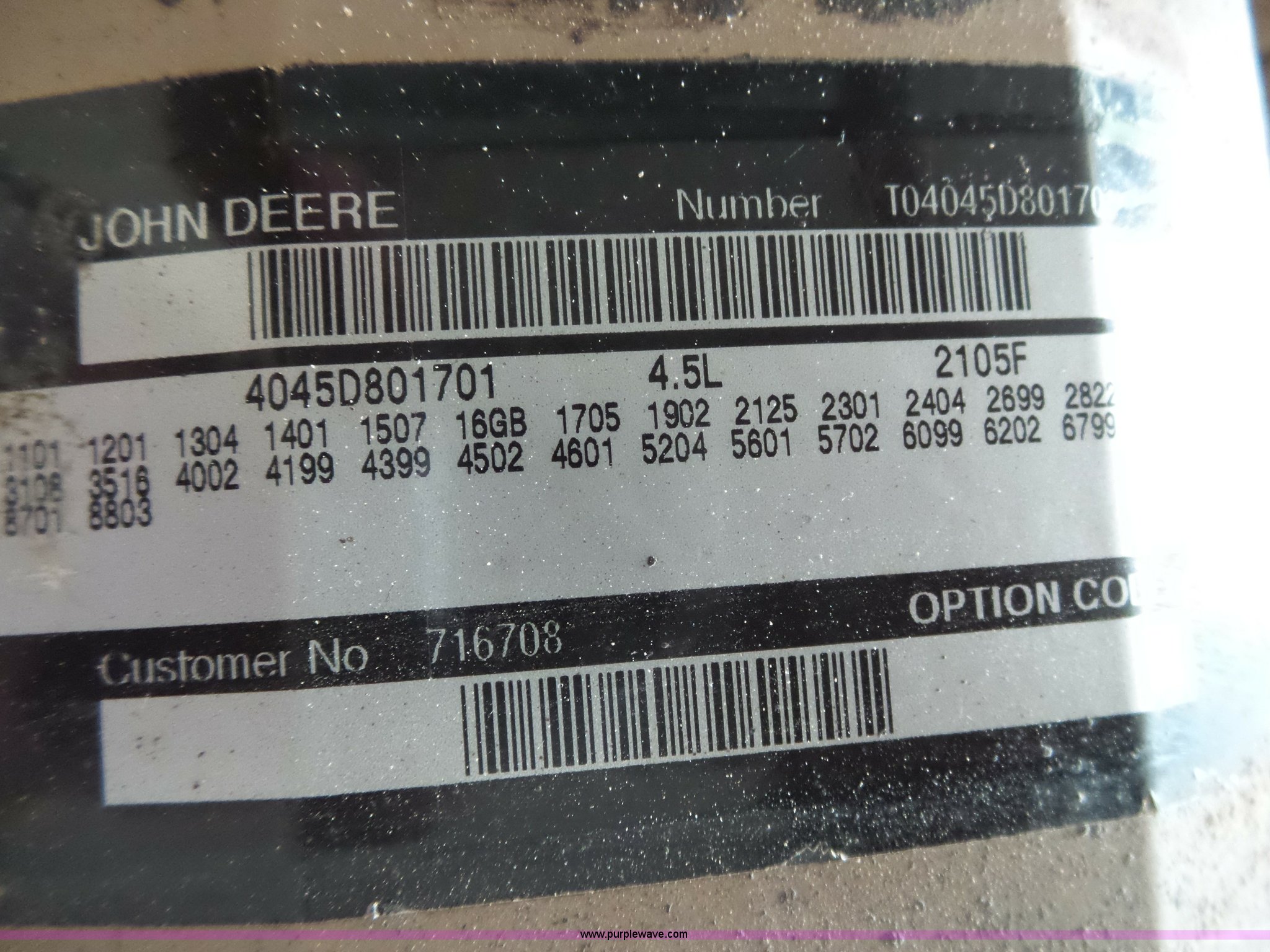 Purple Wave is selling a used Engine in Missouri. This item is a John Deere 4.5L four cylinder diesel engine with the following: Model 4045DF150B, Family No. XJDXL06.801L, Serial T04045D801701