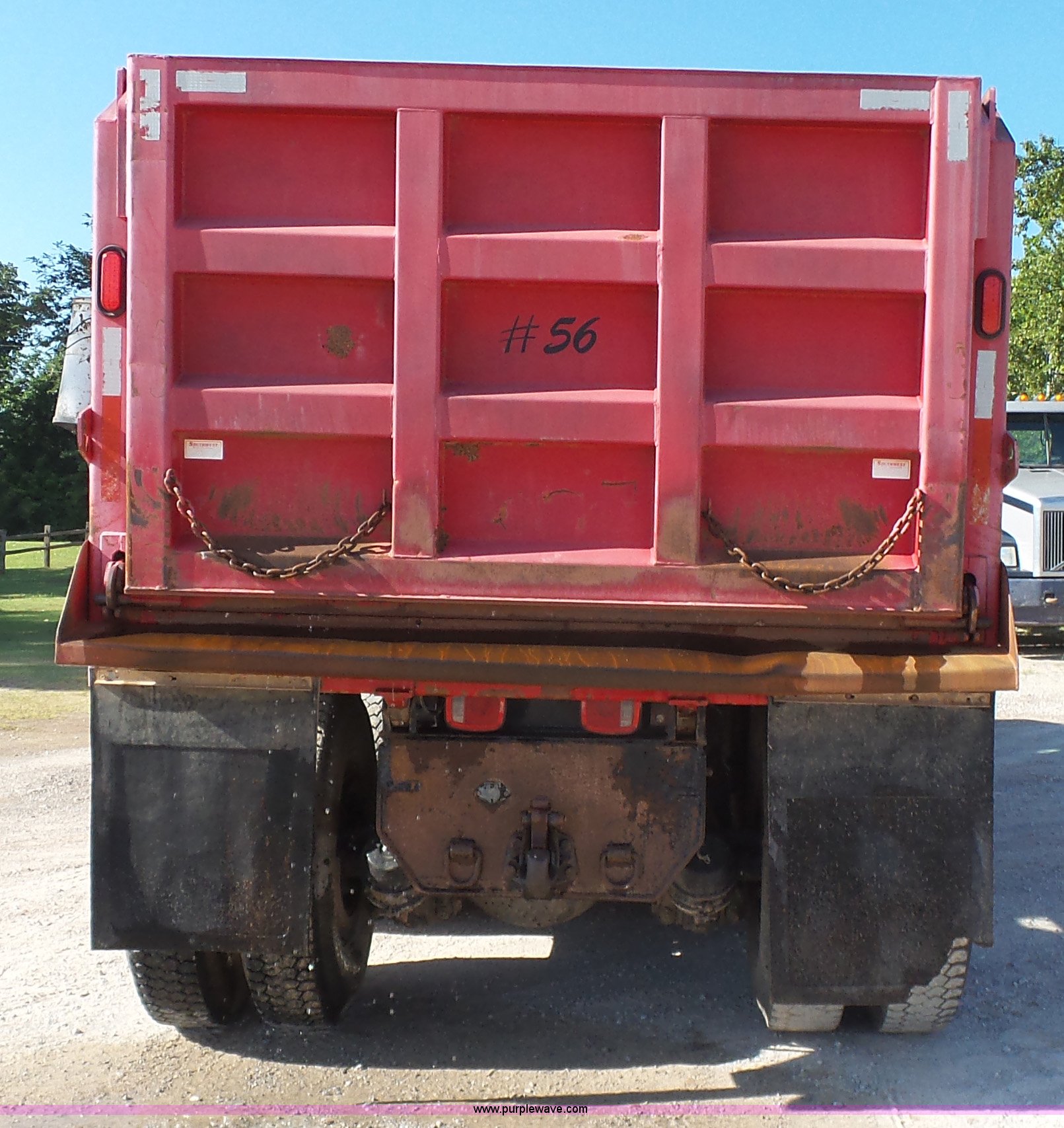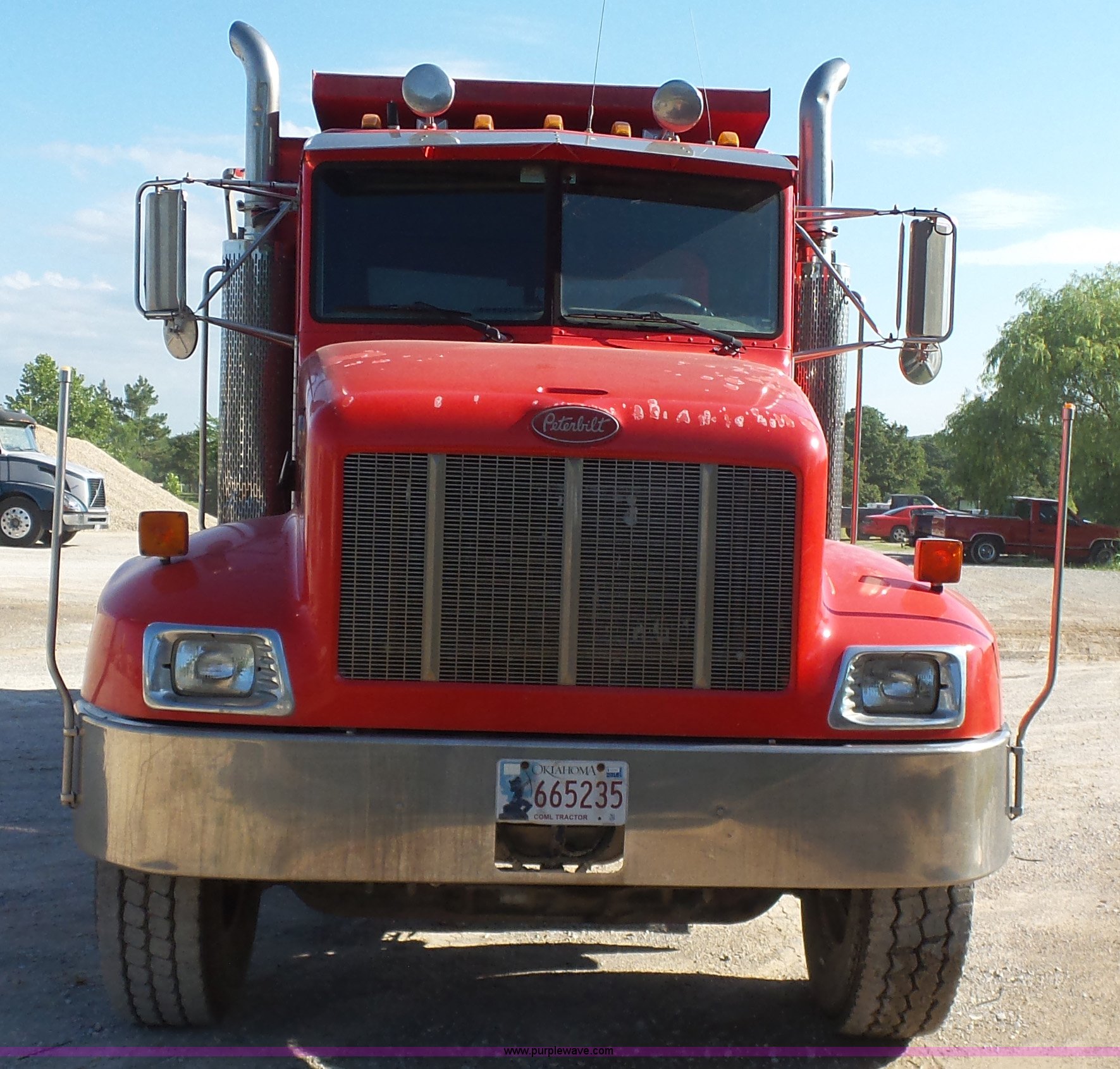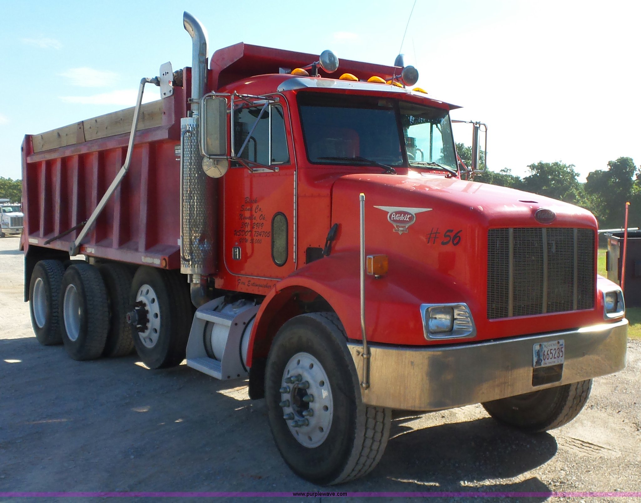 Purple Wave is selling a used Construction Dump Truck in Oklahoma. This item is a 2003 Peterbilt 330 dump truck with the following: 224,475 miles on odometer, 10,654 hours on meter, Caterpillar 3126 7.2L L6 turbo diesel engine, Eaton Fuller eight speed manual transmission, Tandem axle, Inter-axle differential lock, AC and heat, Tilt, Telescoping steering wheel, Cruise, AM/FM, Power and heated mirrors, Air suspension seat, Block heater, Air ride cab, Exterior visor, PTO, McLain 502F steel dump bed, Single ram hoist, Air operated end gate, Roll-over tarp, 15 ton capacity, Single fuel tank, Pintle hitch, Hendrickson suspension, Air brakes, Engine brake, 11R24.5 tires, FAWR 14,600 lbs, IAWR 20,000 lbs, RAWR 20,000 lbs, 20,000 lbs tag axle