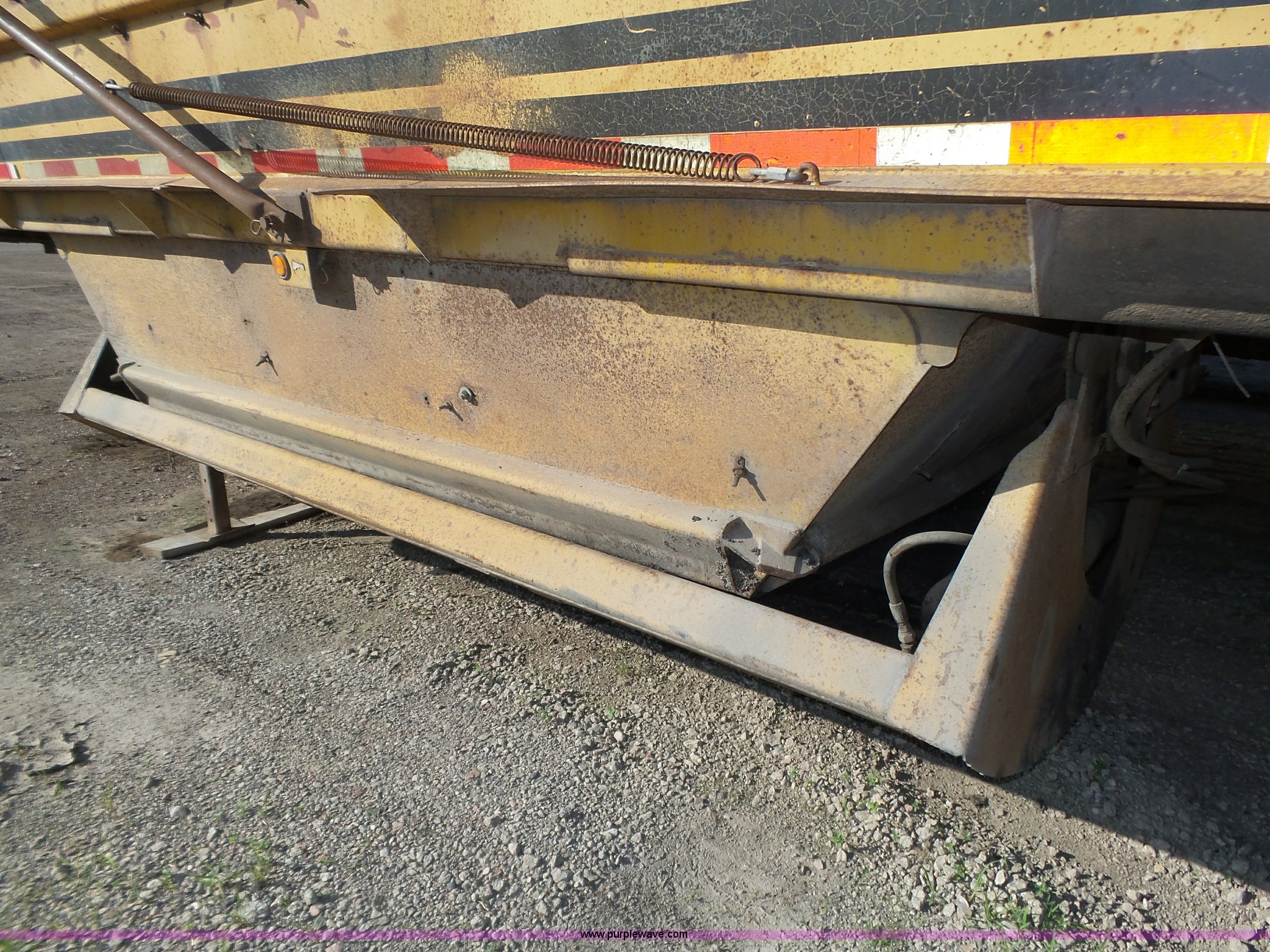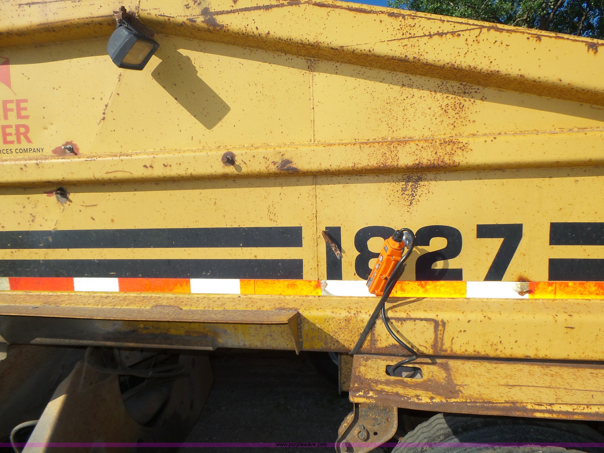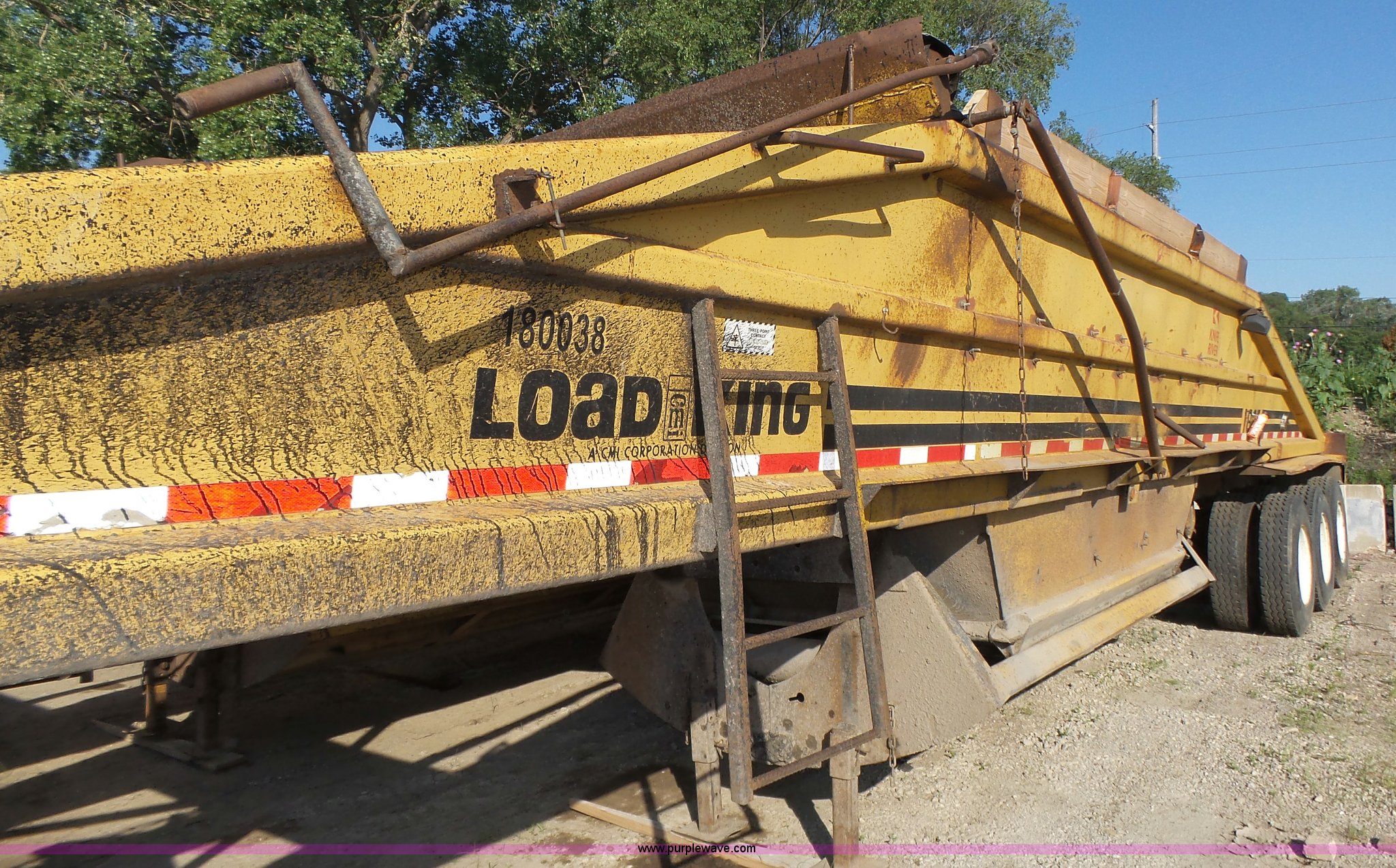 Purple Wave is selling a used Bottom Dump Trailer in Iowa. This item is a 1987 Load King 1827 bottom dump trailer with the following: 42' overall length, 96"W, 18 cubic yard capacity, 8" wood side boards, Steel construction, Dual pneumatic cylinders, Air operated clamshell gate, Tethered remote, Manual tarp, Rear push block, Dual leg landing gear, Fifth wheel plate, Triple axle, Spring suspension, Air brakes, Steel wheels, 11R22.5 tires, Unit# 180038