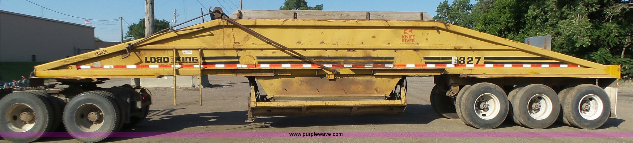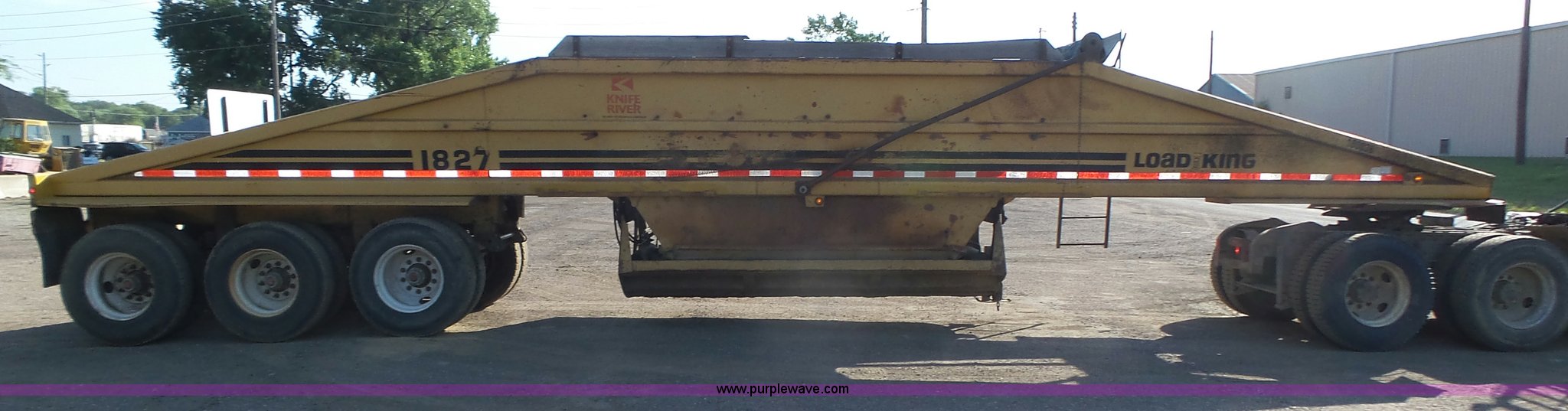 1987 Load King 1827-4-3 bottom dump trailer. 42' overall length, 96"W, 8" wood side boards, 18 cu. yd. capacity, Dual pneumatic cylinders, Air operated clamshell gate, Trailer controls, Manual tarp, Rear push block, Dual leg landing gear, Fifth wheel plate, Triple axle, Spring suspension, Air brakes, Steel wheels, 11R22.5 tires, GVWR 68,060 lbs, GAWR 14,400 lbs, 14,060 lbs tare weight, Rear gate control valve body will be installed prior to auction, Unit# 180036. Iowa title. 1L4B42336H1014750. Knife River Corporation. 2220 Hawkeye Drive. Sioux City, IA 51105