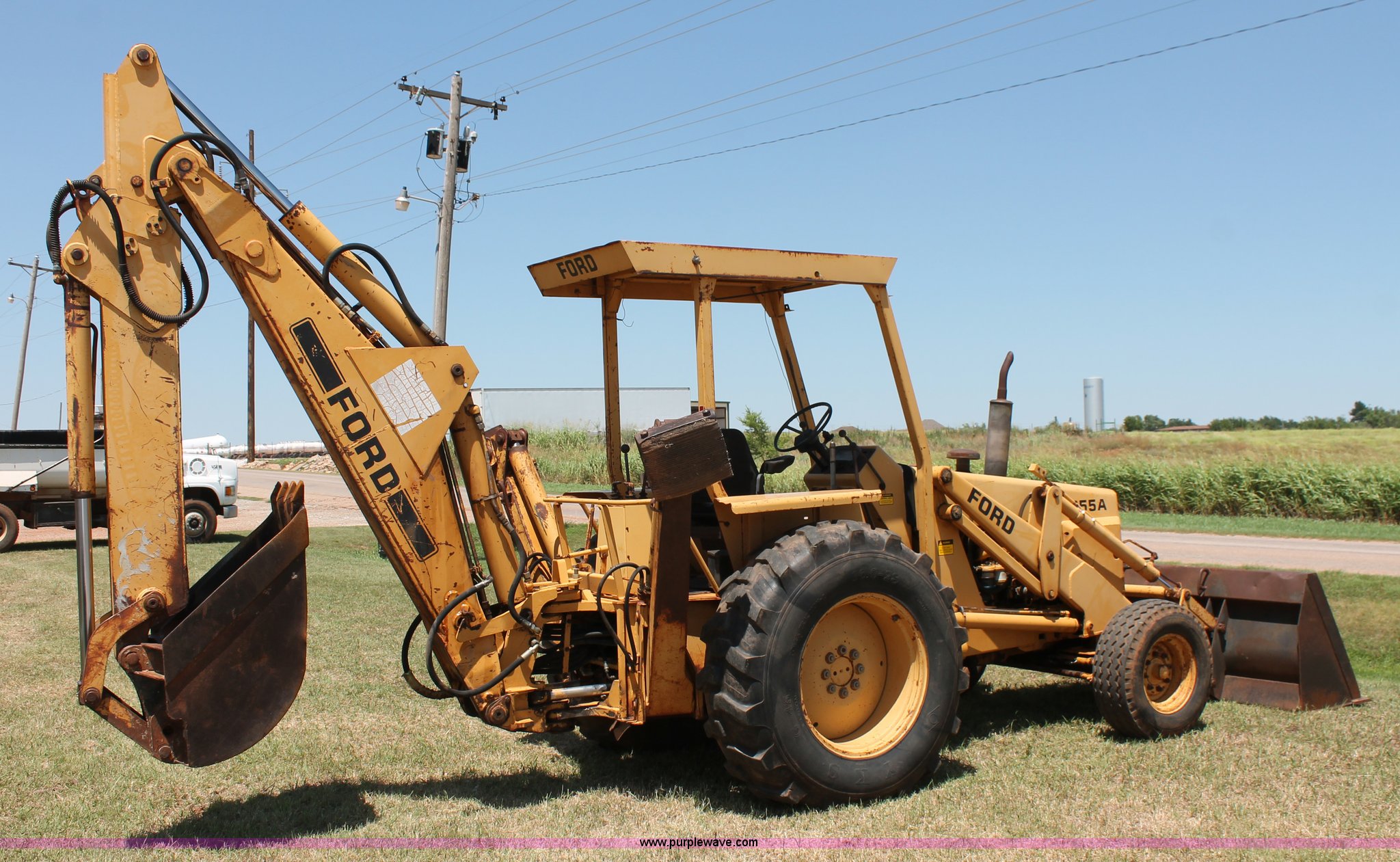 Purple Wave is selling a used Tractor Loader Backhoe in Oklahoma. This item is a Ford 655A backhoe with the following: 3,012 hours on meter, Ford 4.2L four cylinder diesel engine, 72 gross HP, 67 net HP, Shuttle shift transmission, 4F-4R gears, Differential lock, OROPS, Two stick backhoe controls, 84"W loader bucket, Bucket leveler, E-stick, 24'W backhoe bucket, (4) teeth, 11L-16SL front tires, 16.9-28 rear tires, Serial CB56501