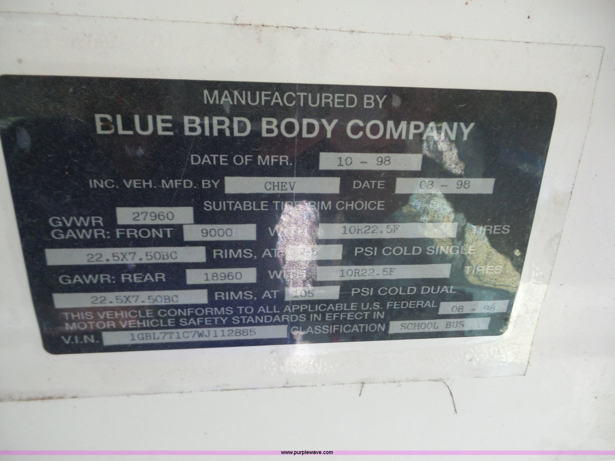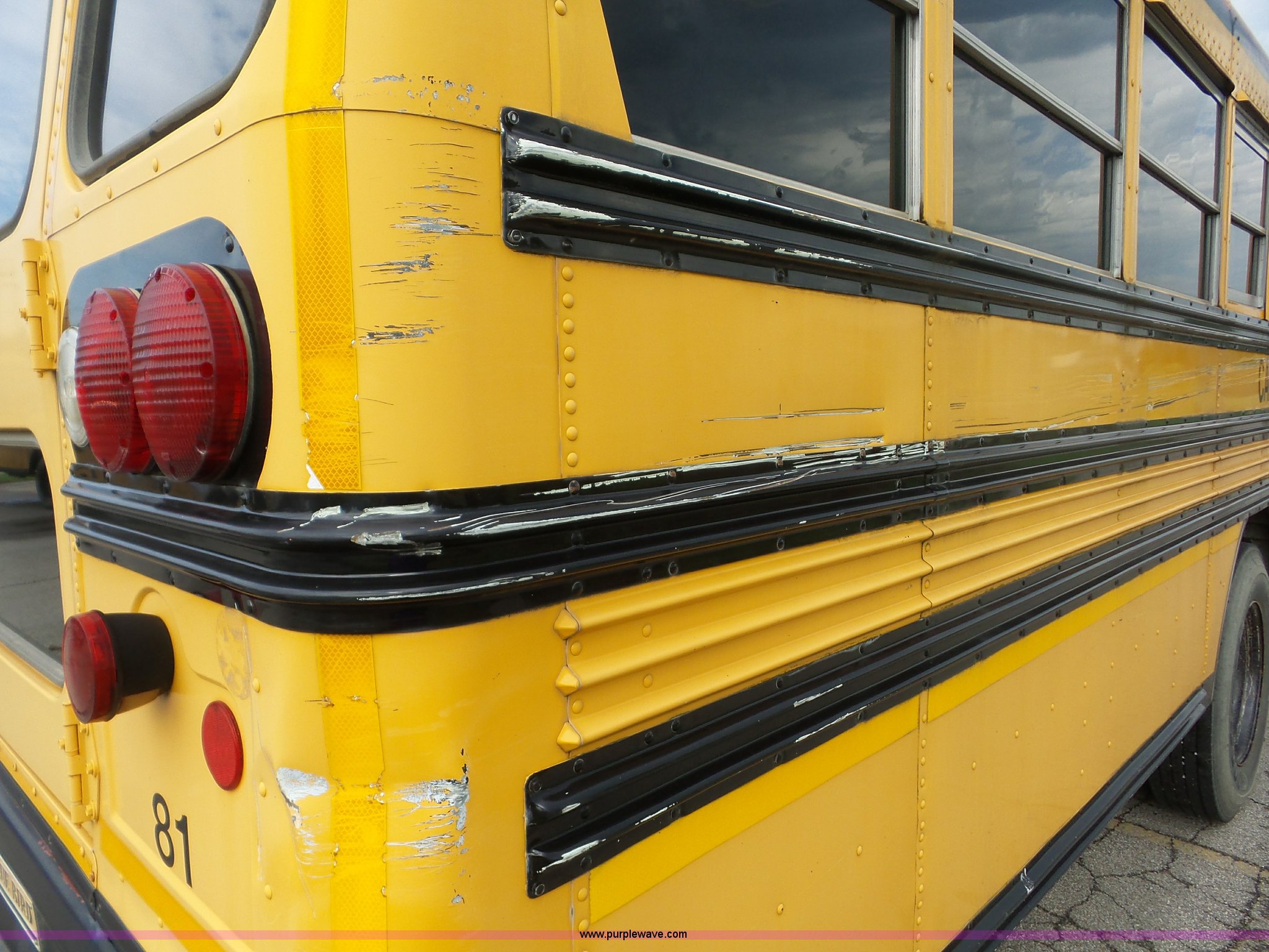 Purple Wave is selling a used Bus in Oklahoma. This item is a 1999 Chevrolet school bus with the following: 121,029 miles on odometer, Caterpillar 3126 7.2L six cylinder turbo diesel engine, Automatic transmission, Single axle, Heat, 65 passenger capacity, Ceiling, front, and rear emergency egress, Lighted stop sign, Blue Bird body, Spring suspension, 10R22.5 tires, GVWR 27,960 lbs, Unit# 81