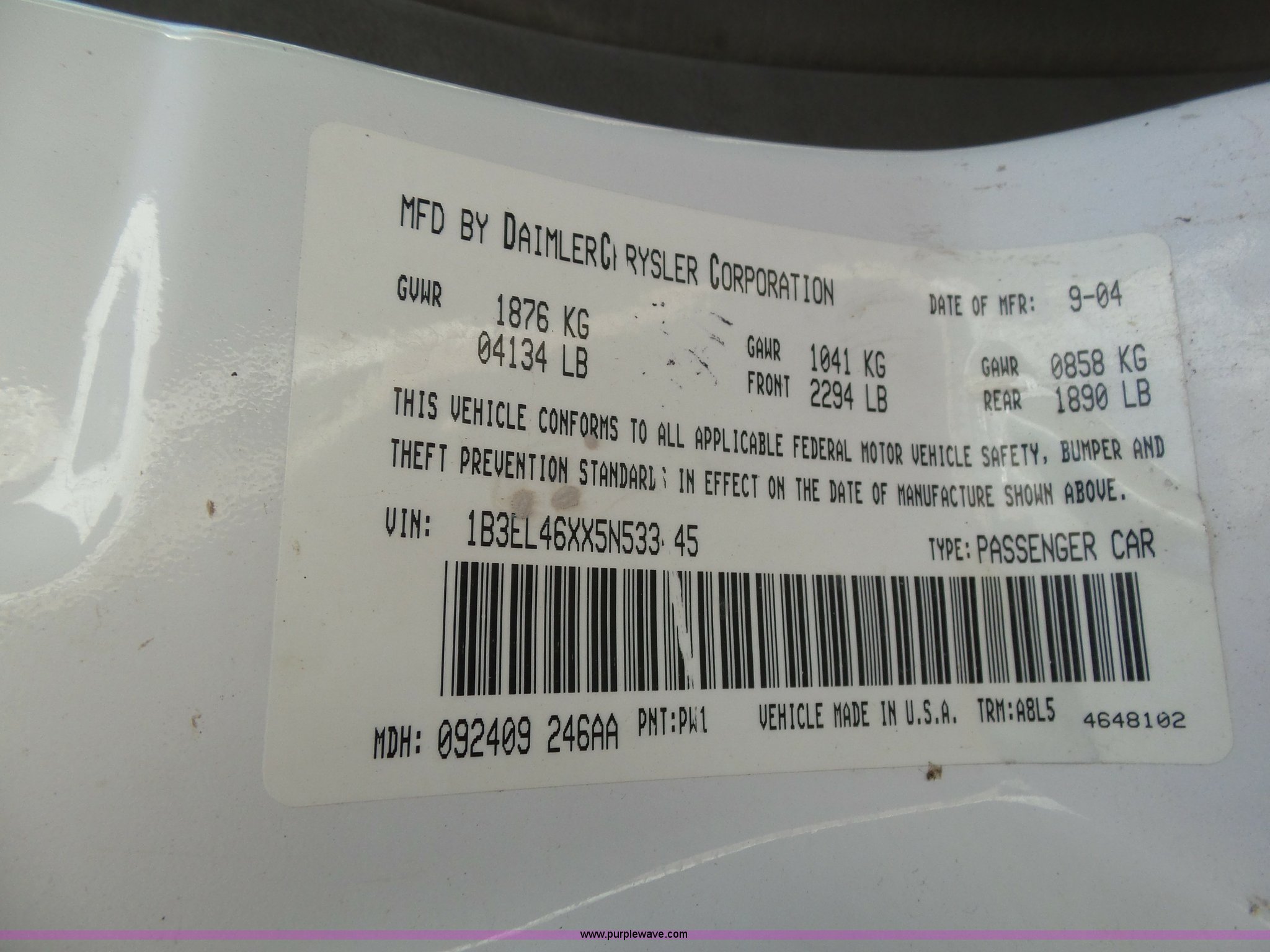 Purple Wave is selling a used Passenger Vehicle in Kansas. This item is a 2005 Dodge Stratus with the following: Unknown miles on odometer, 2.4L L4 DOHC 16V gas engine, Automatic transmission, AC and heat, Tilt, Cruise, AM/FM, Power windows, locks, and mirrors, Cloth interior, 205/70R15 tires, Hail damage, Unknown operating condition