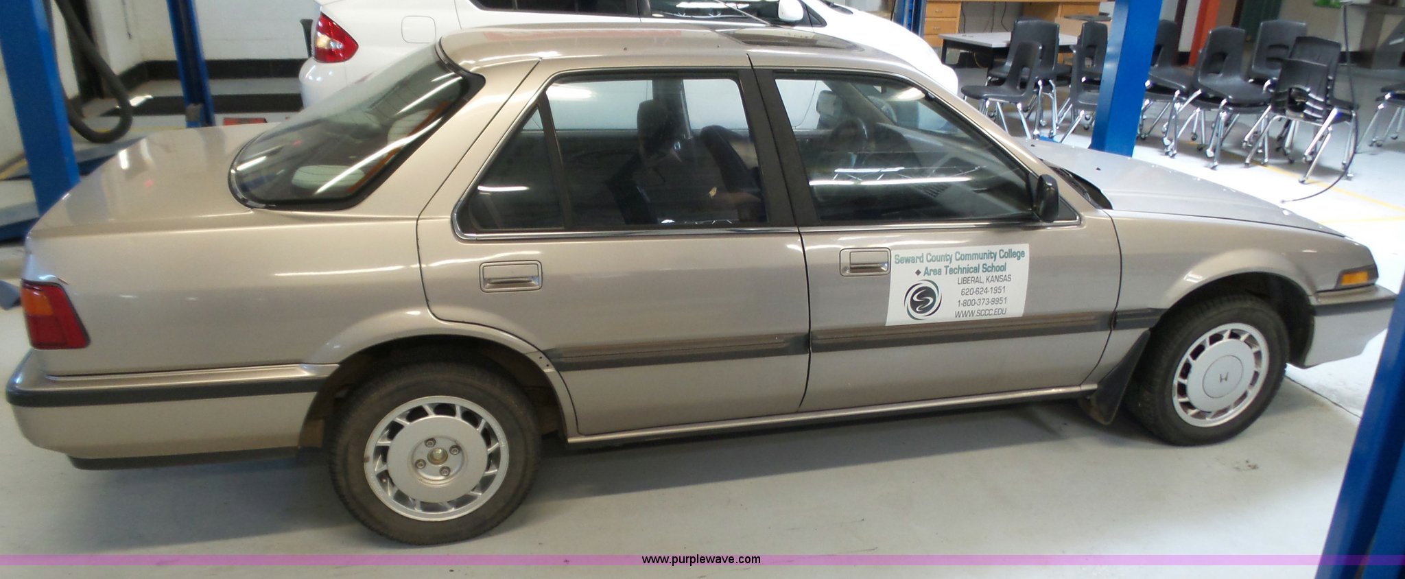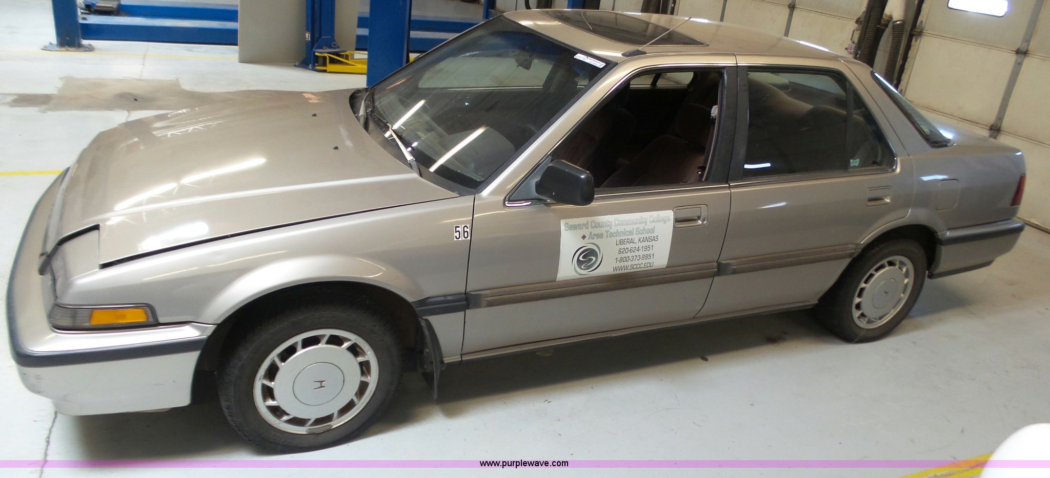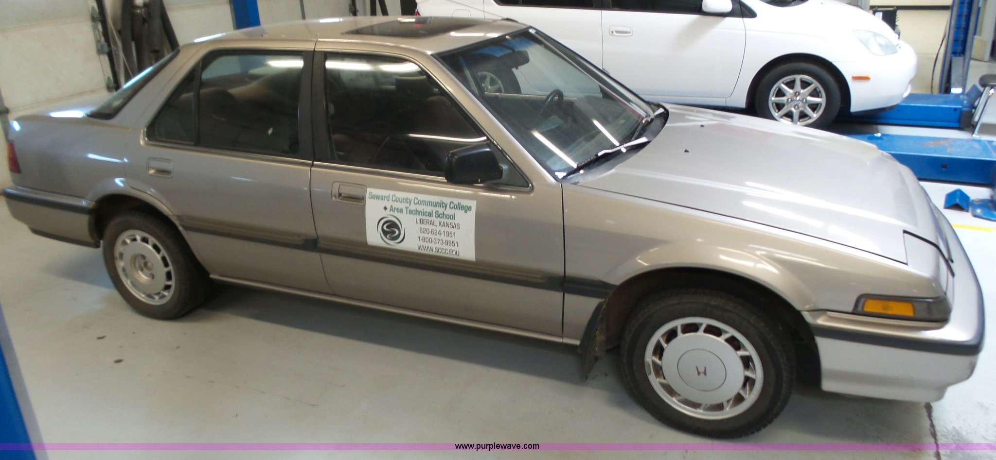1989 Honda Accord LXI. 178,924 miles on odometer, 2.0L L4 SOHC 16V gas engine, Automatic transmission, AC and heat, Cruise, AM/FM/cassette, Power windows, locks, and mirrors, Cloth interior, Power sunroof, P195/60R14 tires, Engine oil leak, Unknown operating condition, possible battery issue, Unit# 56. Kansas title. JHMCA5642KC092343. Seward County Community College. 2215 N Kansas Ave. Liberal, KS 67905