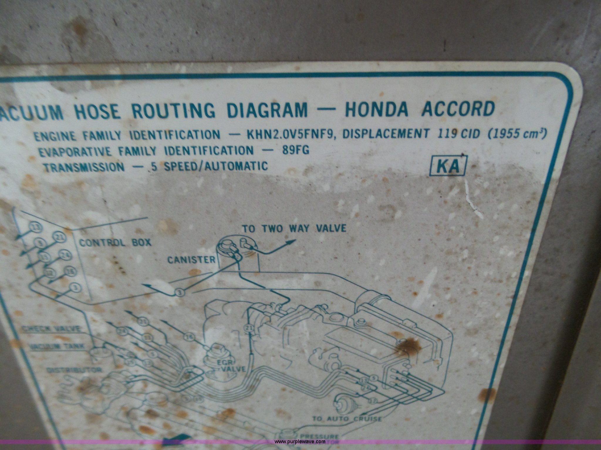 Purple Wave is selling a used Passenger Vehicle in Kansas. This item is a 1989 Honda Accord LXI with the following: 178,924 miles on odometer, 2.0L L4 SOHC 16V gas engine, Automatic transmission, AC and heat, Cruise, AM/FM/cassette, Power windows, locks, and mirrors, Cloth interior, Power sunroof, P195/60R14 tires, Engine oil leak, Unknown operating condition, possible battery issue, Unit# 56