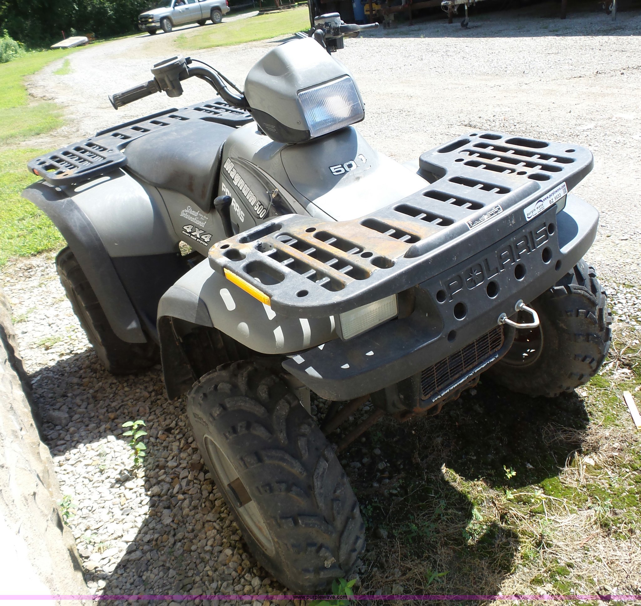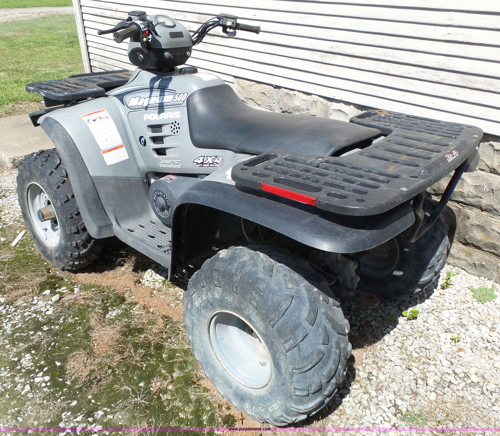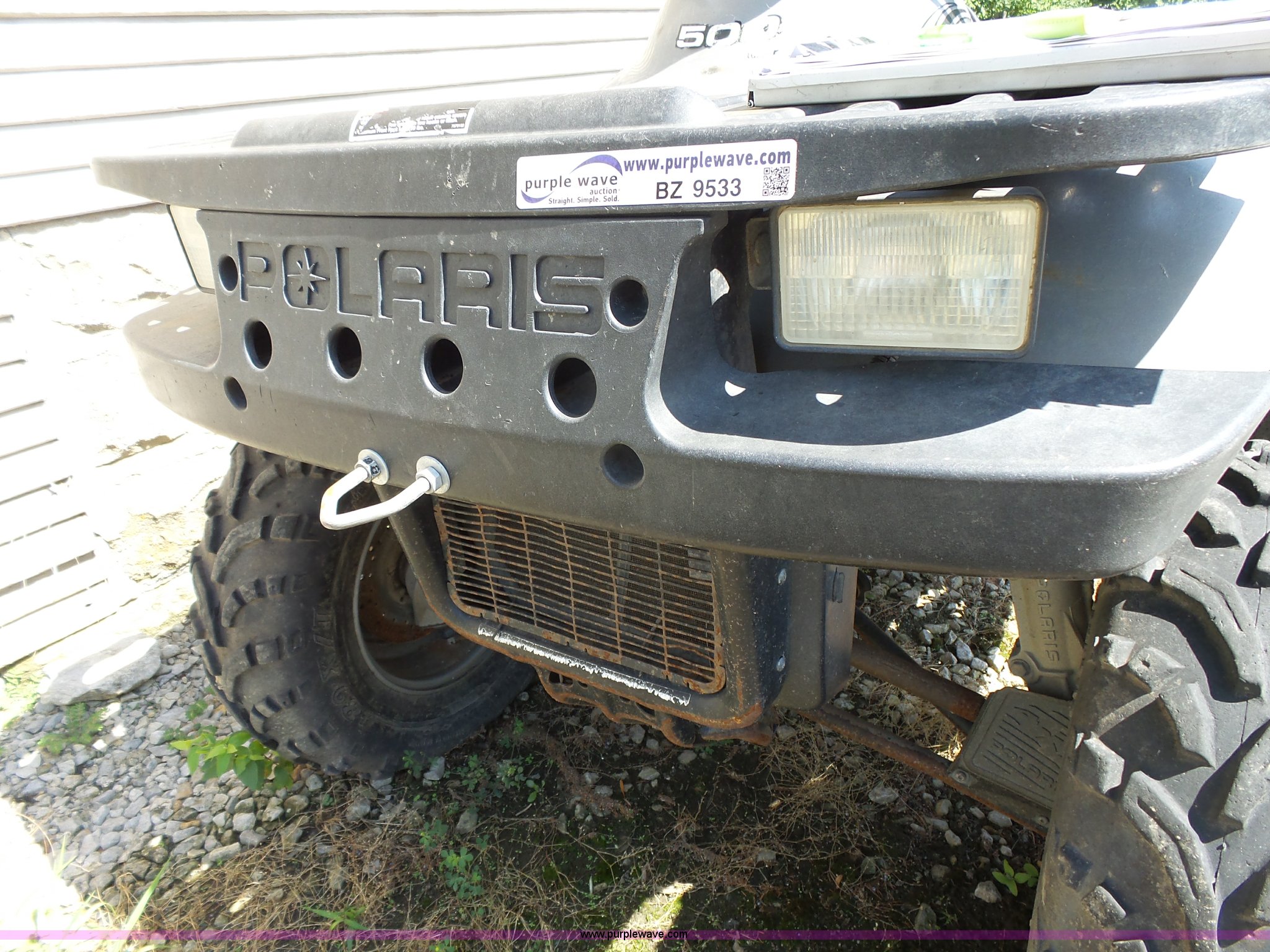 Purple Wave is selling a used ATV in Kansas. This item is a 2001 Polaris 500 ATV with the following: Gas engine, Automatic transmission, Four wheel drive, 25x8-12 front tires, 25x11-10 rear tires, No keys, Unknown operating condition