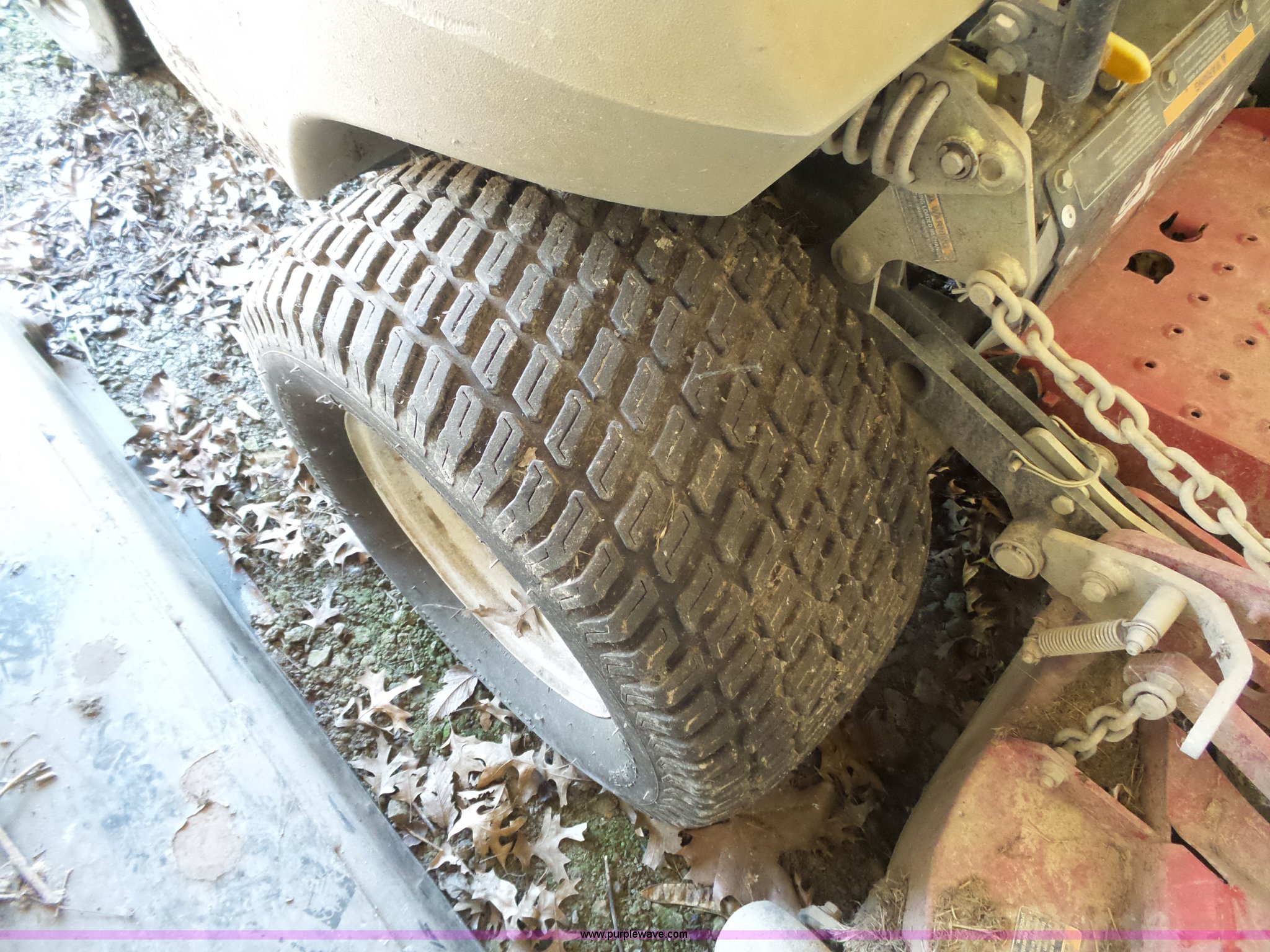 Purple Wave is selling a used Lawn Mower in Kansas. This item is a Exmark Frontrunner lawn mower with the following: 349 hours on meter, 60" cut, Kubota three cylinder diesel engine, 24x12.00-12 front tires, 13x6.50-6 rear tires, Drive shaft belt slips off, Drive shaft bearing needs replaced, Unknown operating condition