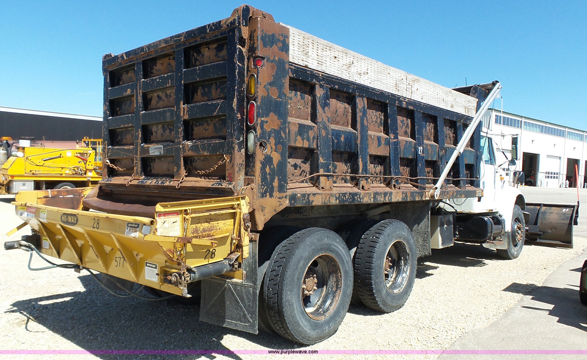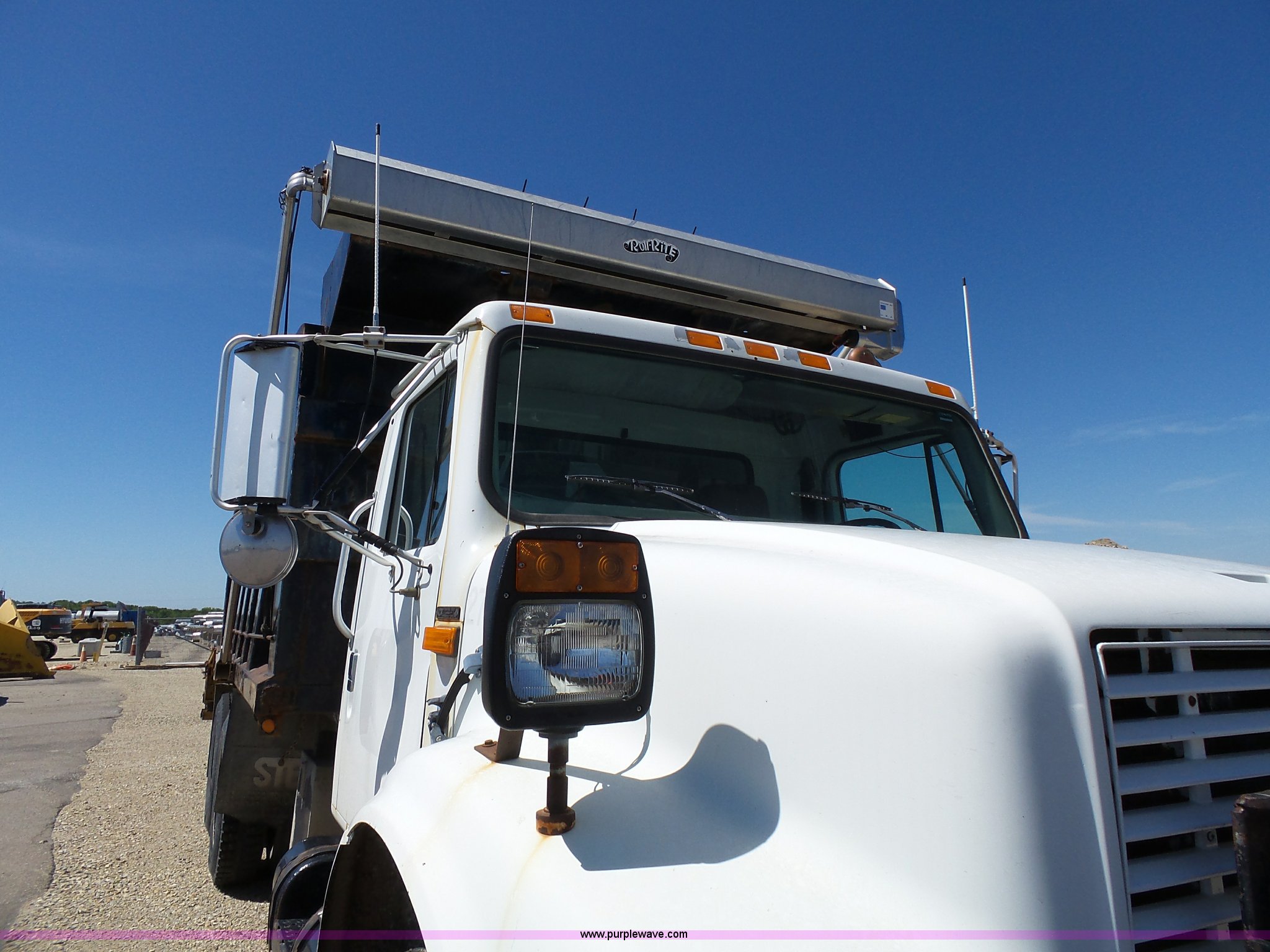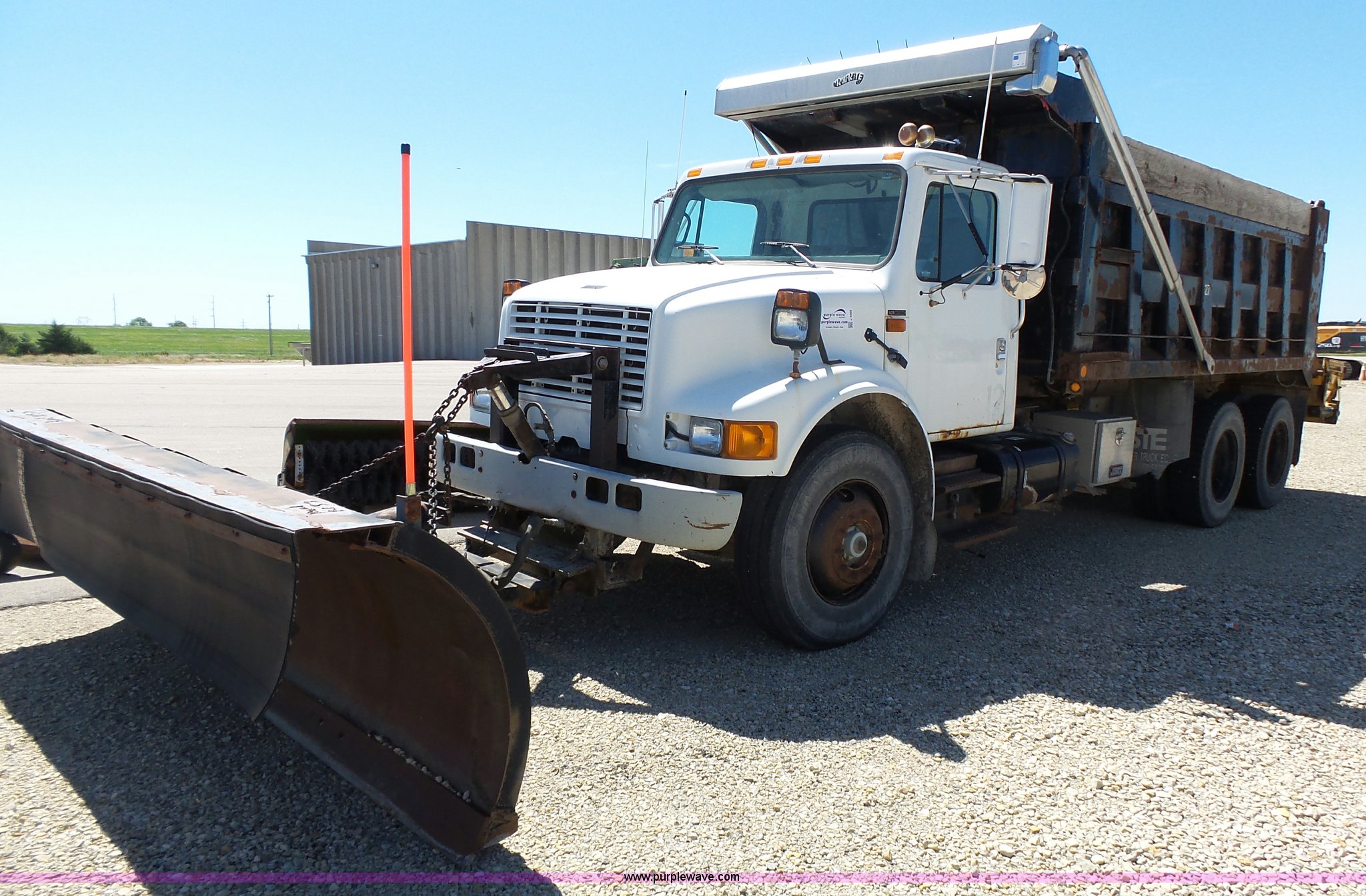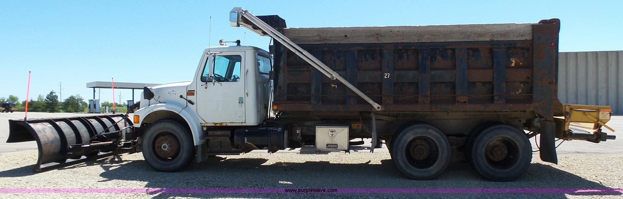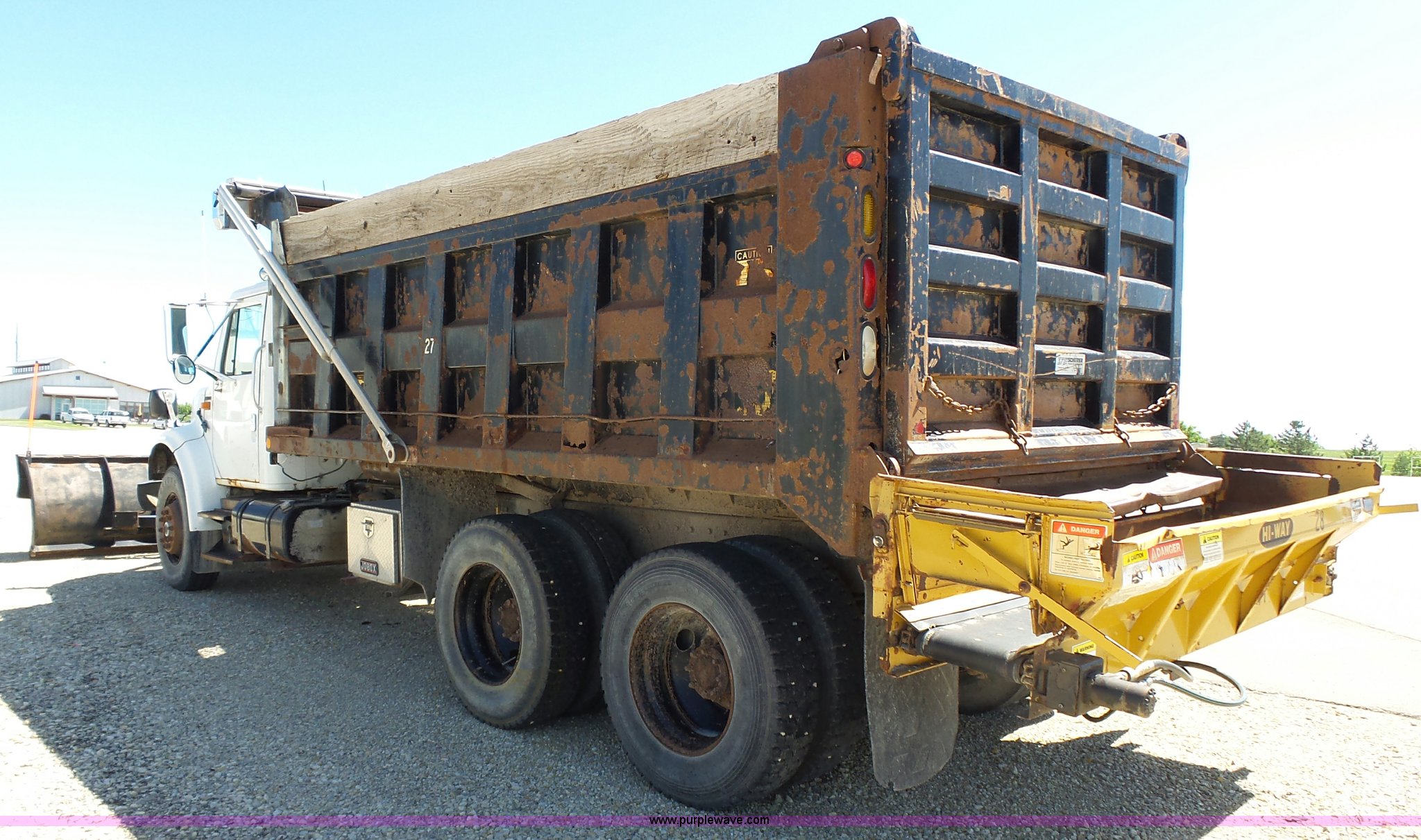 Purple Wave is selling a used Construction Dump Truck in Kansas. This item is a 1997 International 4900 dump truck with the following: 361,532 miles on odometer, 15,412 hours on meter, International DT530 8.7L L6 turbo diesel engine, Automatic transmission, Tandem axle, Inter-axle differential lock, Heat, Tilt, Telescoping steering wheel, AM/FM/weatherband, Heated mirrors, Air suspension seat, Uniden CB radio, Block heater, Chelsea PTO, Galion 700E steel dump bed, 16'L x 8'W, 4' side height, 12" side board height, Rollover tarp, Single ram hoist, 2000 Highway tailgate conveyor, Model T6C-18, 98", Serial 111916,, Toolbox, 11'W plow, Side markers, Swenson/Greesen 6RS11 spreader, Dual fuel tanks, 50 and 56 gallon capacities, Spring suspension, Hydraulic brakes, 18' wheelbase, 12R22.5 tires, Interior/exterior cosmetic damage, Rust, Additional parts included, Unit# 27,28