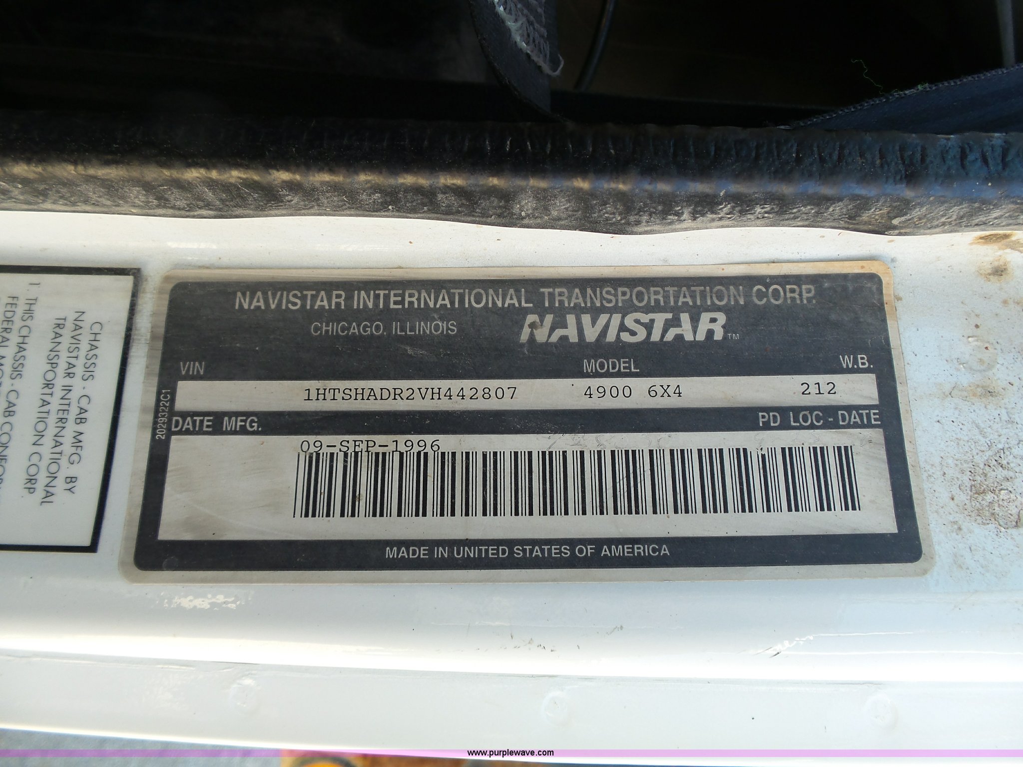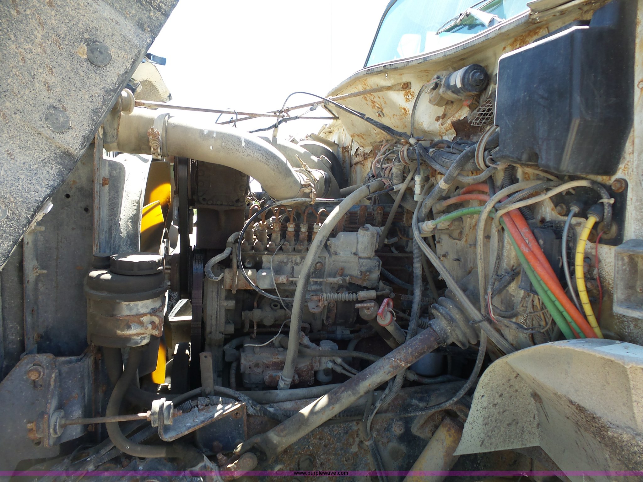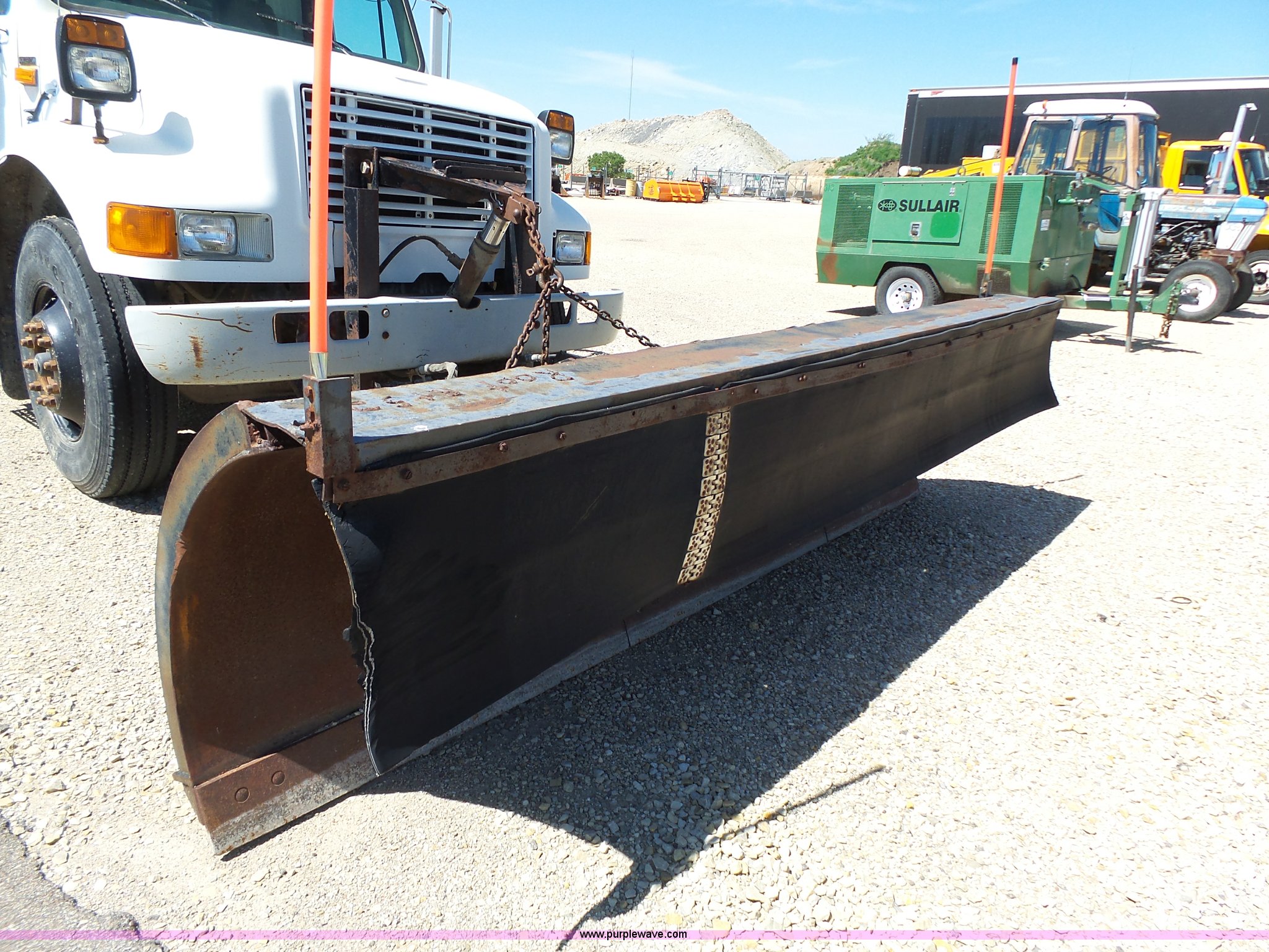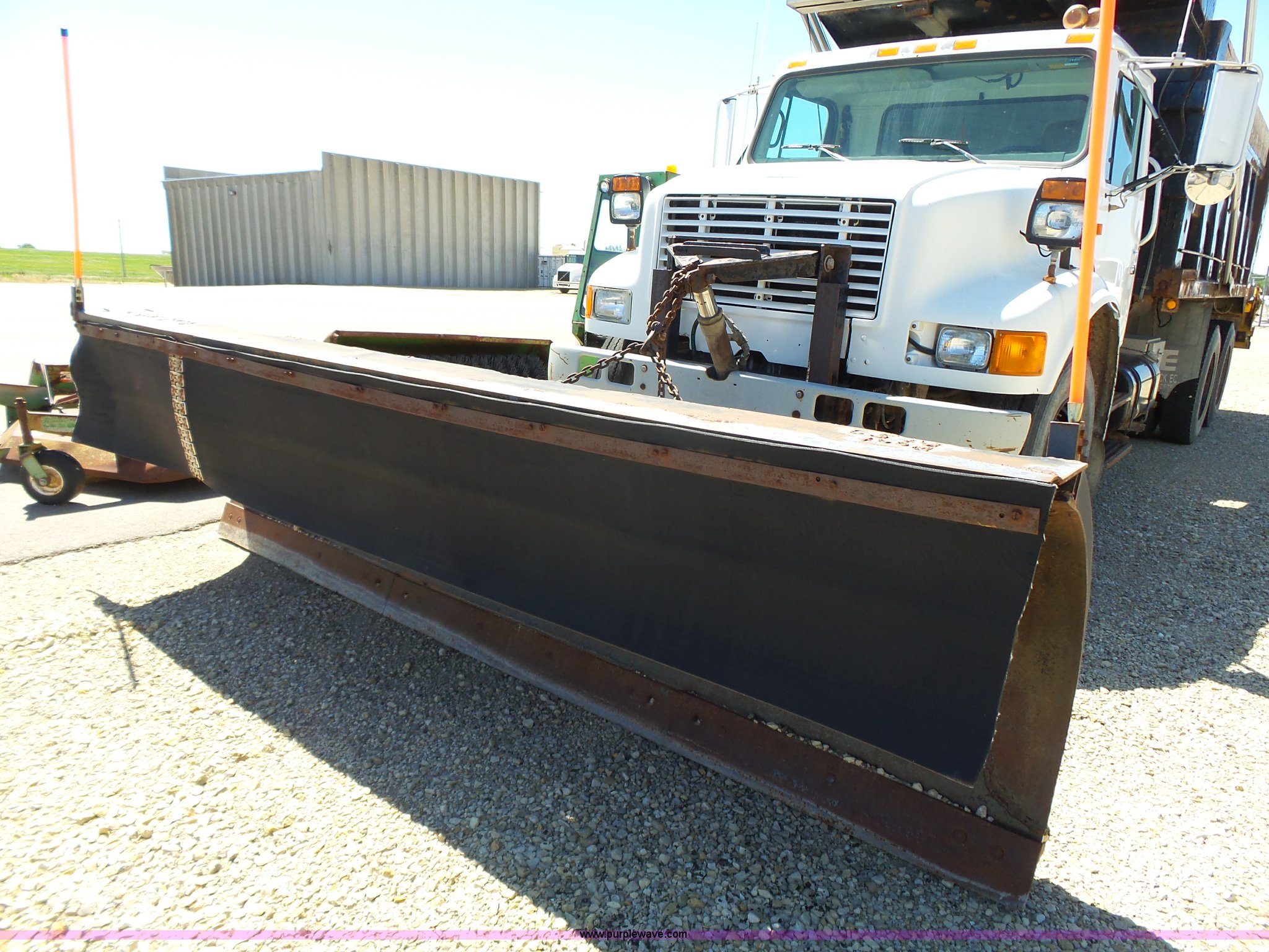 Purple Wave is selling a used Construction Dump Truck in Kansas. This item is a 1997 International 4900 dump truck with the following: 361,532 miles on odometer, 15,412 hours on meter, International DT530 8.7L L6 turbo diesel engine, Automatic transmission, Tandem axle, Inter-axle differential lock, Heat, Tilt, Telescoping steering wheel, AM/FM/weatherband, Heated mirrors, Air suspension seat, Uniden CB radio, Block heater, Chelsea PTO, Galion 700E steel dump bed, 16'L x 8'W, 4' side height, 12" side board height, Rollover tarp, Single ram hoist, 2000 Highway tailgate conveyor, Model T6C-18, 98", Serial 111916,, Toolbox, 11'W plow, Side markers, Swenson/Greesen 6RS11 spreader, Dual fuel tanks, 50 and 56 gallon capacities, Spring suspension, Hydraulic brakes, 18' wheelbase, 12R22.5 tires, Interior/exterior cosmetic damage, Rust, Additional parts included, Unit# 27,28