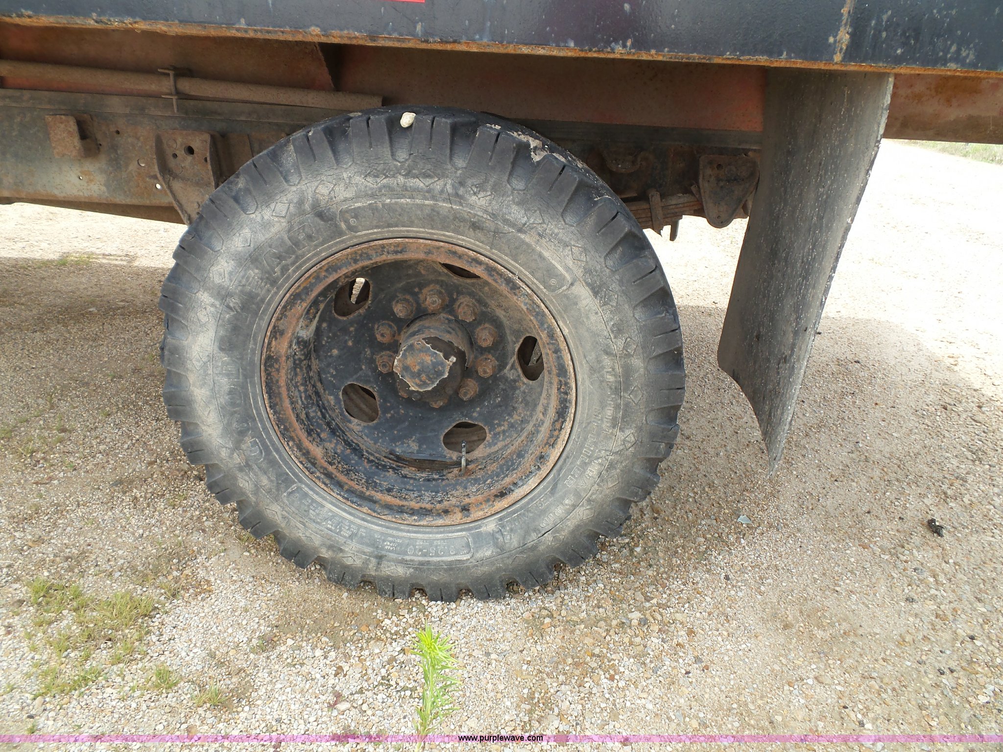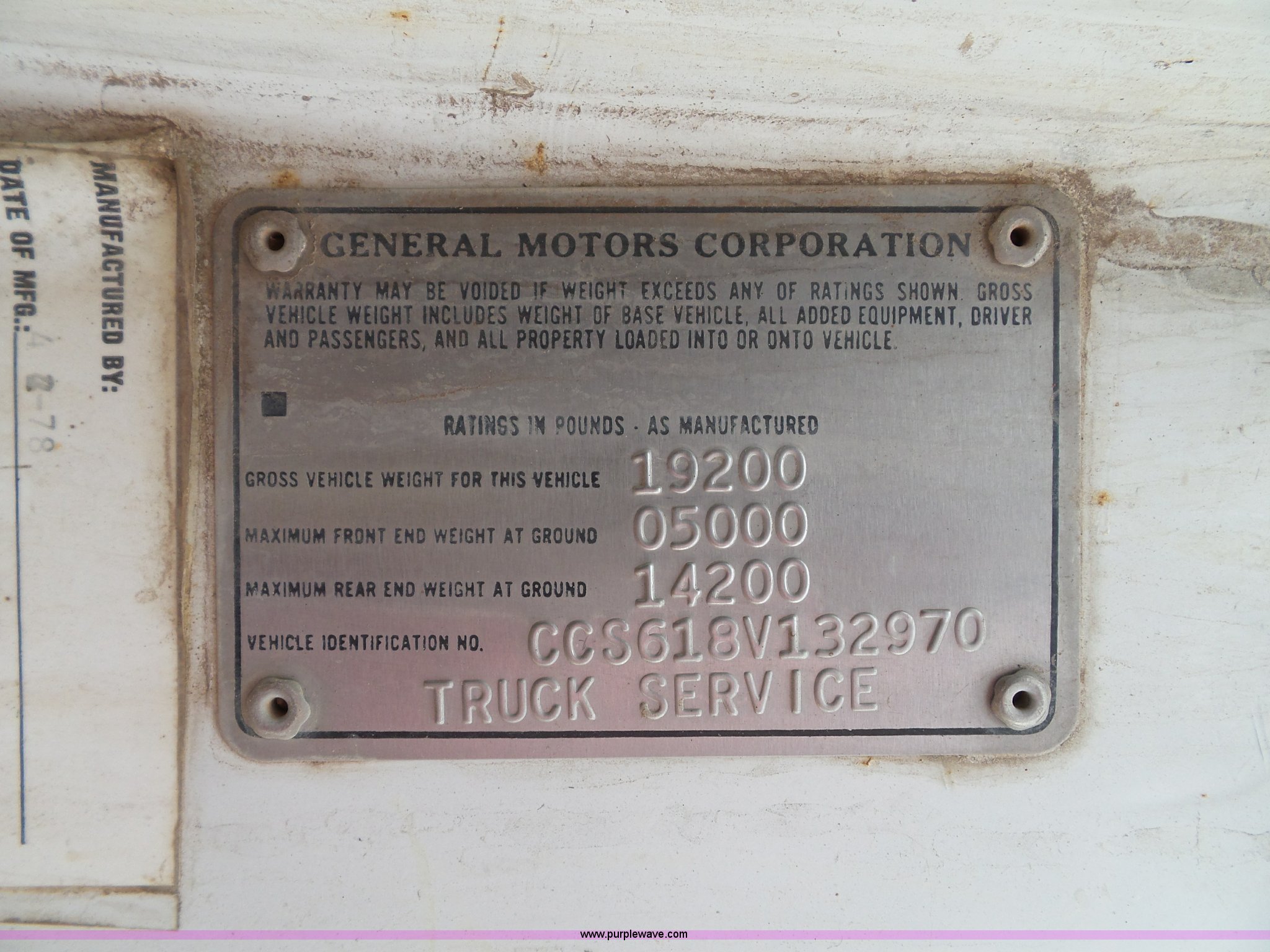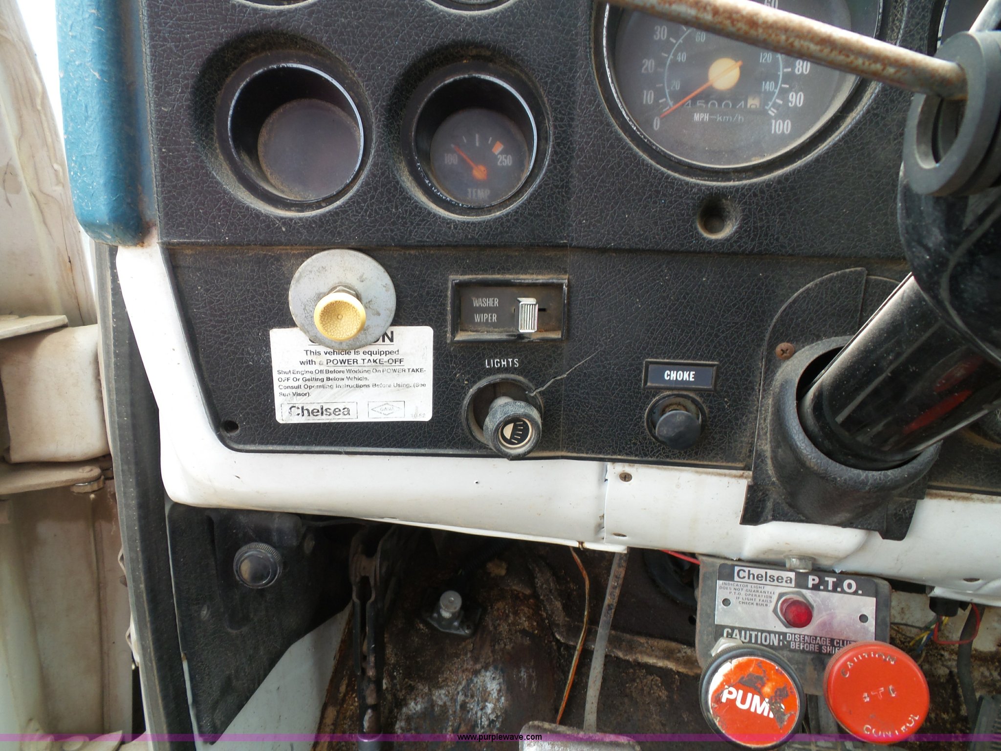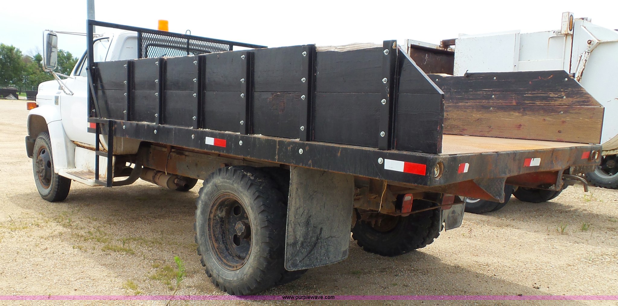 Purple Wave is selling a used Construction Dump Truck in Kansas. This item is a 1978 Chevrolet C60 dump truck with the following: 45,004 miles on odometer, Gas engine, Four speed manual transmission, Single axle, Heat, AM/FM, Vinyl interior, Strobe light, Chelsea PTO, 14'L x 8'W steel dump bed, 23"H wood sides, Single fuel tank, Spring suspension, Hydraulic brakes, 168" wheelbase, 8.25-20 tires, GVWR 19,200 lbs, FAWR 5,000 lbs, RAWR 14,200 lbs, Rust, Rear interior tires flat, Wipers inoperable, Unit# 4