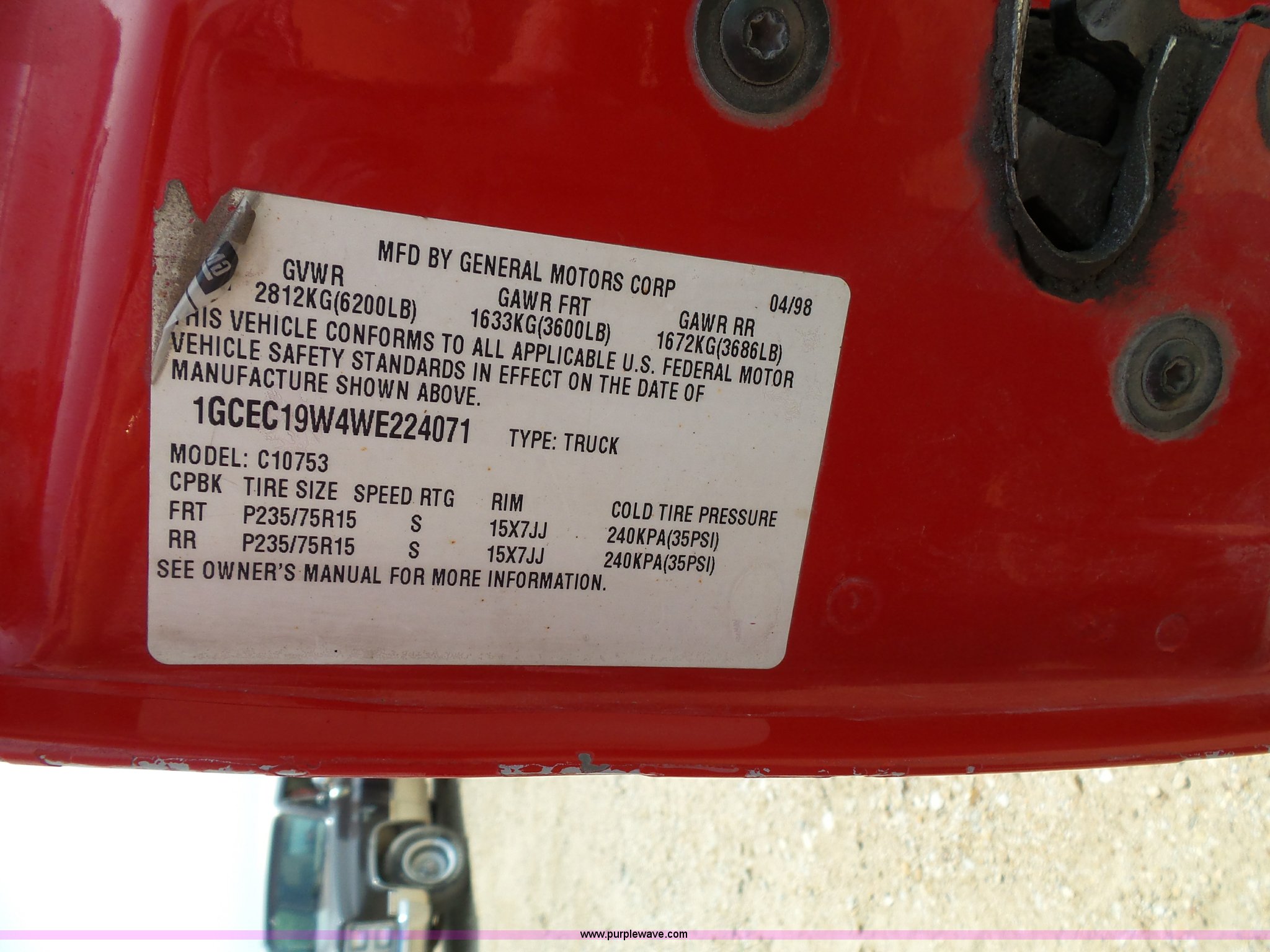 Purple Wave is selling a used 1/2 Ton Pickup or Van in Kansas. This item is a 1998 Chevrolet 1500 Ext. Cab pickup truck with the following: 125,006 miles on odometer, 4.3L V6 OHV 12V gas engine, Automatic transmission, AC and heat, Tilt, Cruise, AM/FM/cassette, Manual windows, Power locks and seat, Cloth interior, Bed liner, (2) ball hitches, Receiver hitch, Trailer wiring, 235/75R15 tires, Center console arm rest missing