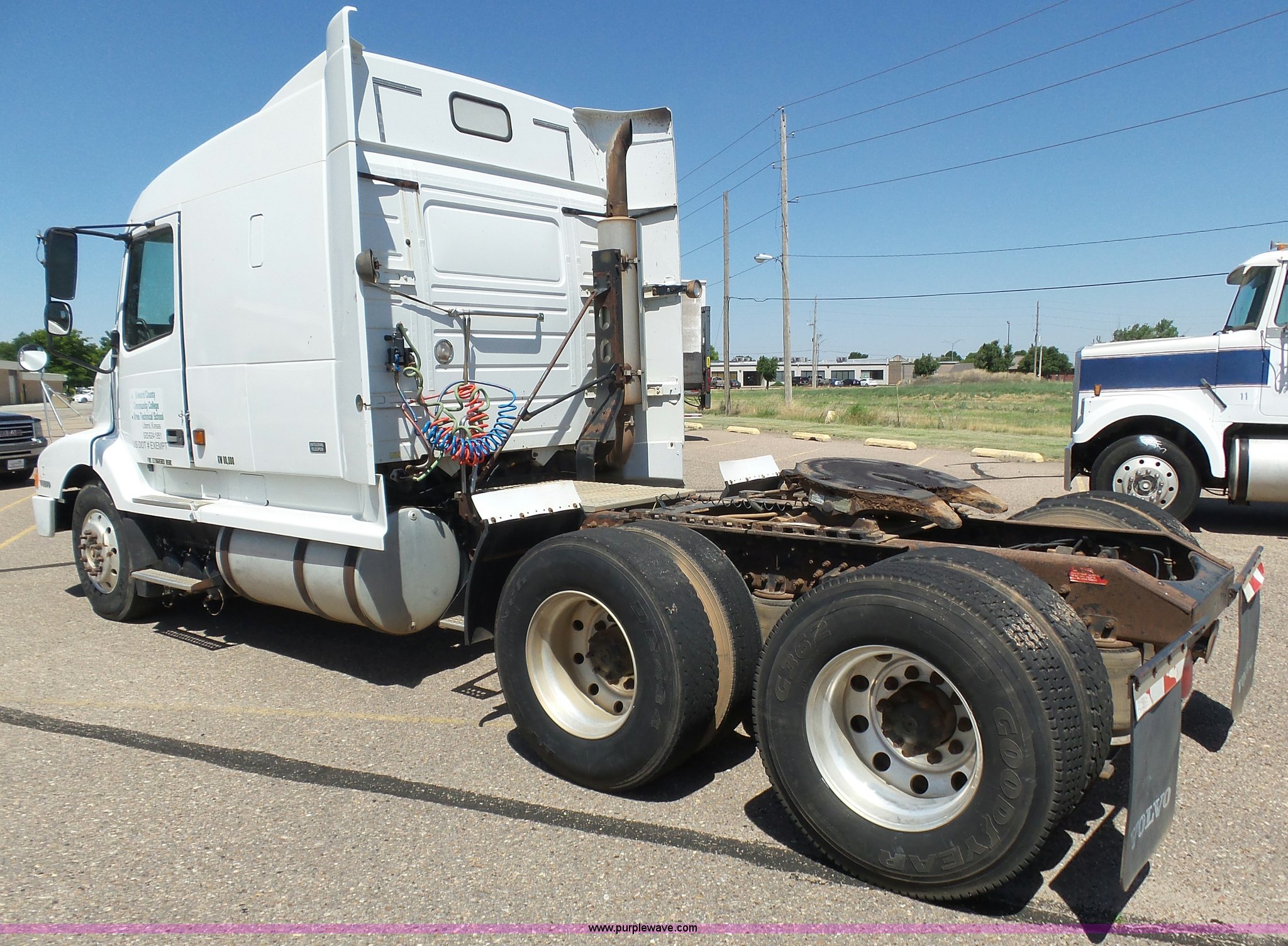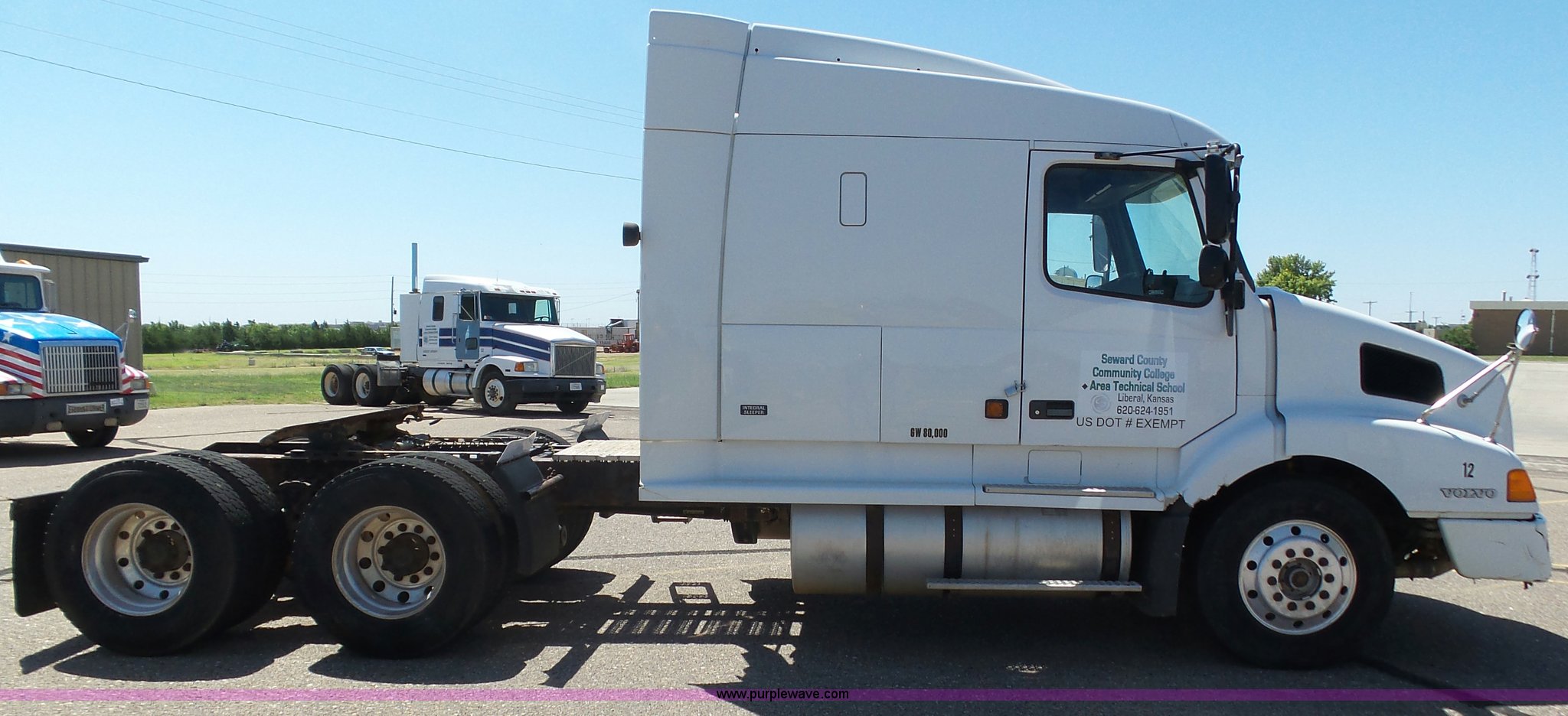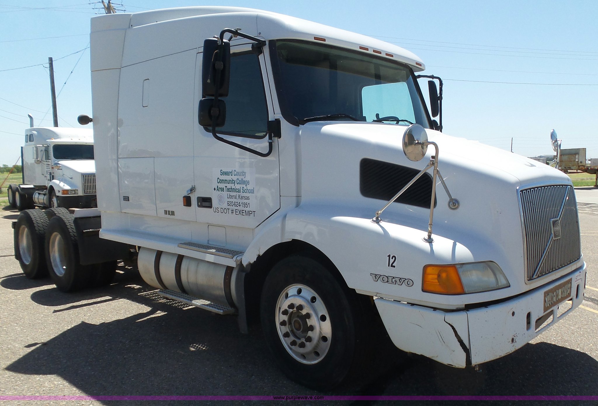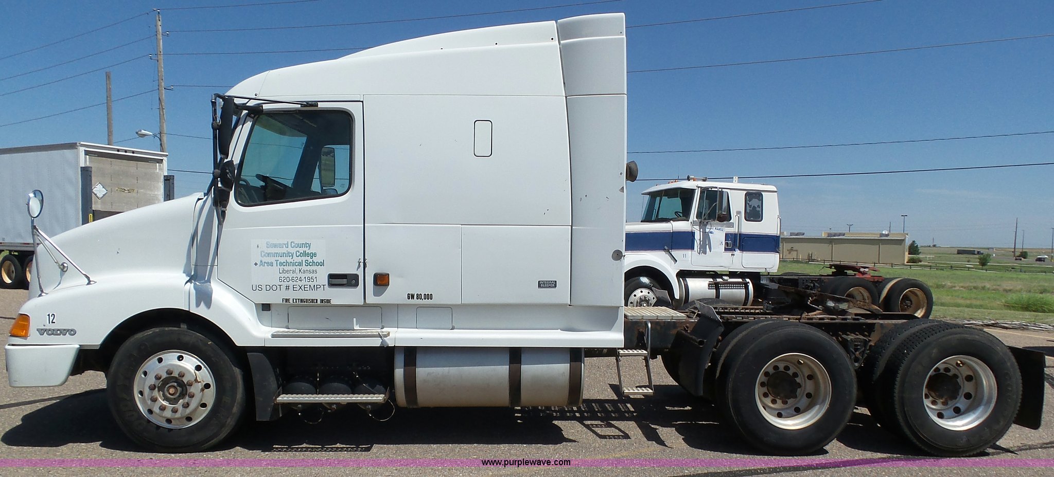 1998 Volvo S60 semi truck. 23,509 miles on odometer Actual mileage unknown, Detroit Diesel Series 60 12.7L L6 turbo diesel engine Serial 06R0410747, Rockwell manual transmission, Tandem axle, AC and heat, Cruise, AM/FM/cassette, Air suspension seat, Integral 51" sleeper Single bed, Two seats, Rear climate control, Single rear exhaust stack, Aluminum deck plate, Air operated sliding fifth wheel plate, Dual fuel tanks, Quarter fenders, Air suspension, Air brakes, 11R22.5 tires, GVWR 51,683 lbs, FAWR 12,000 lbs, IAWR 19,841 lbs, RAWR 19,841 lbs, Hail damage, Unit# 12. Kansas title. 4VG7DERH3WN762458. Seward County Community College. 2215 N Kansas Ave. Liberal, KS 67905