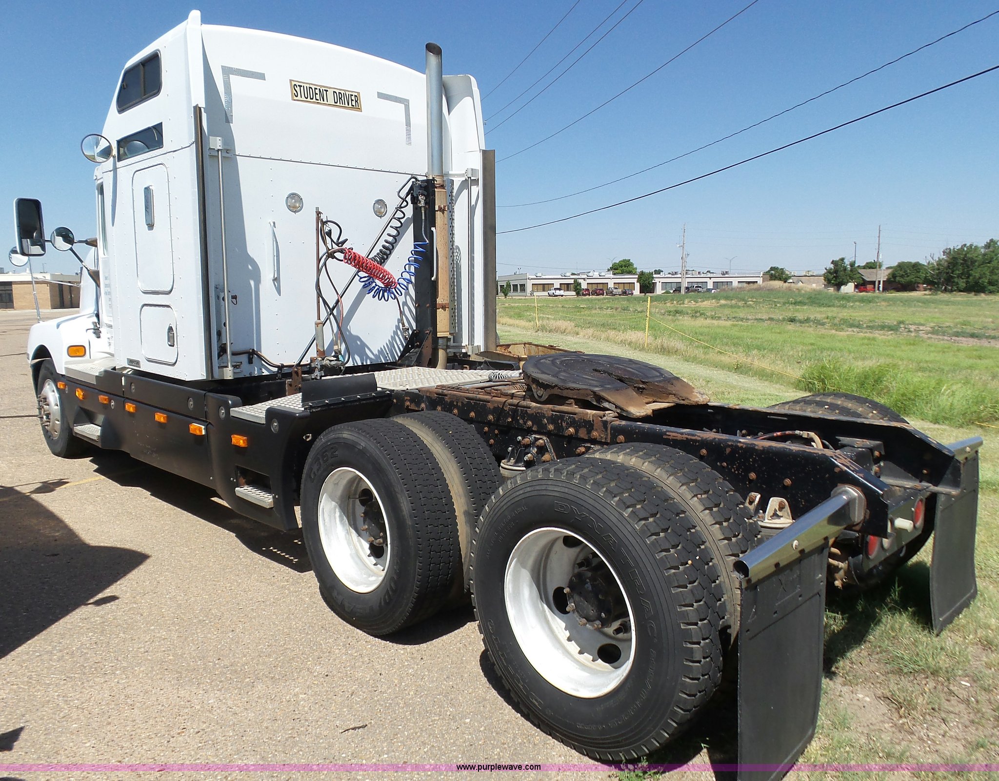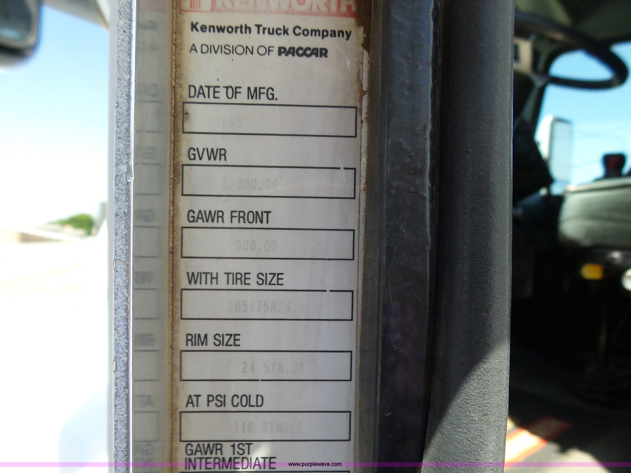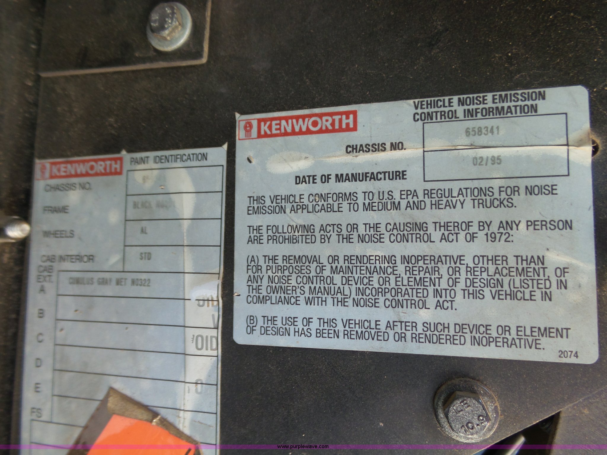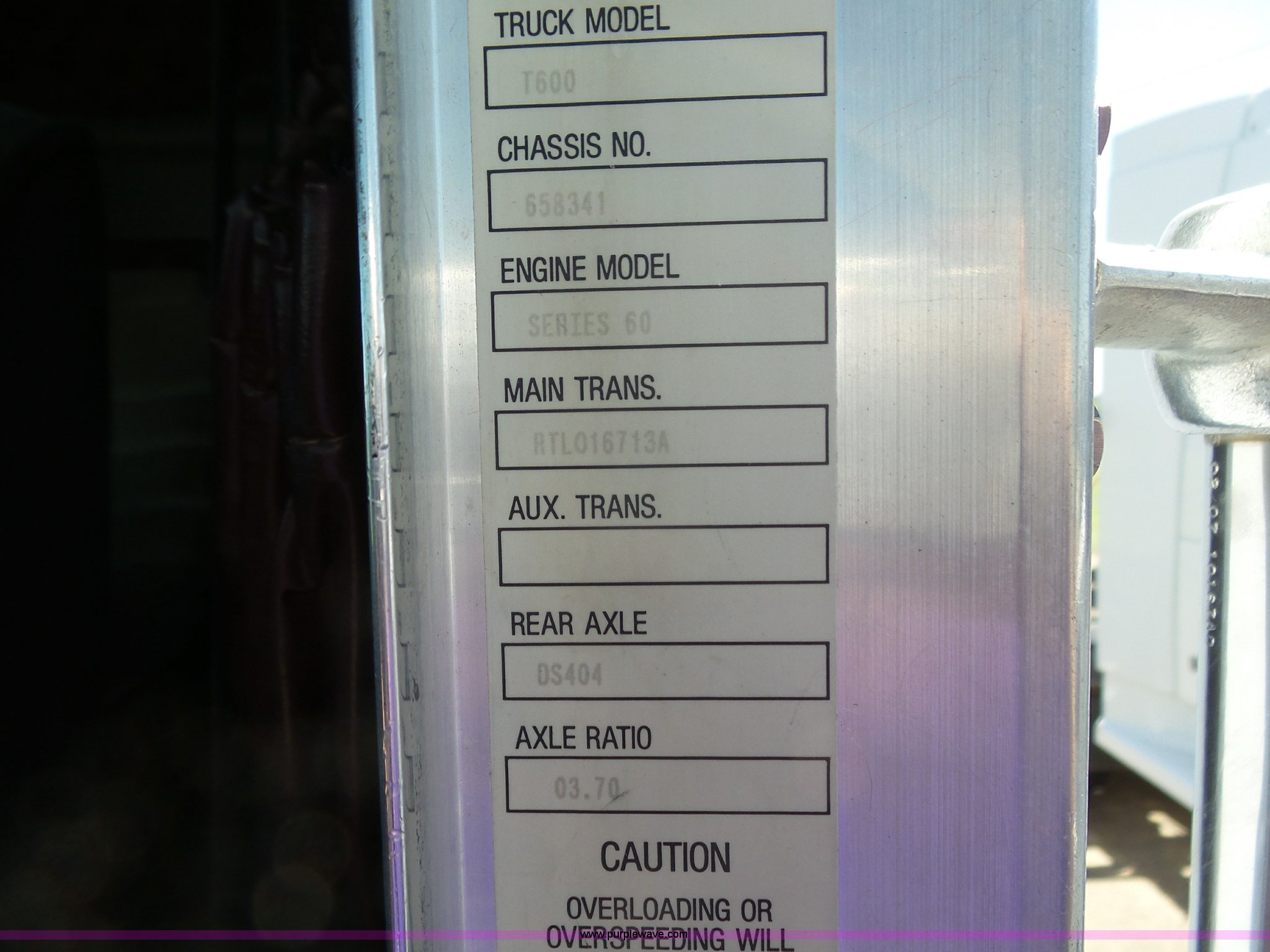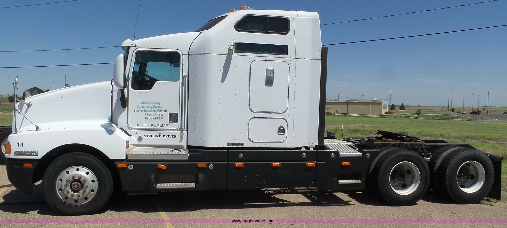 Purple Wave is selling a used Truck Tractor in Kansas. This item is a 1995 Kenworth T600 semi truck with the following: 110,517 miles on odometer, Actual mileage unknown, Detroit Diesel Series 60 12.7L L6 turbo diesel engine, Serial 06R0220761, Eight speed manual transmission, Tandem axle, Inter-axle differential lock, AC and heat, Tilt, Cruise, AM/FM/cassette, Power passenger window, Power and heated mirrors, Air suspension seat, Block heater, AeroCab sleeper, Three seats, Rear climate control, Exterior visor, Single rear exhaust stack, Aluminum deck plate, Air operated sliding fifth wheel plate, Dual fuel tanks, Quarter fenders, Mud flaps, Air suspension, Air brakes, Engine brake, 275/80R22.5 front tires, 295/75R22.5 rear tires, GVWR 50,000 lbs, IAWR 19,000 lbs, RAWR 19,000 lbs, Unit# 14
