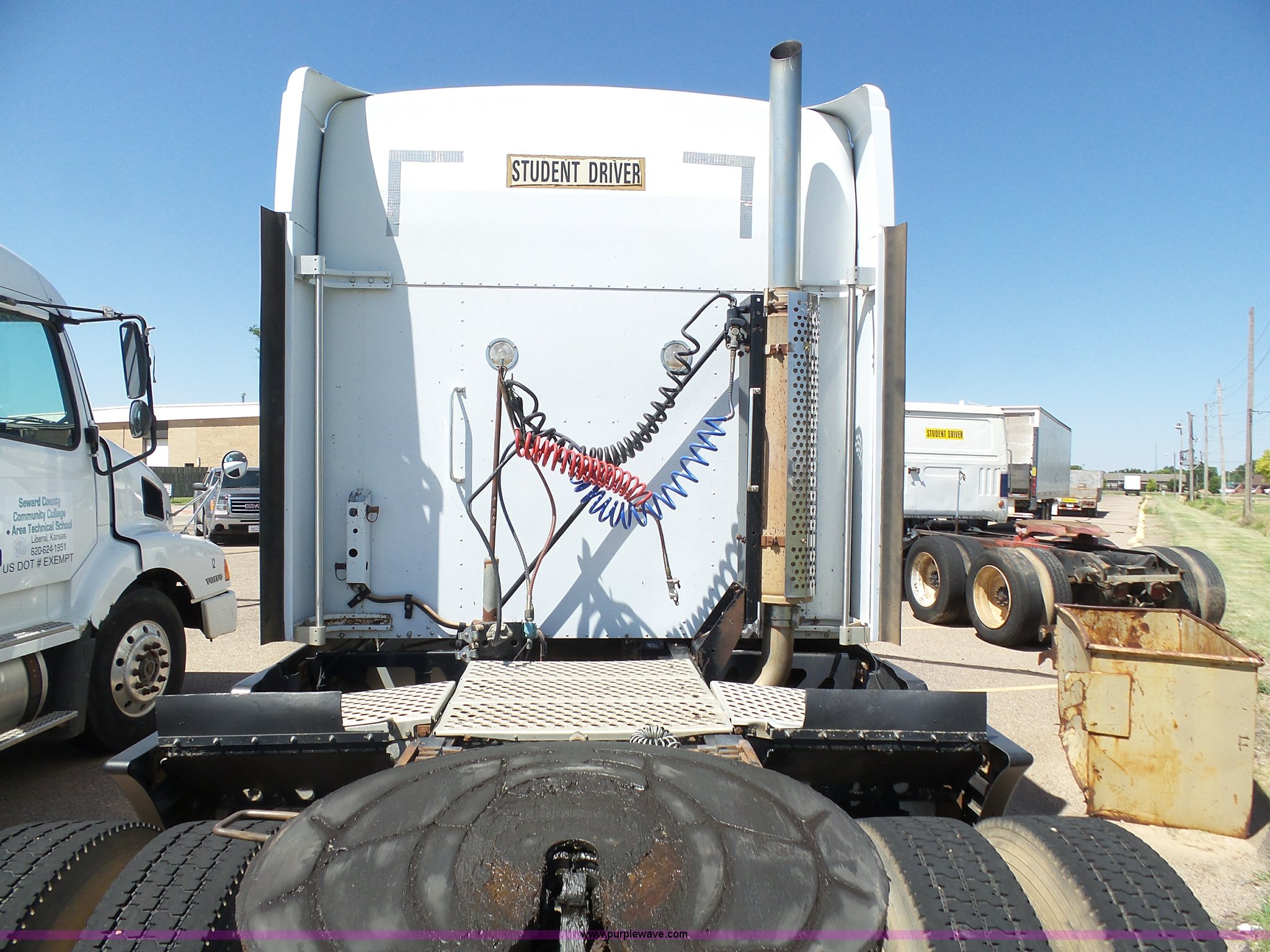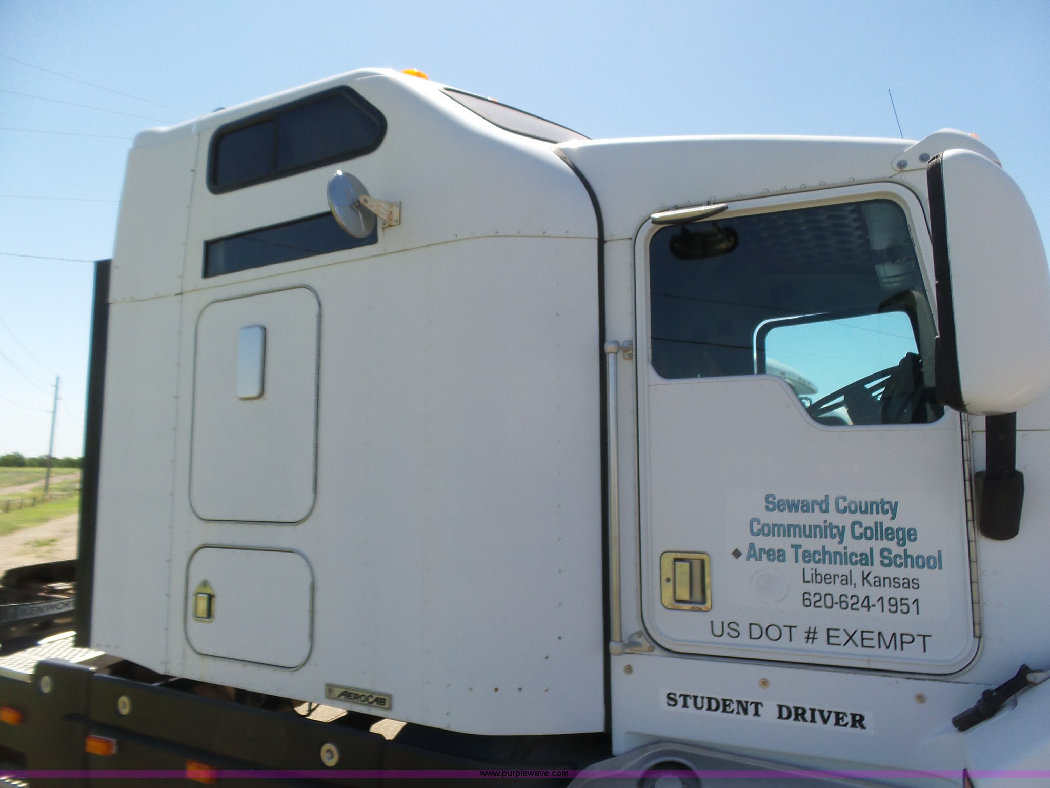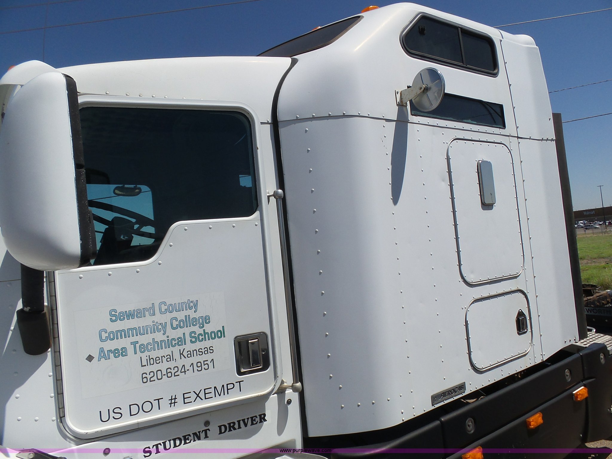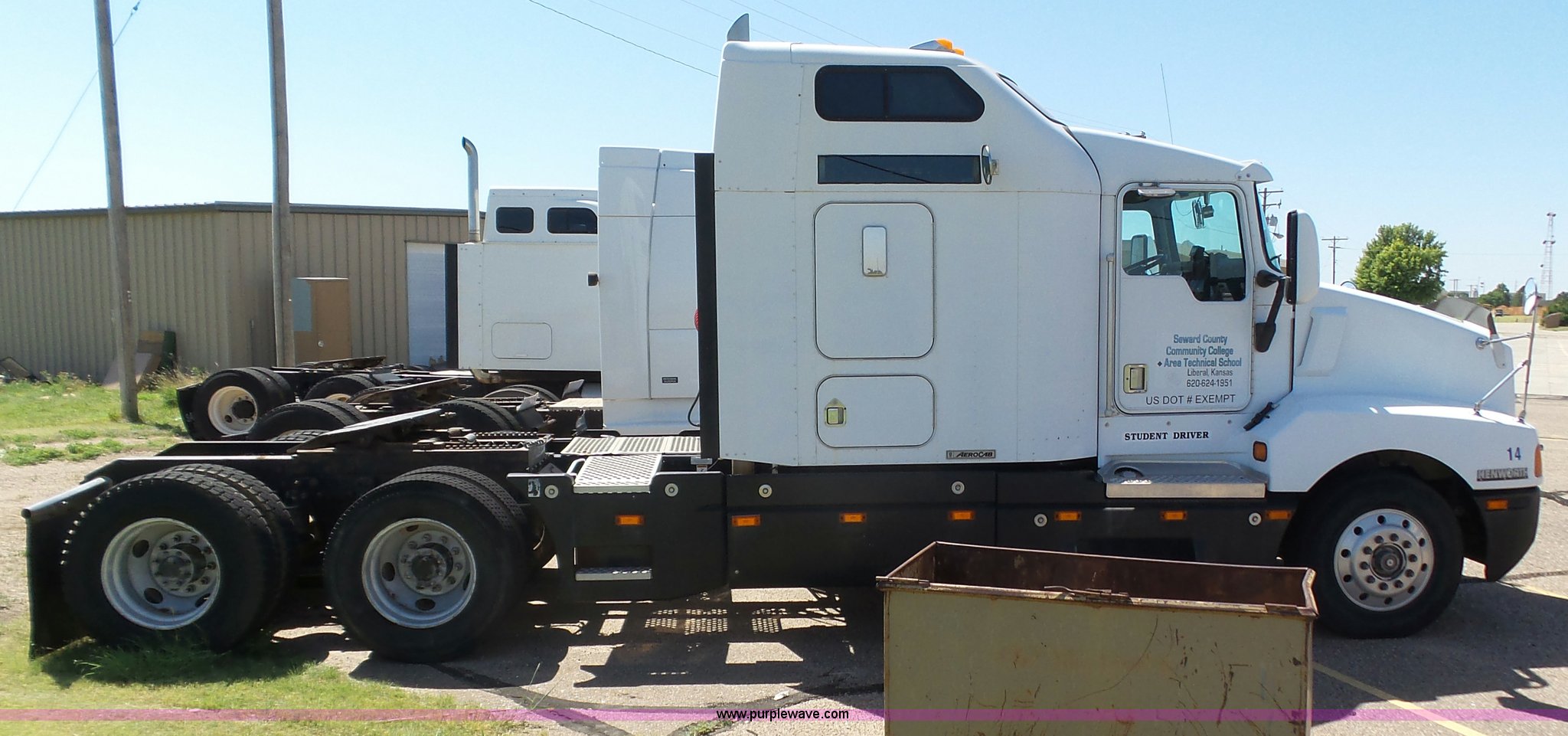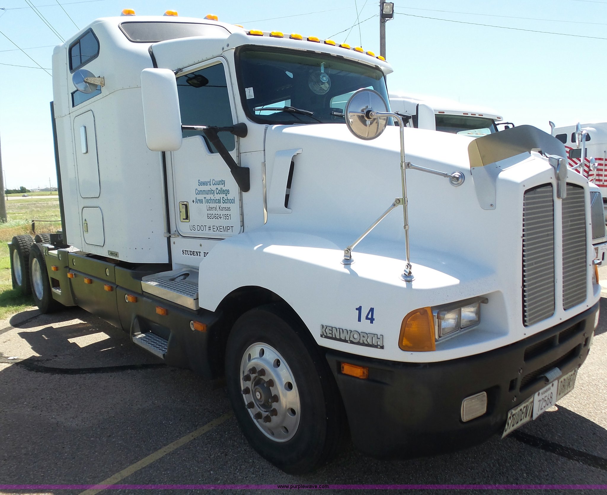 1995 Kenworth T600 semi truck. 110,517 miles on odometer Actual mileage unknown, Detroit Diesel Series 60 12.7L L6 turbo diesel engine Serial 06R0220761, Eight speed manual transmission, Tandem axle, Inter-axle differential lock, AC and heat, Tilt, Cruise, AM/FM/cassette, Power passenger window, Power and heated mirrors, Air suspension seat, Block heater, AeroCab sleeper Three seats, Rear climate control, Exterior visor, Single rear exhaust stack, Aluminum deck plate, Air operated sliding fifth wheel plate, Dual fuel tanks, Quarter fenders, Mud flaps, Air suspension, Air brakes, Engine brake, 275/80R22.5 front tires, 295/75R22.5 rear tires, GVWR 50,000 lbs, IAWR 19,000 lbs, RAWR 19,000 lbs, Unit# 14. Kansas title. 1XKADR9X4SR658341. Seward County Community College. 2215 N Kansas Ave. Liberal, KS 67905