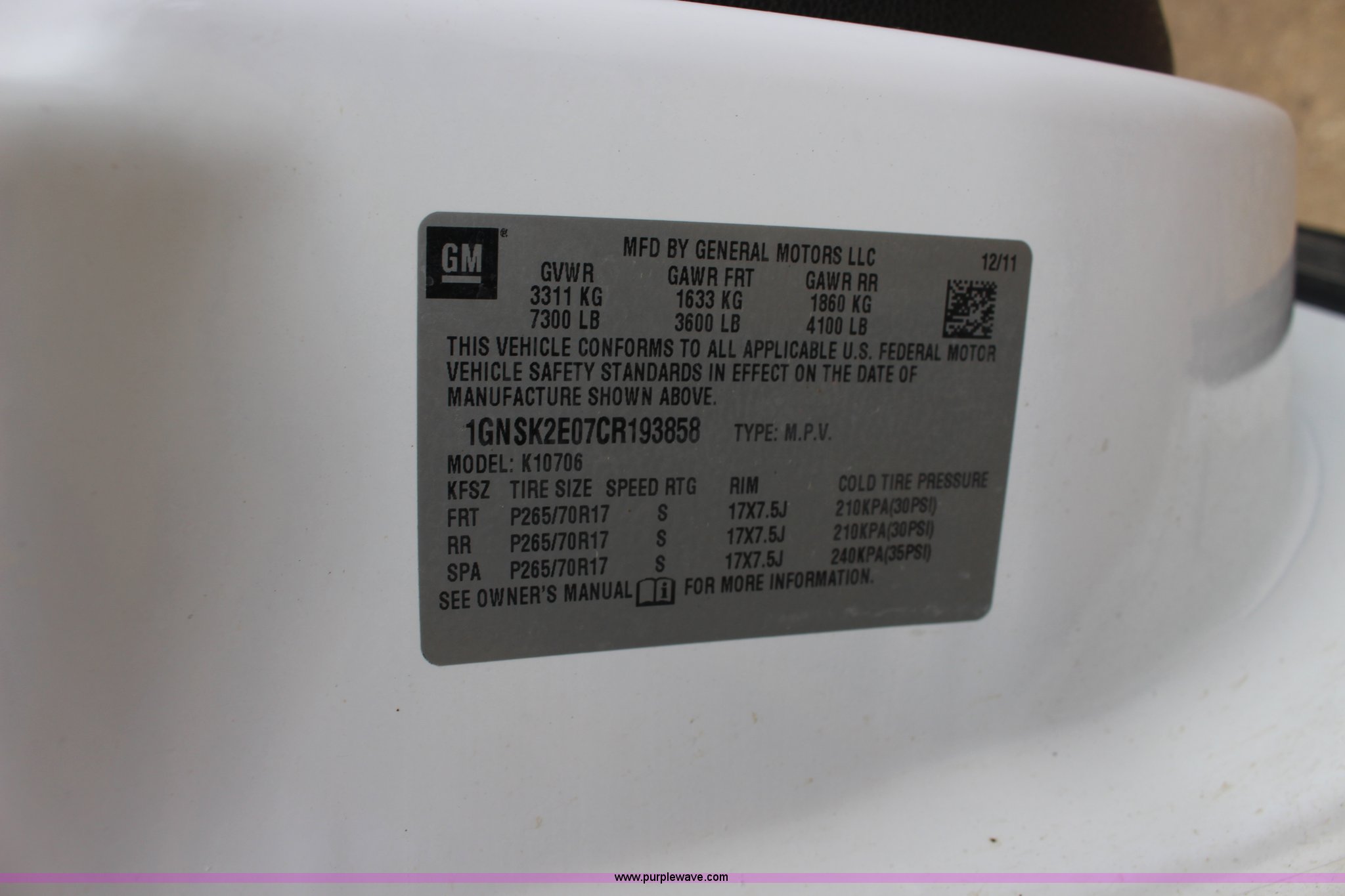 Purple Wave is selling a used Passenger Vehicle in Kansas. This item is a 2012 Chevrolet Tahoe Police SUV with the following: 153,075 miles on odometer, 5.3L V8 OHV 16V FFV gas engine, Automatic transmission, Four wheel drive, AC and heat, Tilt, Cruise, AM/FM/CD, Power windows, locks, and mirrors, Cloth/vinyl interior, 265/70R17 tires, Previously used as a K-9 unit