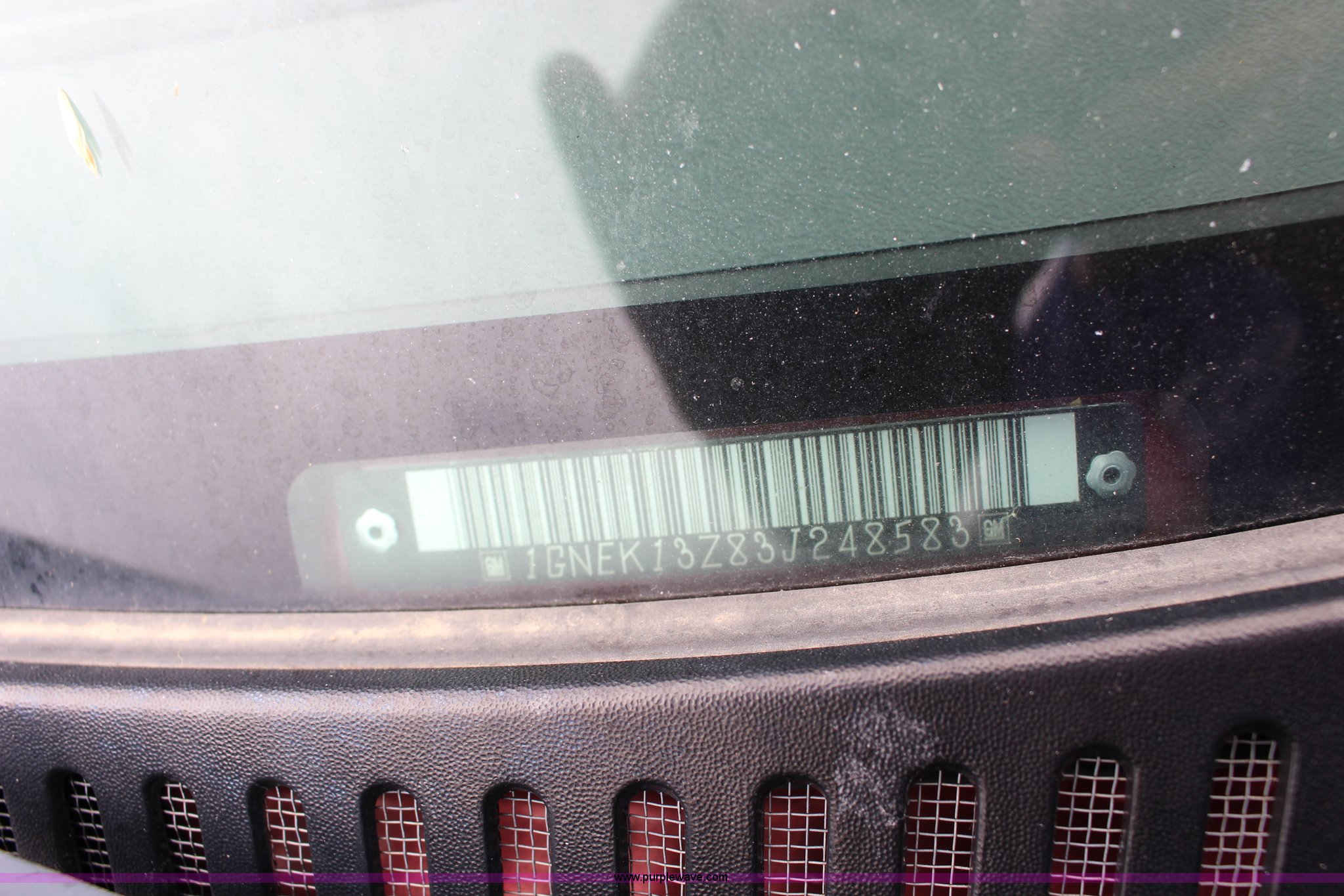 2003 Chevrolet Tahoe SUV. 124,622 miles on odometer, 5.3L V8 OHV 16V FFV gas engine, Automatic transmission, AC and heat, Tilt, Cruise, Power windows, locks, mirrors, and seat, Cloth interior, 245/75R16 tires. Kansas title. 1GNEK13Z83J248583. Dickinson County Sheriff. Abilene, KS 67410