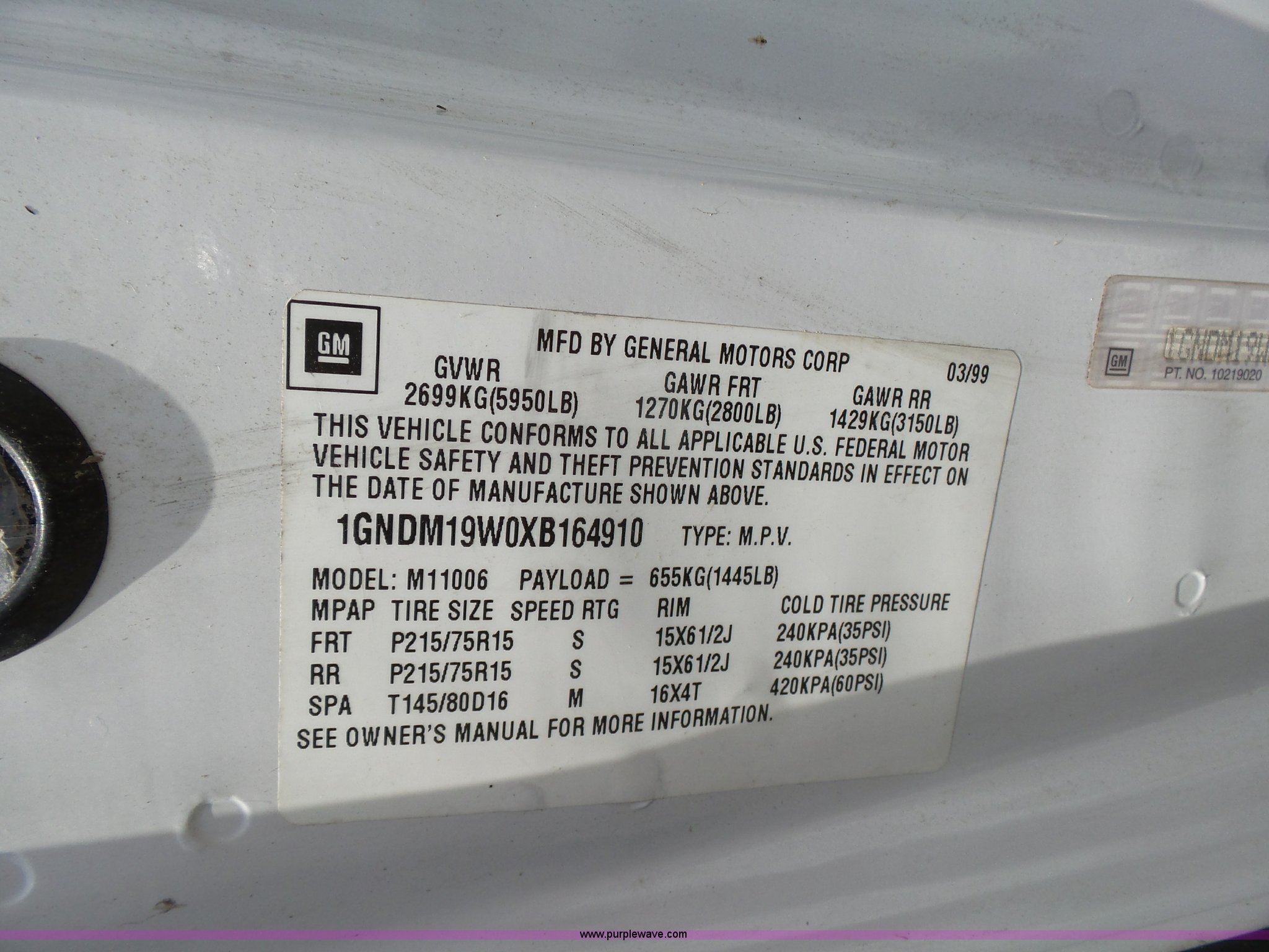 Purple Wave is selling a used Passenger Vehicle in Kansas. This item is a 1999 Chevrolet Astro van with the following: 112,521 miles on odometer, 4.3L V6 OHV 12V gas engine, Automatic transmission, AC and heat, Tilt, Cruise, AM/FM/cassette, Power windows, locks, and mirrors, Cloth interior, 215/75R15 tires