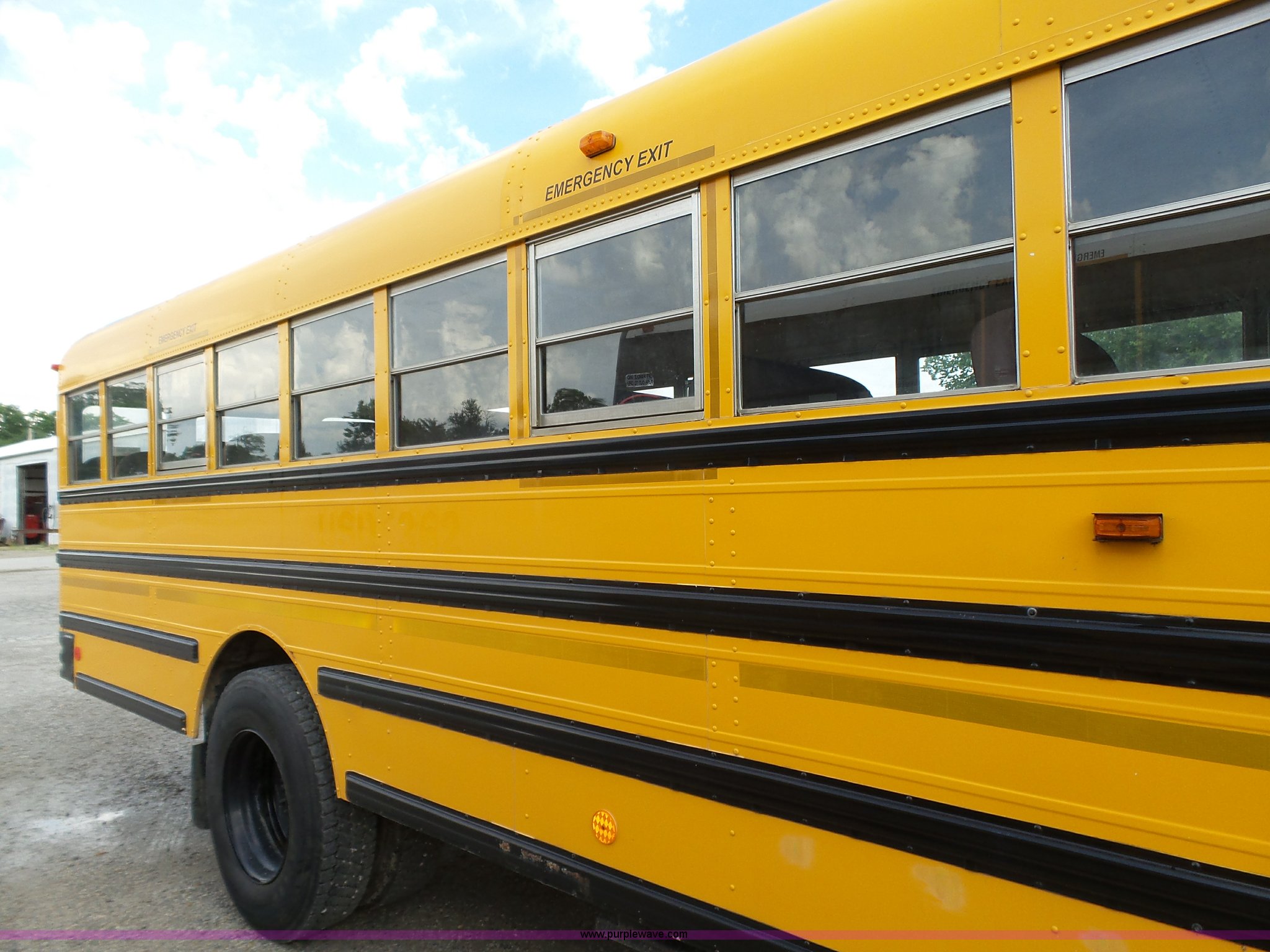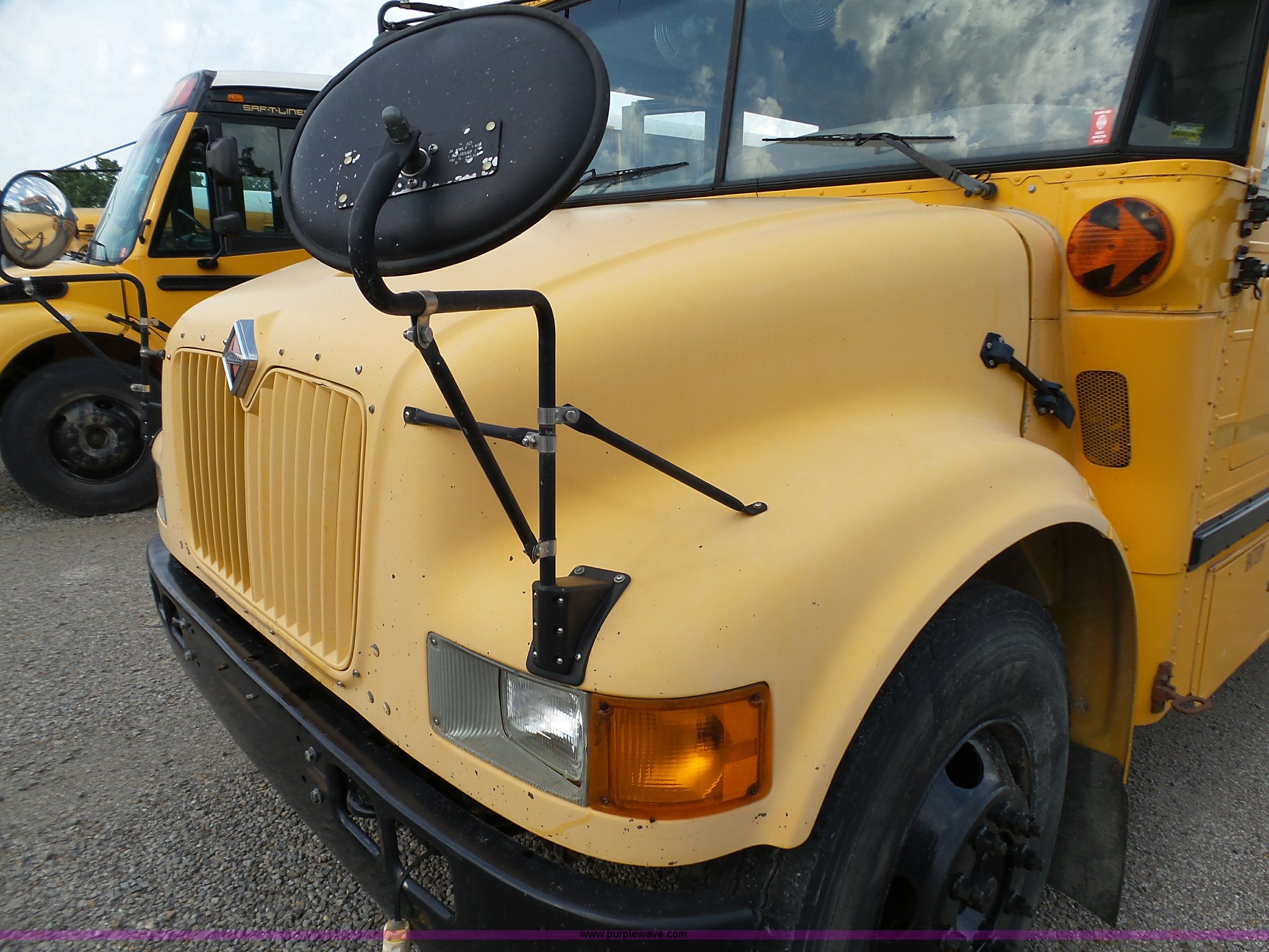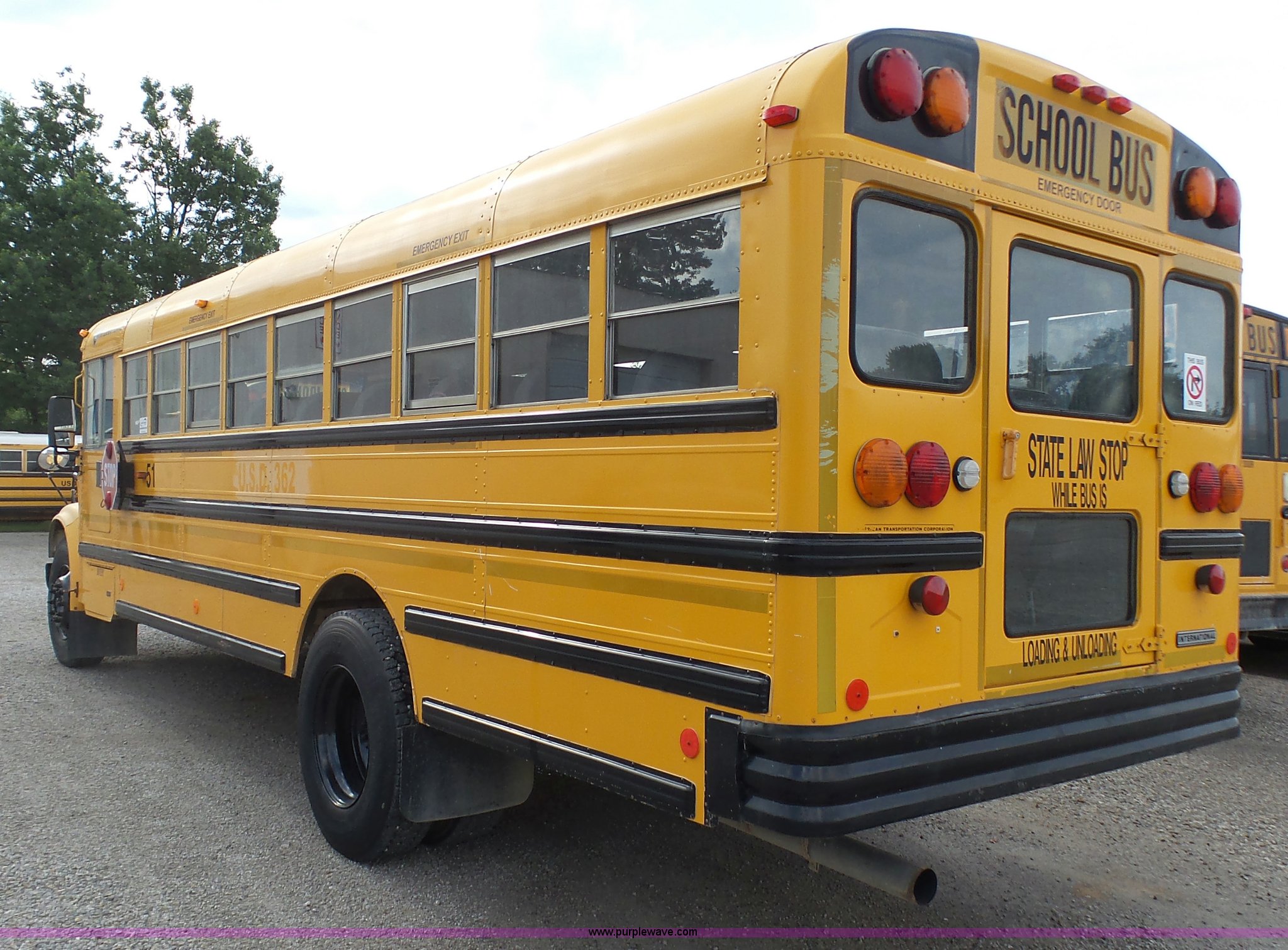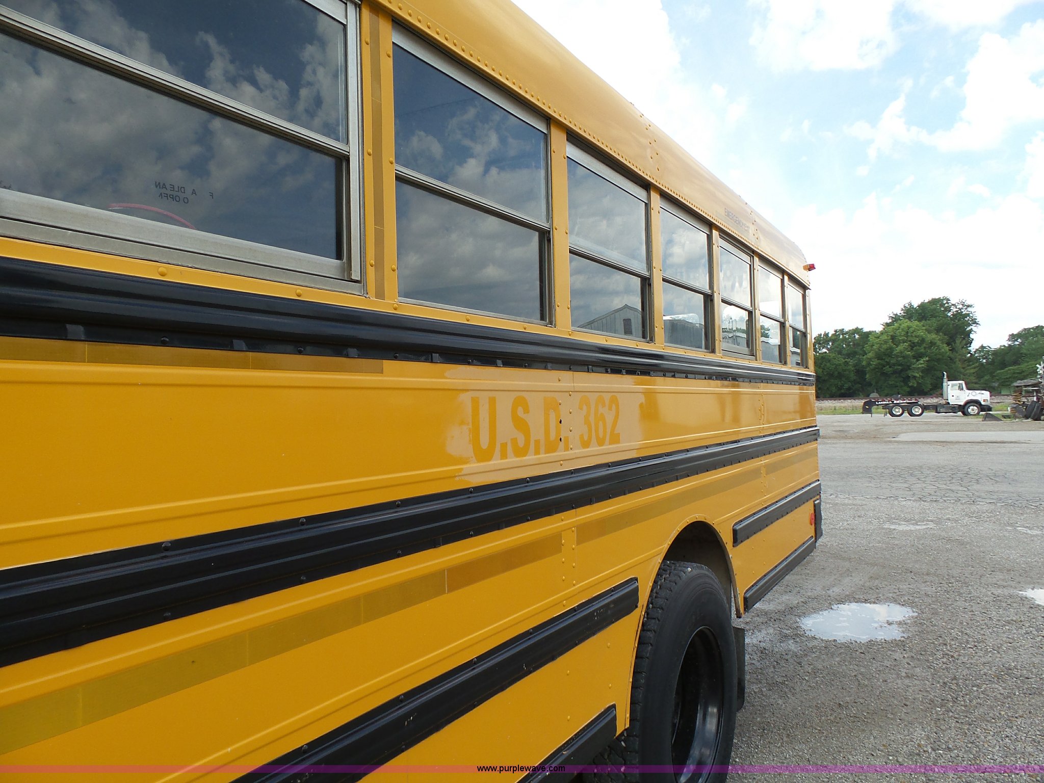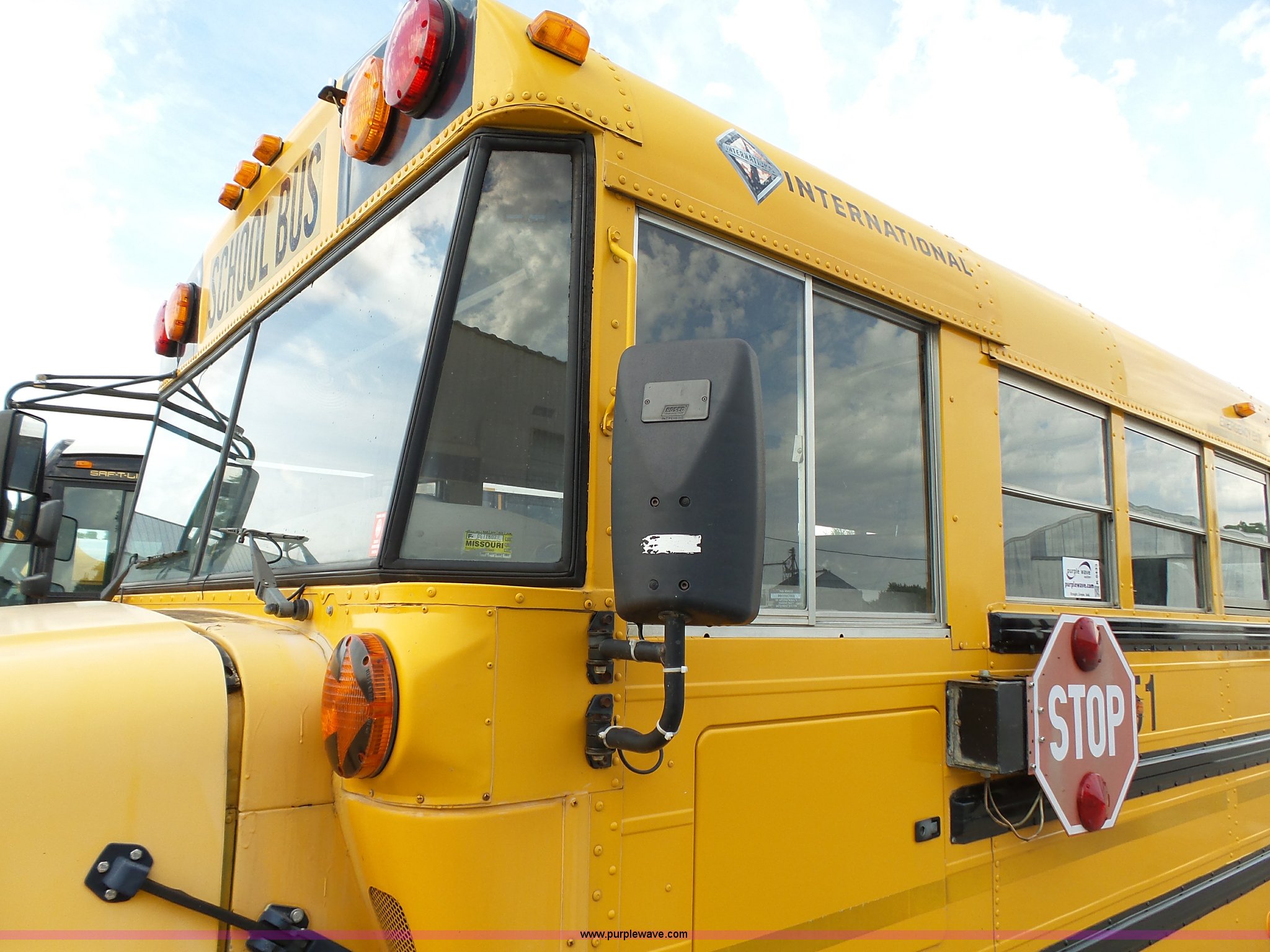 Purple Wave is selling a used Bus in Kansas. This item is a 2002 International 3800 school bus with the following: 162,782 miles on odometer, 7,246 hours on meter, International T444E 7.3L V8 turbo diesel engine, Automatic transmission, Single axle, Heat, Suspension seat, 53 passenger capacity, Ceiling, rear, and side emergency egress, Stop sign, Hydraulic brakes, 11R22.5 tires