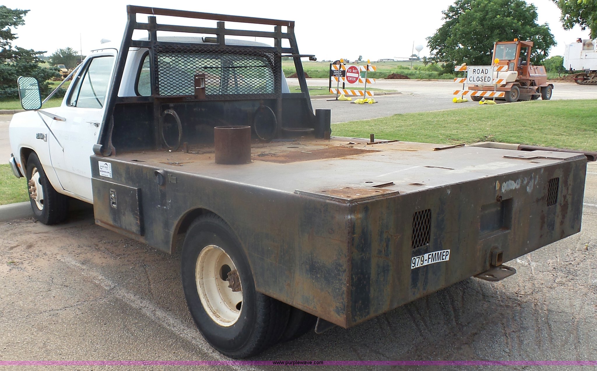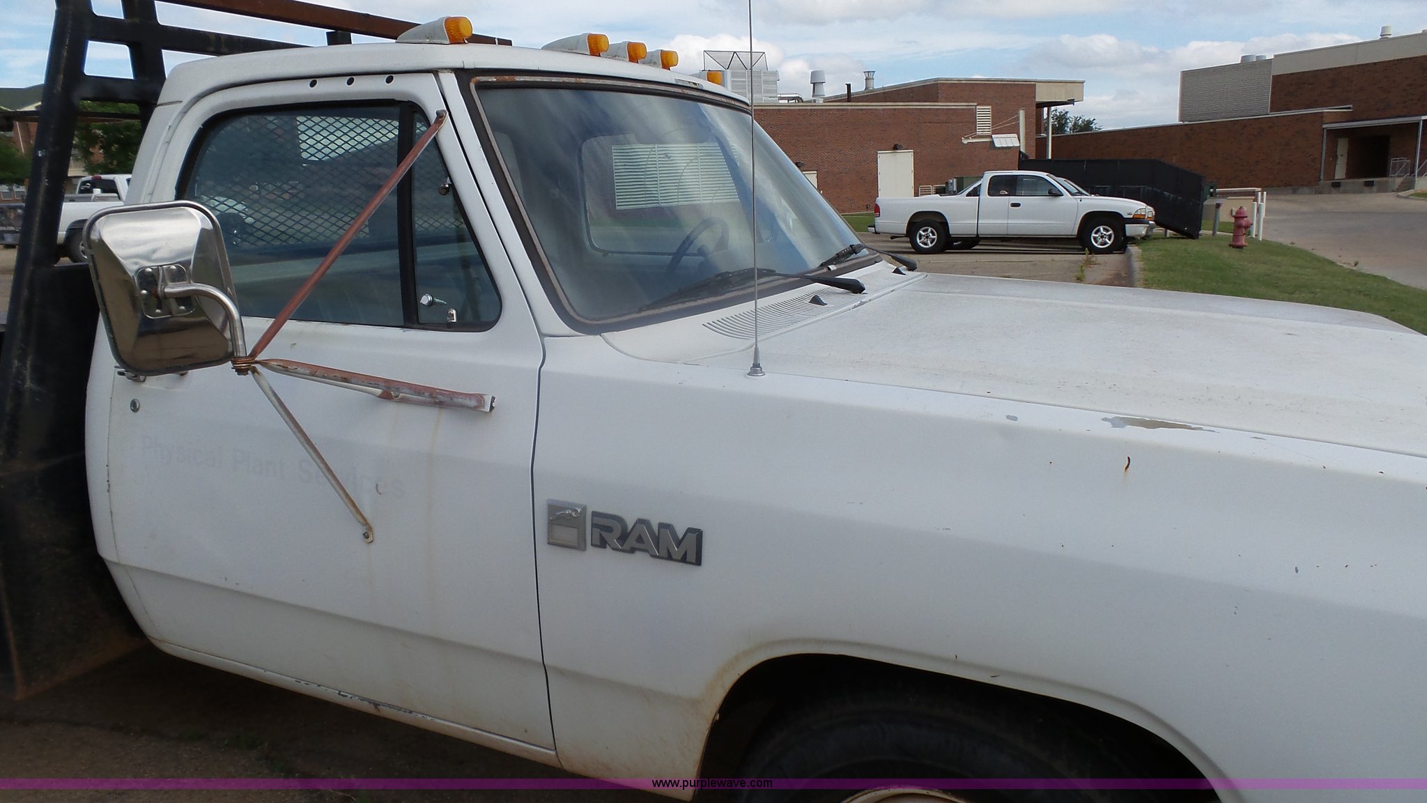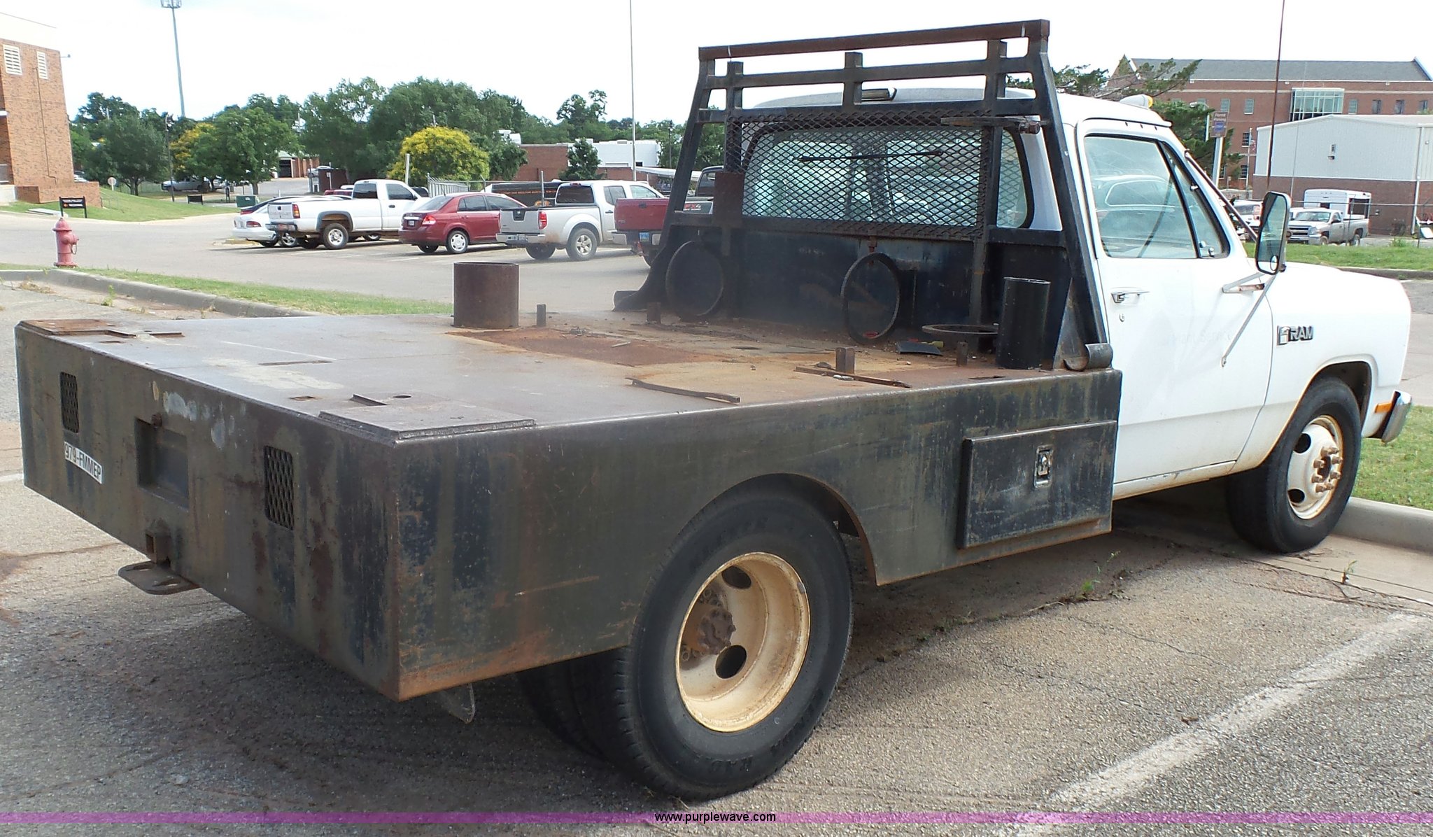 Purple Wave is selling a used 3/4 or 1 Ton Pickup or Van in Oklahoma. This item is a 1988 Dodge D350 flatbed pickup truck with the following: 68,537 miles on odometer, 5.9L V8 gas engine, Automatic transmission, AC and heat, AM/FM/CD, Manual windows and locks, Vinyl interior, 8'L x 89"W flatbed, 235/85R16 tires, Sale# 1702KP, Unit# 979