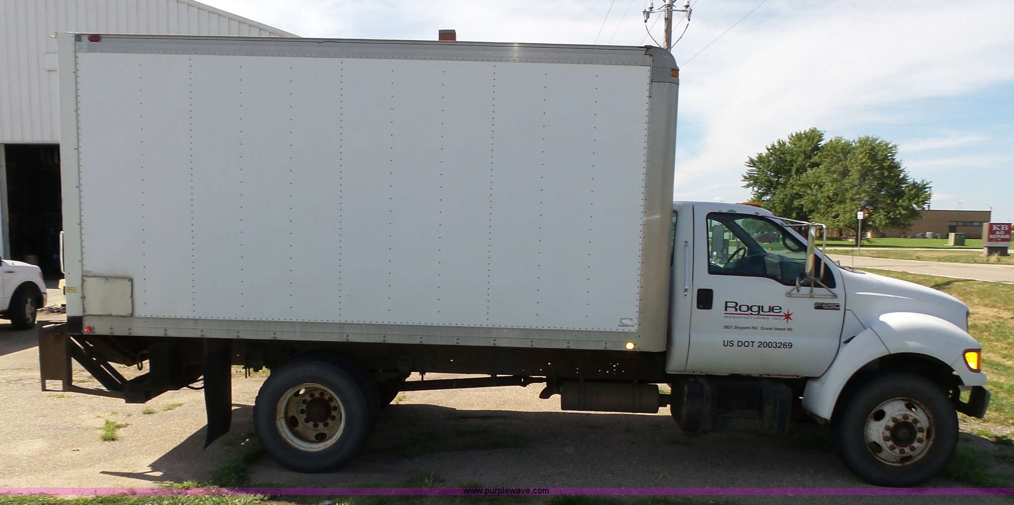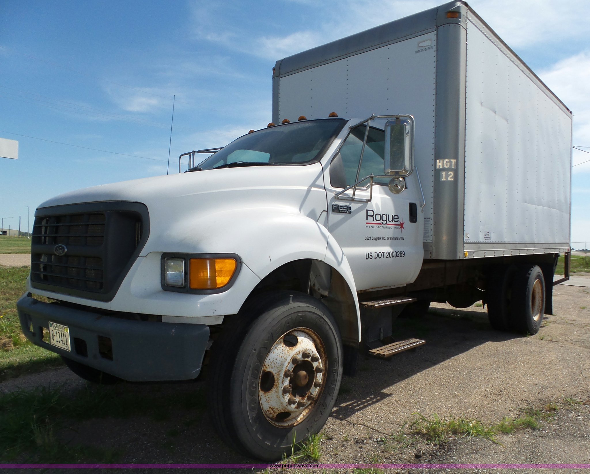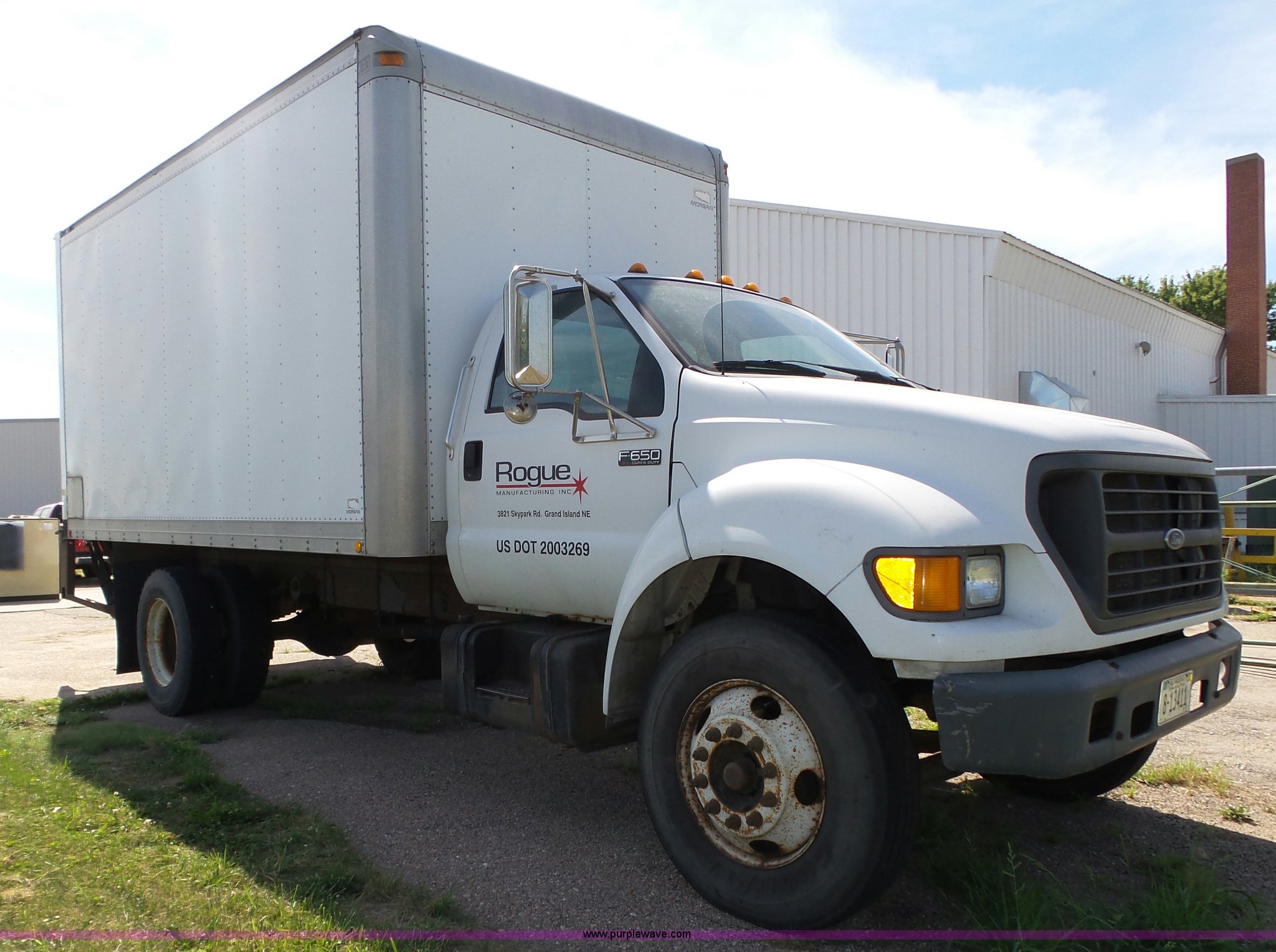 2000 Ford F650 XL box truck. 72,244 miles on odometer, Caterpillar 3126B 7.2L six cylinder turbo diesel engine, Automatic transmission, Single axle, AC and heat, AM/FM/cassette, Manual windows, locks, and mirrors, Suspension seat, Vinyl seat, Front tow hooks, Morgan GVSD09116096 box bed 16'L x 92"W I.D., 92.5"H I.D., Wood deck, Roll up rear door, Rear hydraulic lift gate, Serial MPE00EP02109-001, Single fuel tank, Spring suspension, Goodyear 10R22.5 tires, GVWR 26,000 lbs, Operations manual, Contents not included, Annual inspection has expired, Possible brake issues, front brakes may need to be replaced, AC non-operational. Nebraska title.. Title has a lien that will be released following the close of the auction. Title distribution may be delayed up to 30 days from verification of funds. 3FDNF6521YMA49293. Rogue Manufacturing Inc.. 3821 Skypark Rd. Grand Island, NE 68801