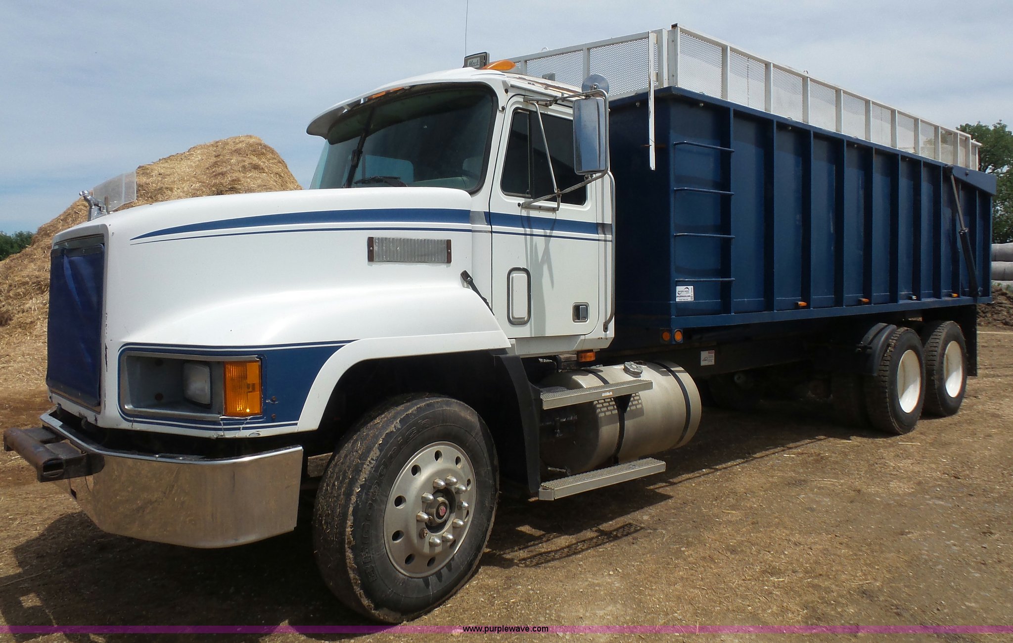 Purple Wave is selling a used Grain Truck in Kansas. This item is a 1991 Mack CH613 silage/grain truck with the following: 150,304 miles on odometer, Actual mileage unknown, Mack E7 12.0L L6 turbo diesel engine, 350 HP, Eaton Fuller nine speed manual transmission, Tandem axle, AC and heat, Tilt, Telescoping steering wheel, AM/FM/CD, Air suspension seat, PTO, 22'L x 96"W steel grain bed, 60" side height, 16" left side extension, 24" right side extension, Rollover tarp, Dual ram hoist, Hydraulic end gate, Grain doors in end gate, Dual fuel tanks, Air suspension, Air brakes, 11R24.5 tires