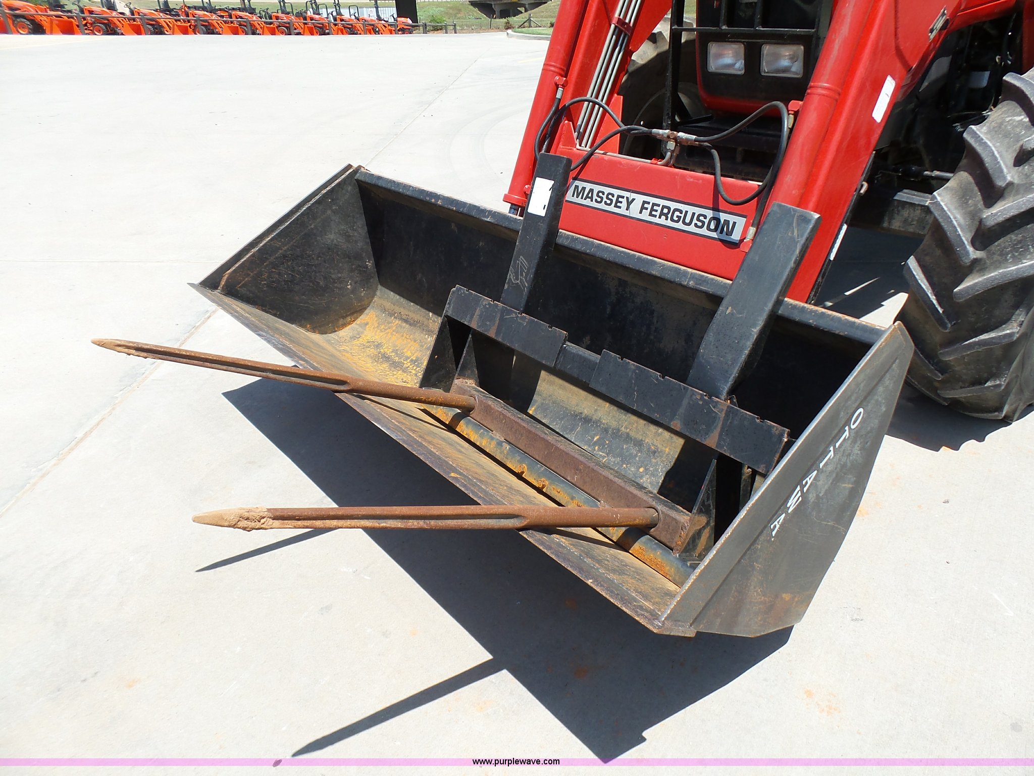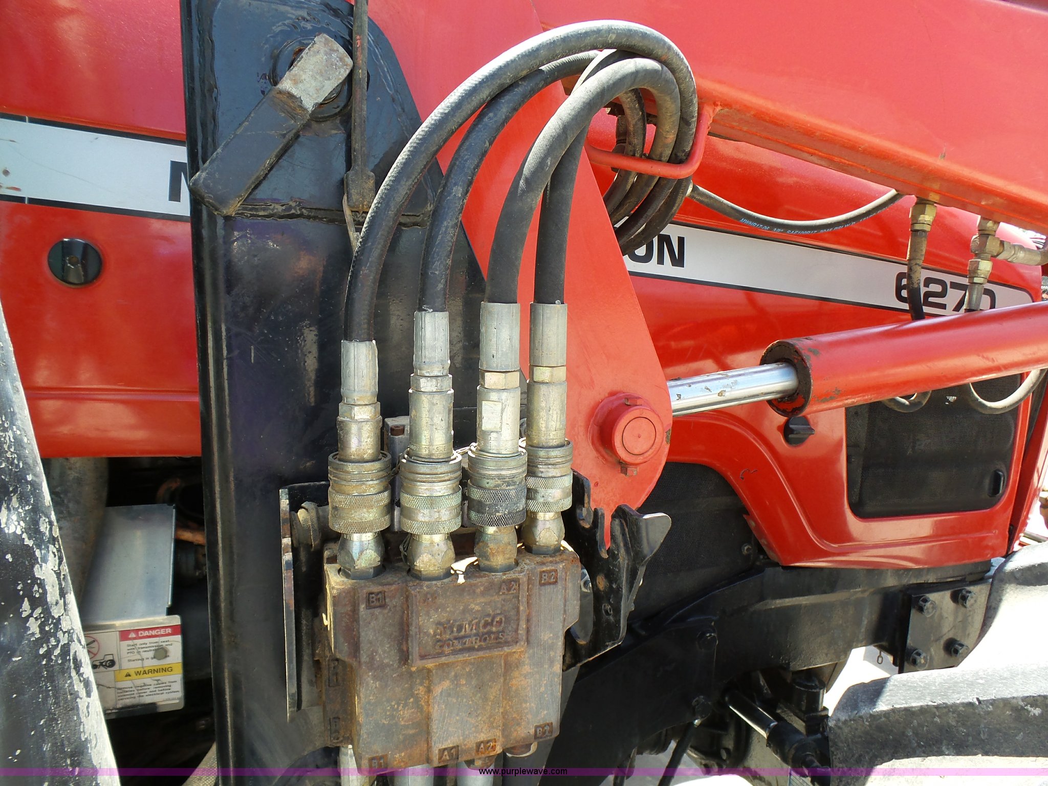 Purple Wave is selling a used Tractor in Oklahoma. This item is a 2000 Massey-Ferguson 6270 MFWD tractor with the following: 1,643 hours on meter, Perkins 6.0L six cylinder turbo diesel engine, 100 HP, Powershift transmission, 4F-4R gears, AC and heat, Tilt steering wheel, AM/FM, Suspension seat, Instructor's seat, Massey-Ferguson MF1048 loader, 85"W bucket, Bale spear, Three point, 540/1000 PTO, Rear hydraulic remote sets, 106" wheelbase, 14.9R28 front tires, 18.4R38 rear tires, Serial J123012