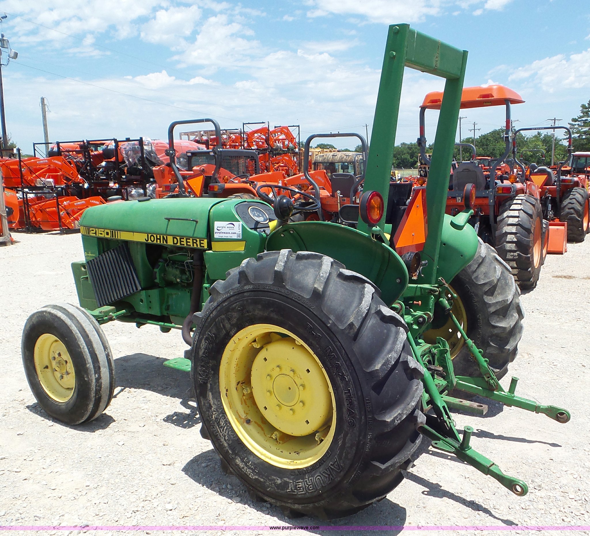Purple Wave is selling a used Tractor in Oklahoma. This item is a 1983 John Deere 2150 tractor with the following: 5,701 hours on meter, John Deere 2.9L three cylinder diesel engine, 45 HP, Partial synchro transmission, 8F-4R gears, Roll bar, Suspension seat, Three point, 540 PTO, (3) suitcase weights, 75" wheelbase, 7.50-16 front tires, 14.9-24 rear tires, Weak clutch, Serial L02150G496592