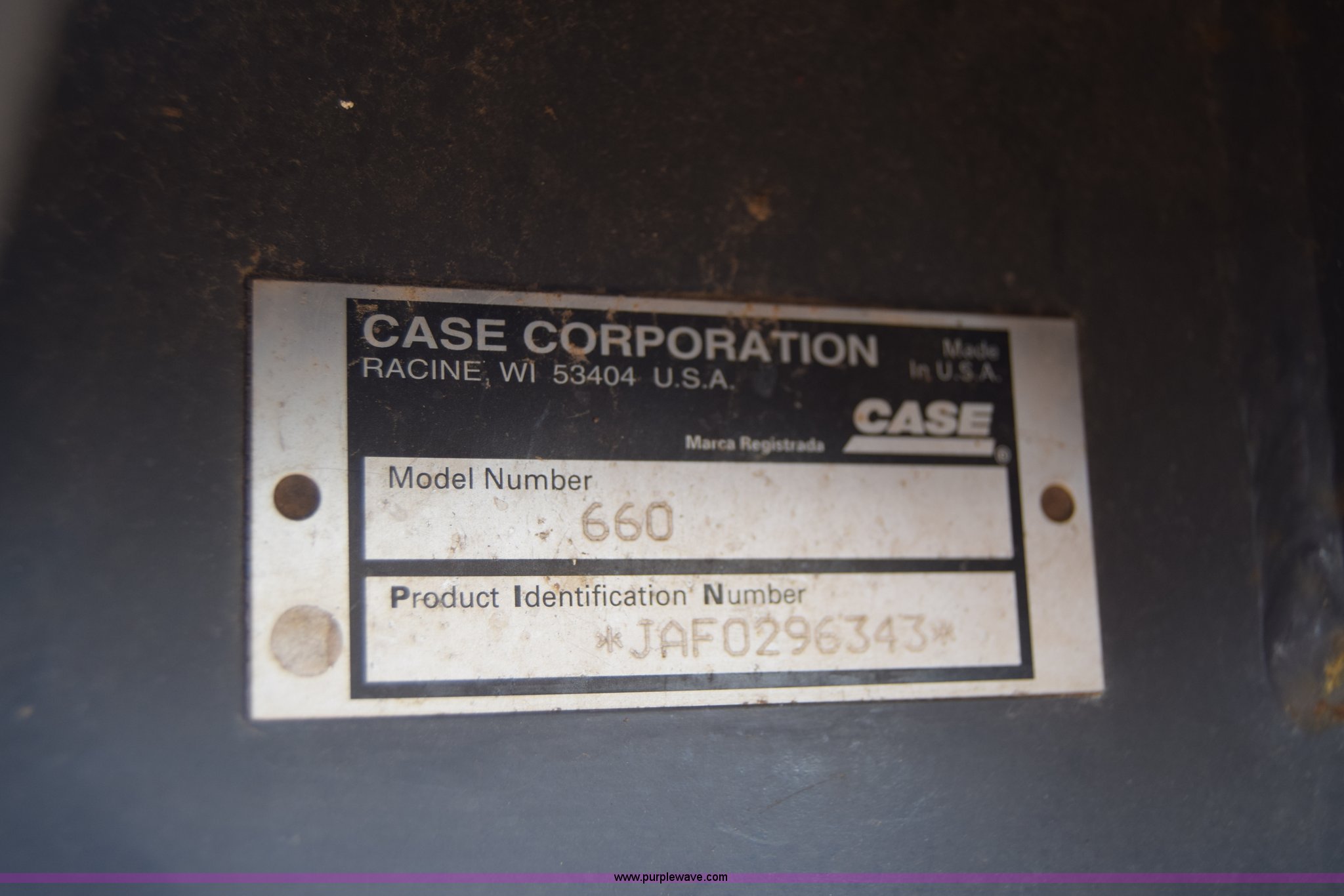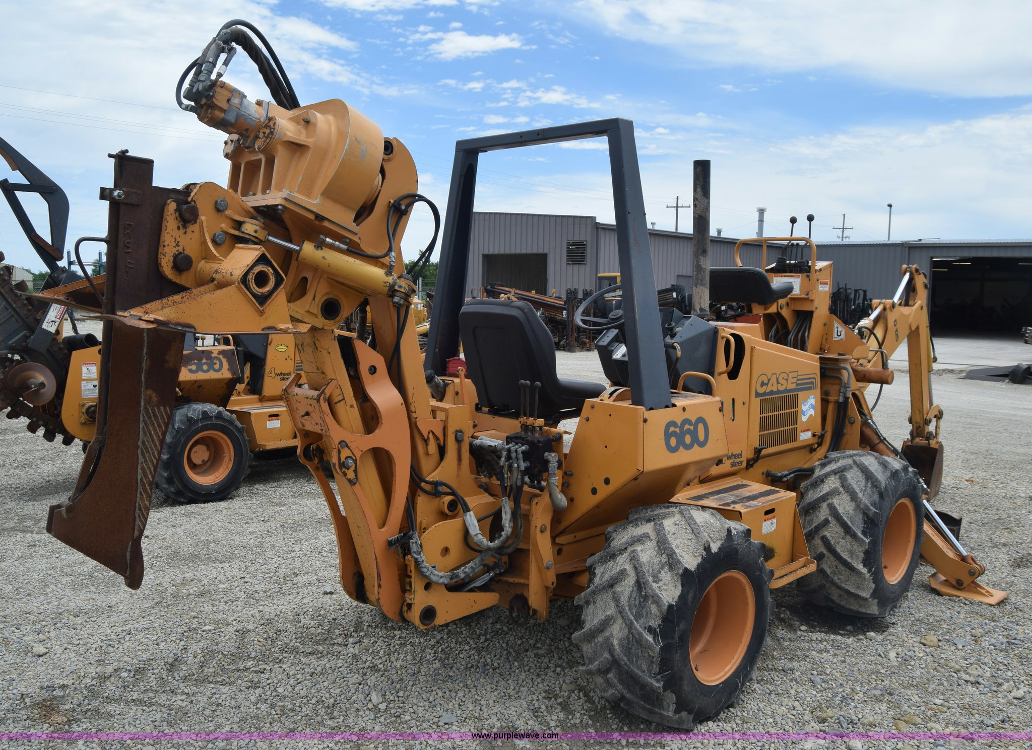 Purple Wave is selling a used Cable Plow in Kansas. This item is a 1999 Case 660 cable plow with the following: 3,174 hours on meter, Case 4-390 four cylinder diesel engine, Hydrostatic transmission, Four wheel drive, Four wheel steering, Rear steering, OROPS, 72"W six way back fill blade, Backhoe model D125, 45" stick length, 12"W bucket, (3) teeth, Serial JAF0218761, Hydraulic outriggers, Case 860 vibratory plow, 36" maximum digging depth, Hydraulic swing, Hydraulic lift, Serial JAF0258263, 35 x 19.00-16.1 tires, 9,073 lbs. base operating weight, Serial JAF0296343