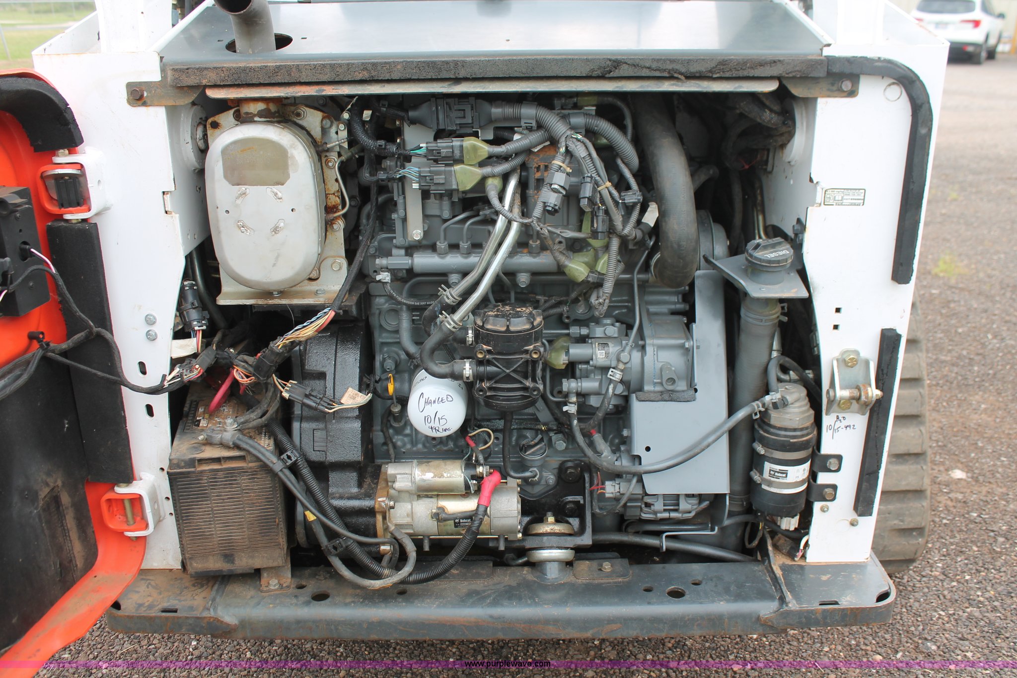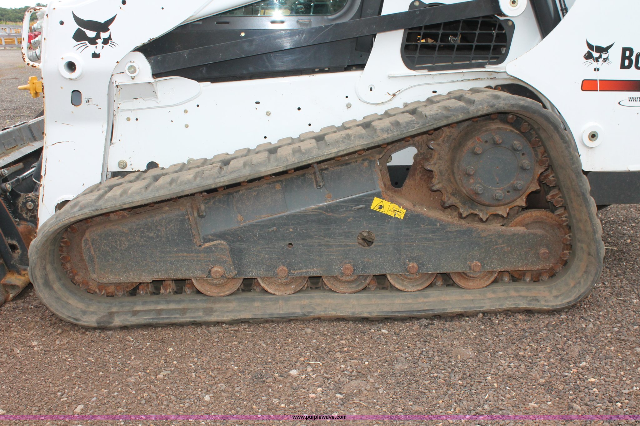 Purple Wave is selling a used Tracked Skid Steer Loader in Oklahoma. This item is a 2013 Bobcat T750 skid steer with the following: Kubota V3800T 3.8L four cylinder turbo diesel engine, 95 peak HP, 83 net HP, Serial 2DC4020, Two speed hydrostatic transmission, Enclosed cab, AC and heat, AM/FM, Joystick controls, ISO/H pattern changer, Spring suspension seat, Wipers, Front and rear work lights, Backup alarm, 84"W bucket, Bolt-on cutting edge, Self leveling bucket, Power Bobtach quick coupler, High Flow auxiliary hydraulics, Auxiliary electrical outlet, R/C ready, 3,325 lbs operating weight, 17.5"W tracks, 10,327 lbs. base operating weight, Serial ATF612697